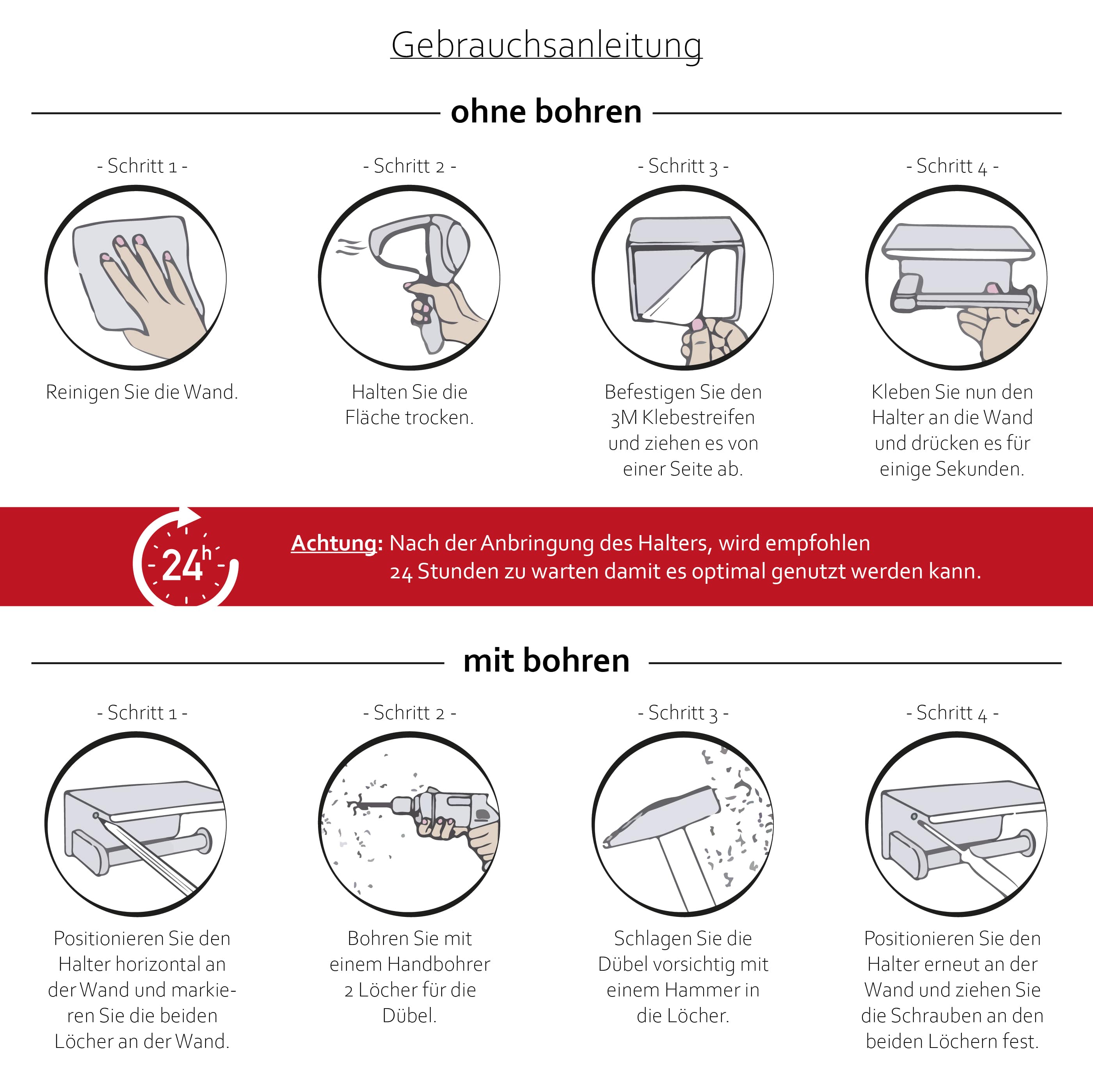 Fast alle unsere Produkte lassen sich innerhalb von Sekunden, dank 3M Klebebänder anbringen. Egal ob Duschablage oder Toilettenpapierhalter - einfach und bombenfest.