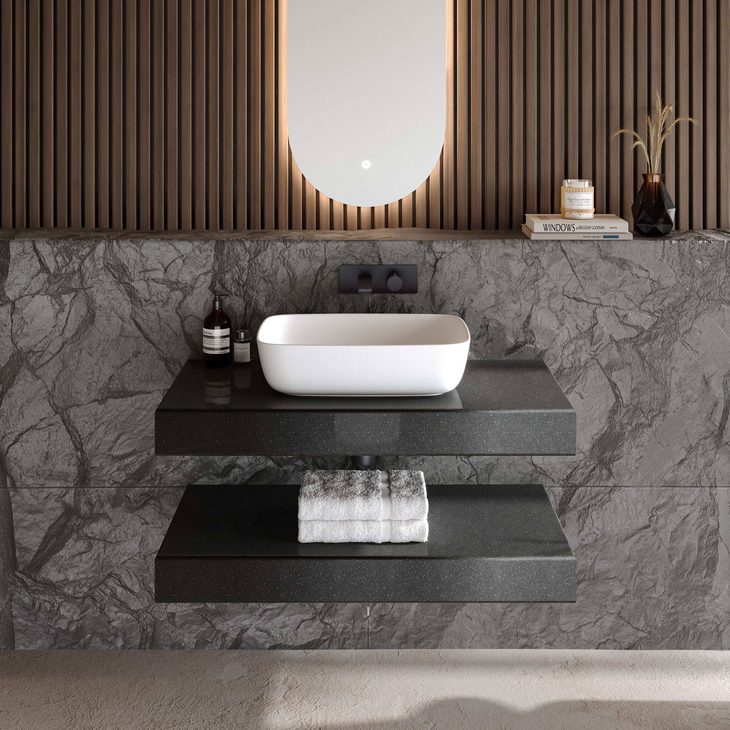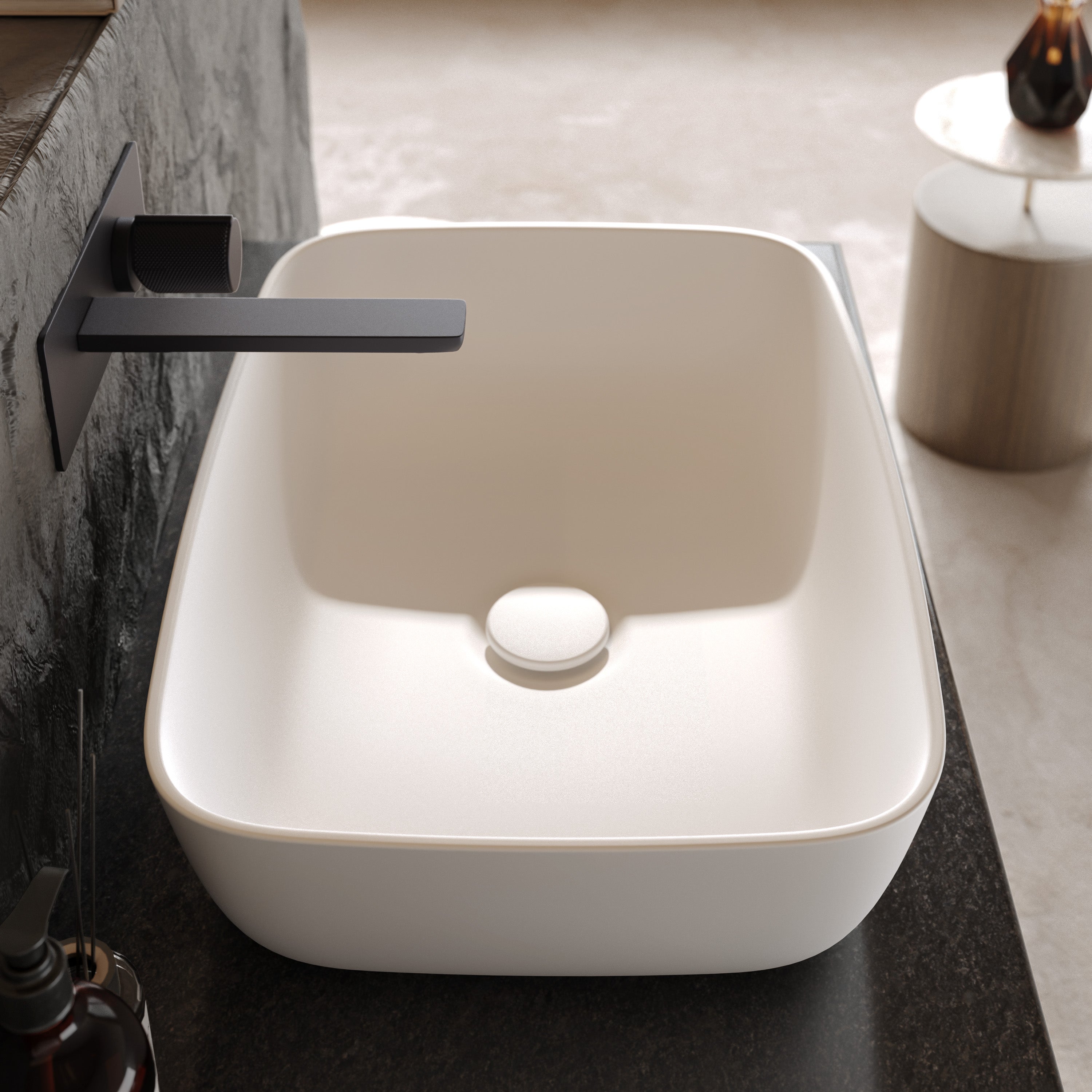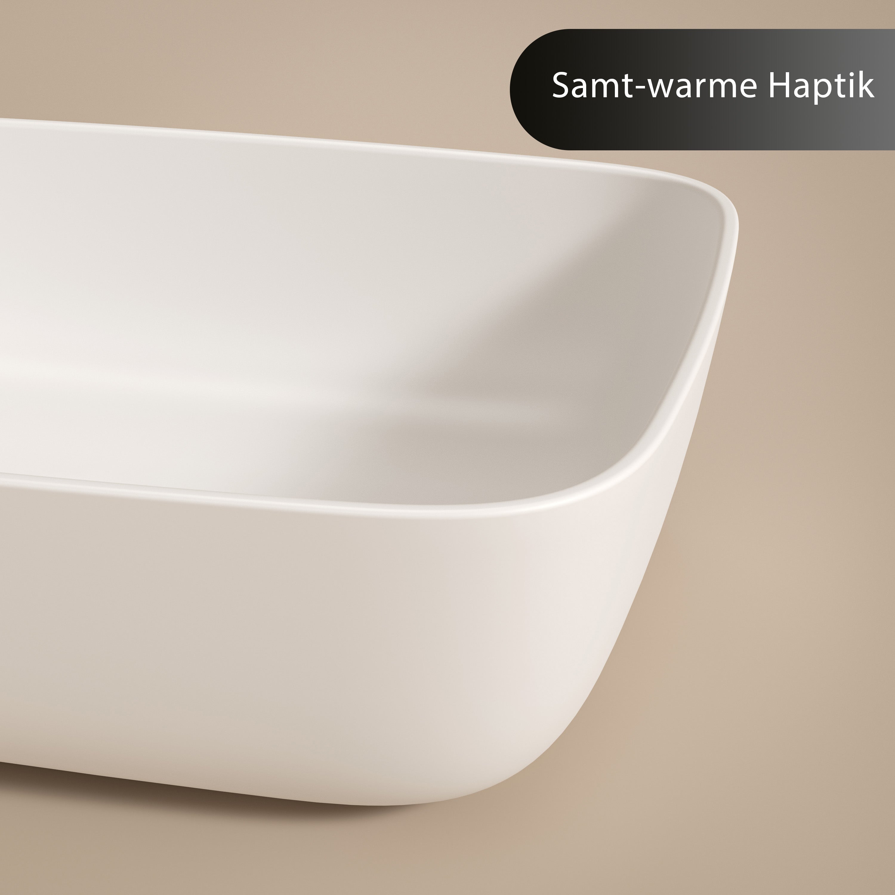 Der massive Mineralwerkstoff überzeugt nicht nur optisch, sondern auch durch eine seidig-warme Haptik, die dem Waschtisch eine spürbare Wertigkeit verleiht. Dank der porenfreien, samtmatten Oberfläche ist das Waschbecken besonders pflegeleicht und bewahrt auch bei intensiver täglicher Nutzung seine makellose Ästhetik.