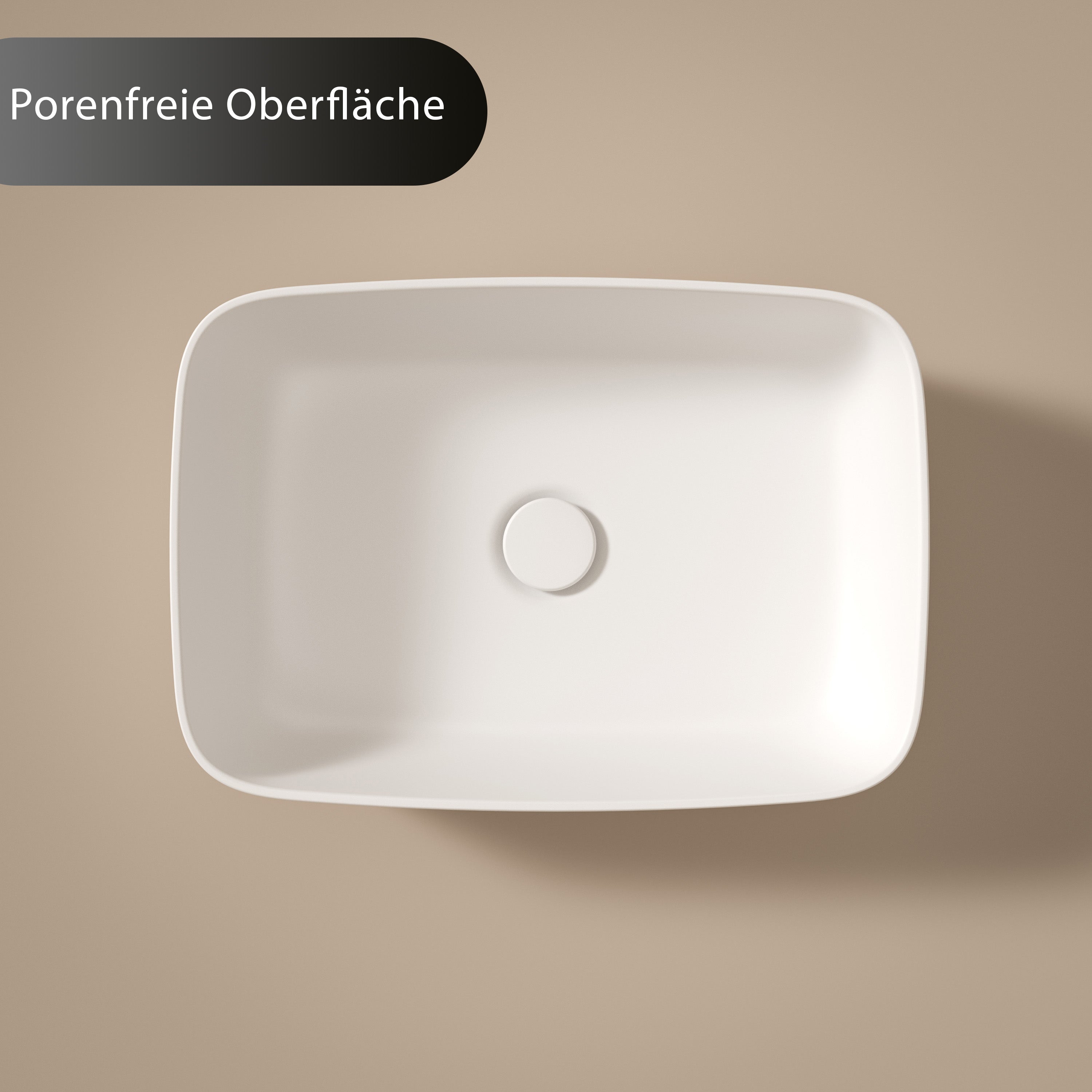 Pflegeleicht: Dank der porenfreien Materialstruktur können sich Schmutz, Kalk oder Bakterien kaum festsetzen. Das Aufbauwaschbecken ist besonders hygienisch, antibakteriell und lässt sich mühelos reinigen – ideal für moderne Badezimmer und Gäste-WCs.