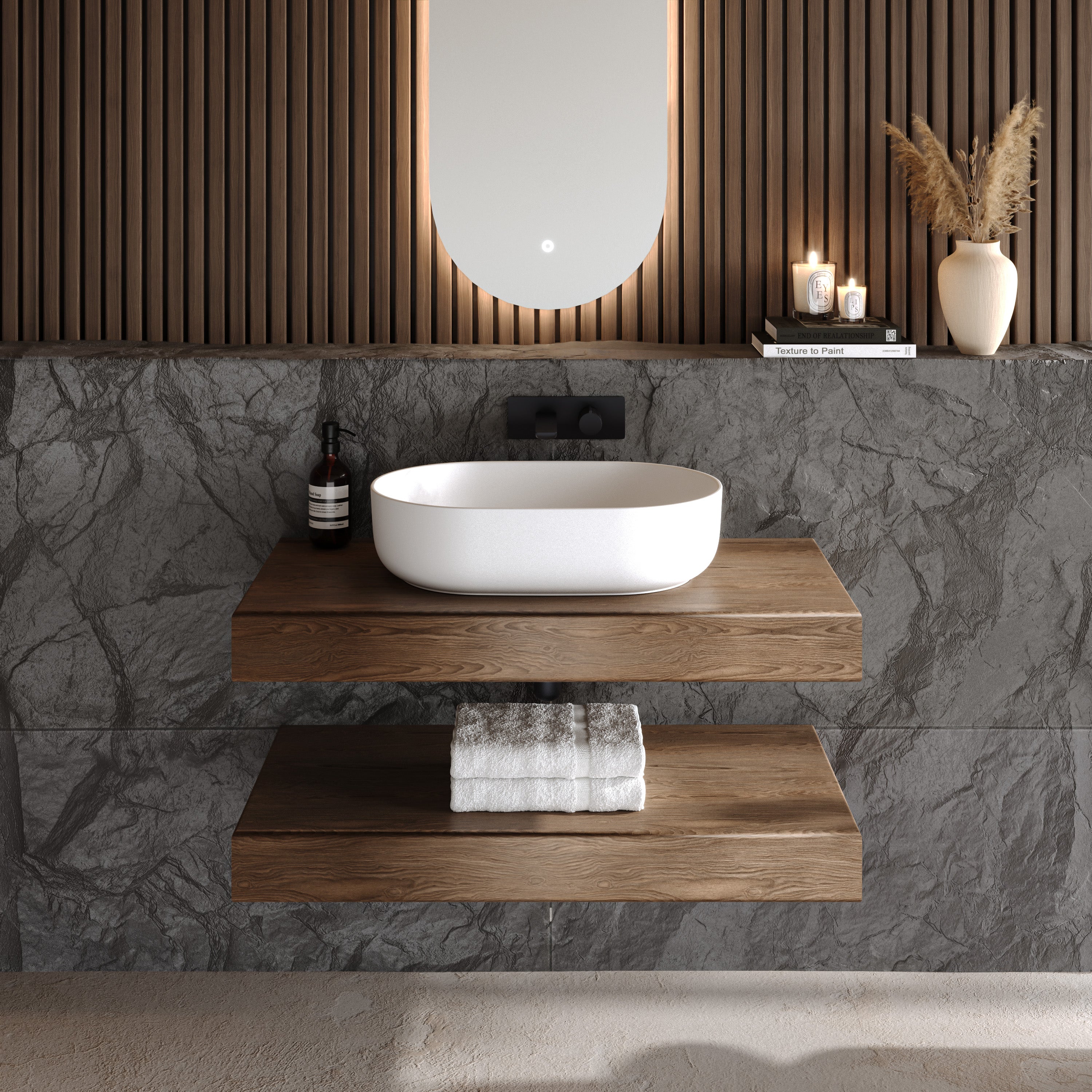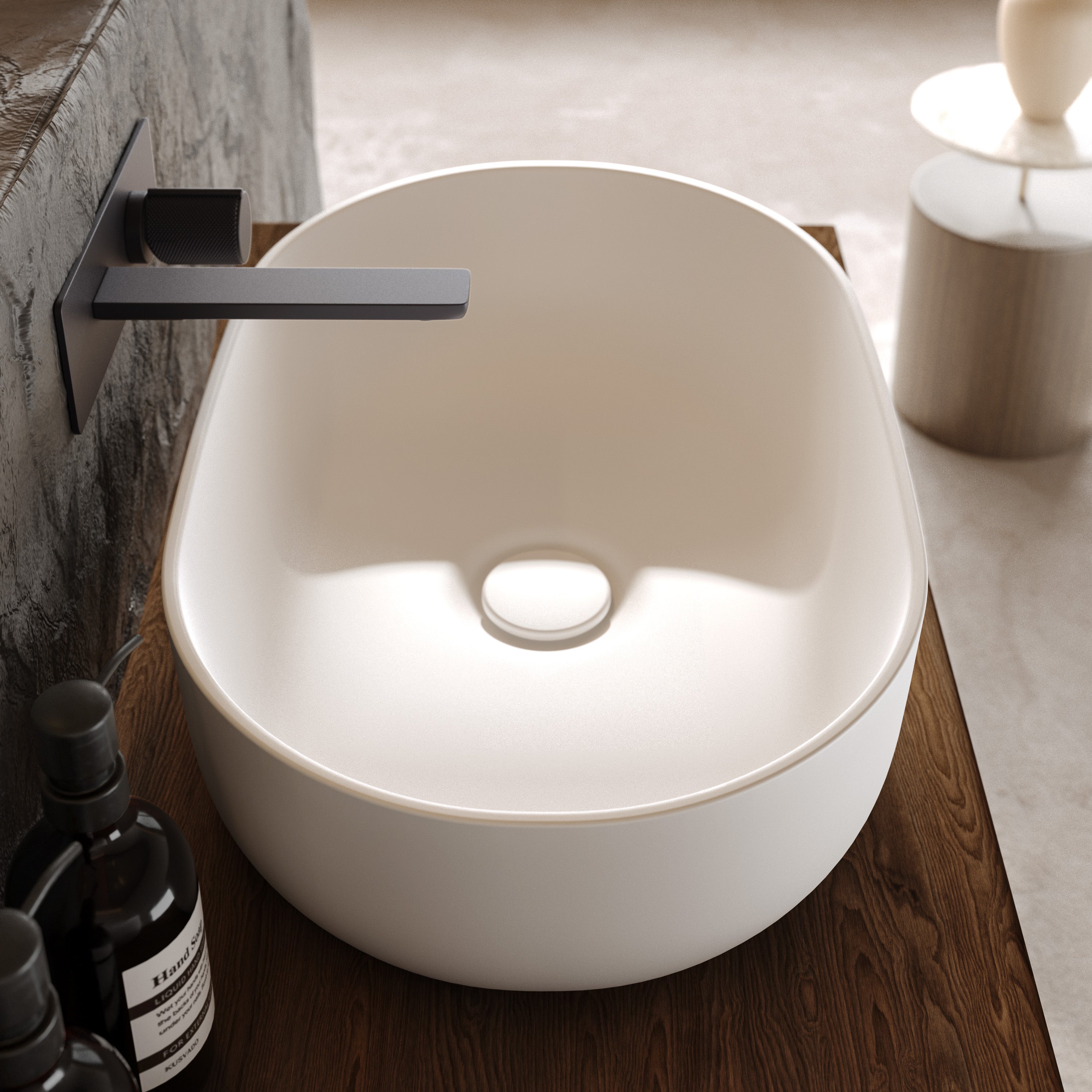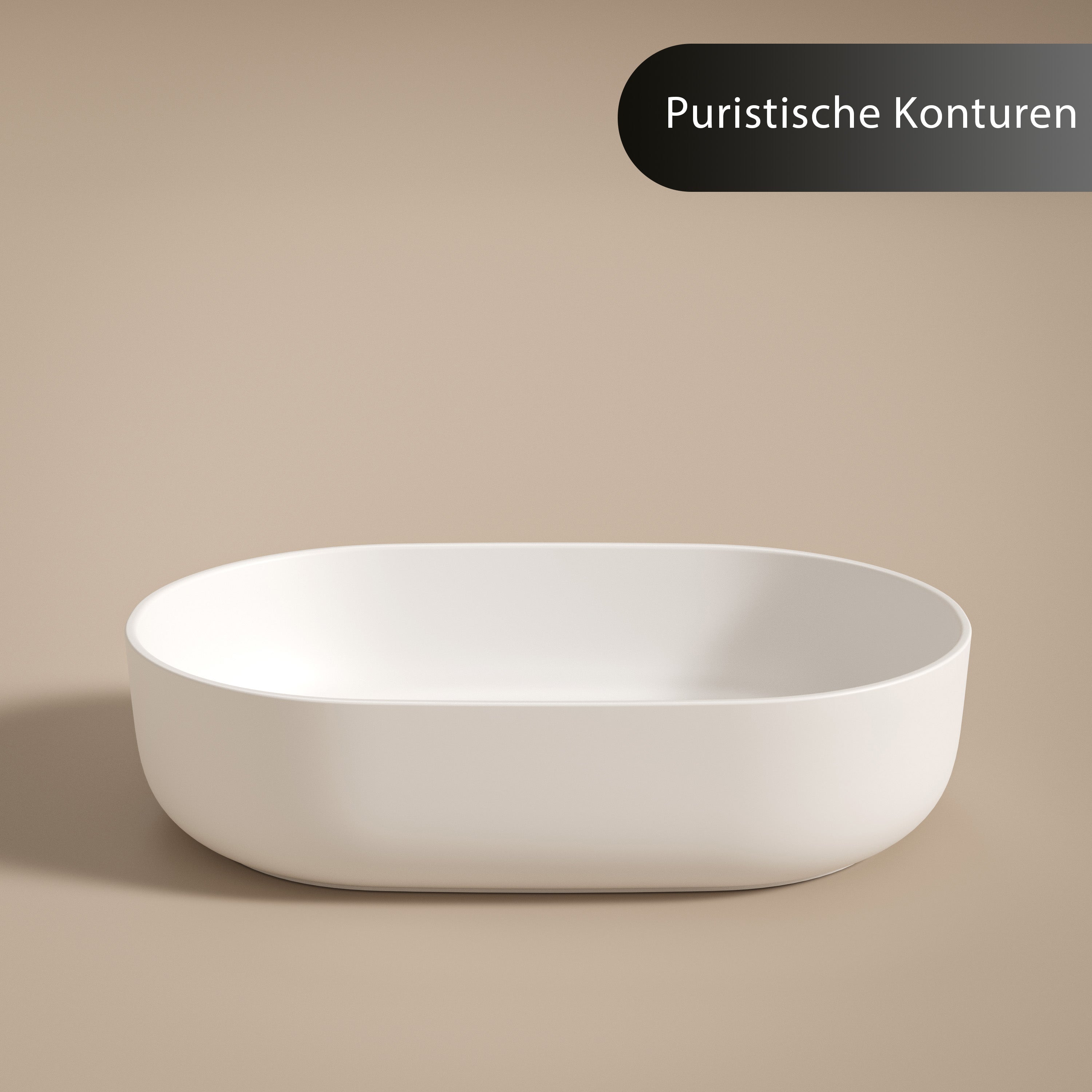 Das Aufsatzwaschbecken „Luva“ aus Solid Surface Mineralguss überzeugt mit einer klaren, ruhigen Formensprache und einer bewusst reduzierten, ovalen Geometrie. Die gleichmäßig verlaufenden Linien und die fein ausgearbeitete Randführung verleihen dem Waschbecken eine moderne, zurückhaltende Präsenz, die sich harmonisch in hochwertige Bad- und Waschtischkonzepte einfügt.