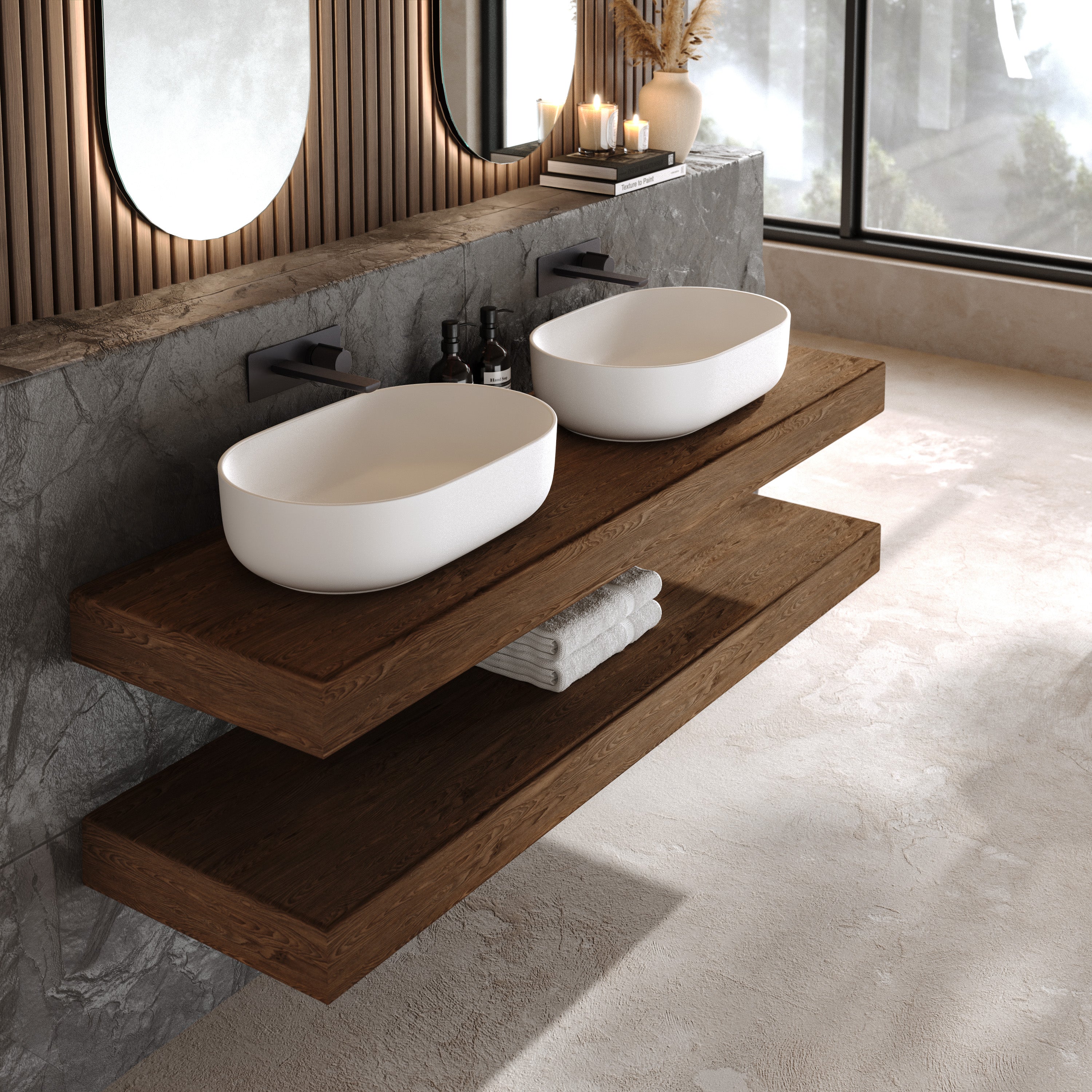 Jedes Aufsatzwaschbecken wird in präziser Handarbeit endgefertigt, um höchste Präzision an jedem Detail sicherzustellen. Nicht porös, kratzresistent und hitzebeständig – das massive Mineralwerkstoff bleibt auch bei täglicher Beanspruchung makellos und formstabil.