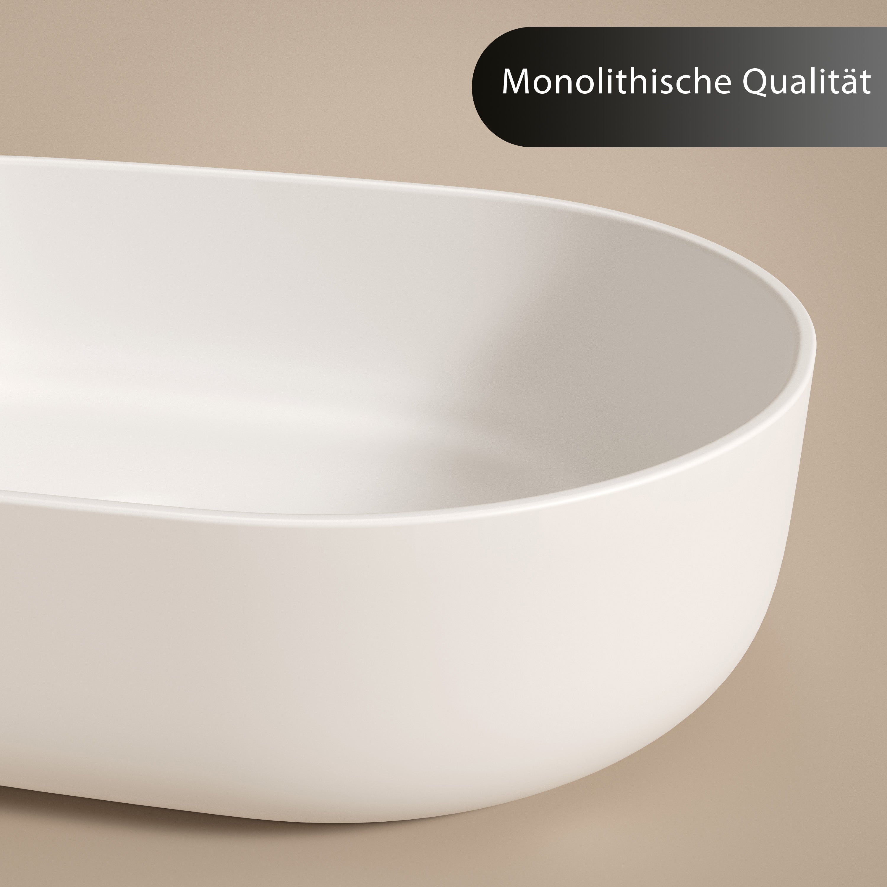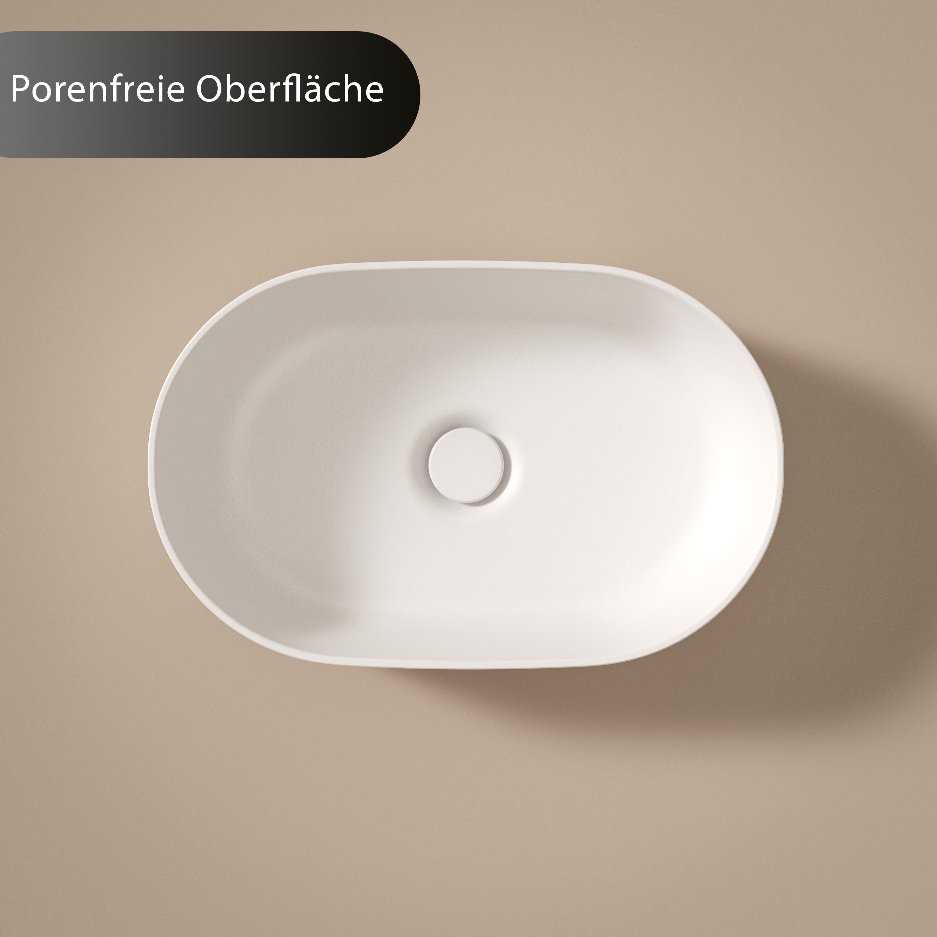 Premium Material: Das Aufsatzwaschbecken besteht aus dem speziell entwickelten Polymer-Mineralwerkstoff, einem durchgehend massiven Material ohne Beschichtungen. Die homogene Struktur sorgt für hohe Stabilität, eine seidig-matte Oberfläche und zählt zu den hochwertigsten Ausführungen im Bereich von Mineralwerkstoff Waschtisch Aufsatzwaschbecken.