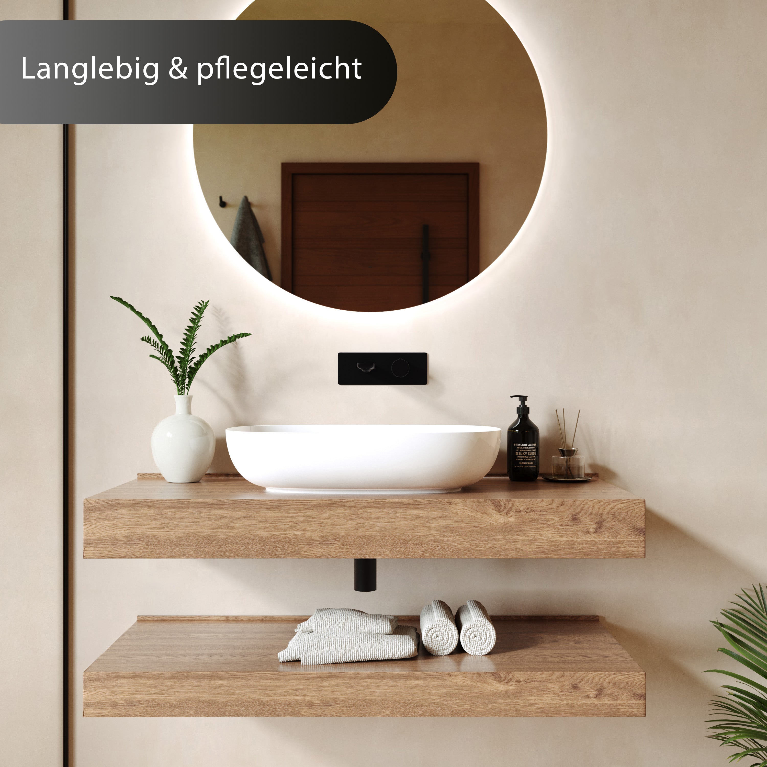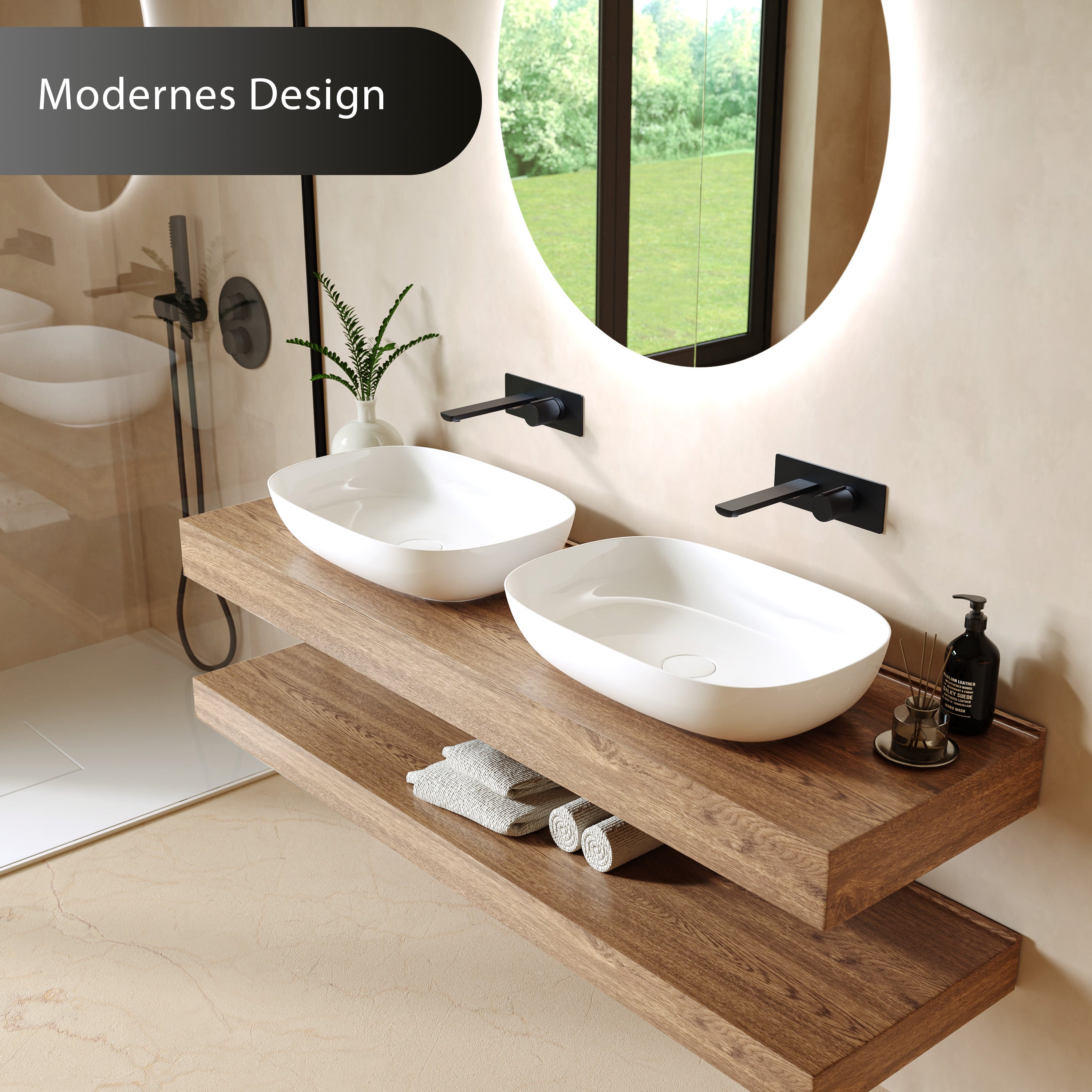 Angenehm warme Haptik: Im Gegensatz zu vielen Keramikbecken fühlt sich das Mineralguss-Aufbauwaschbecken angenehm warm und samtig an. Die Oberfläche schafft ein komfortables, hochwertiges Gefühl beim täglichen Gebrauch und macht jeden Waschtisch spürbar angenehmer.
