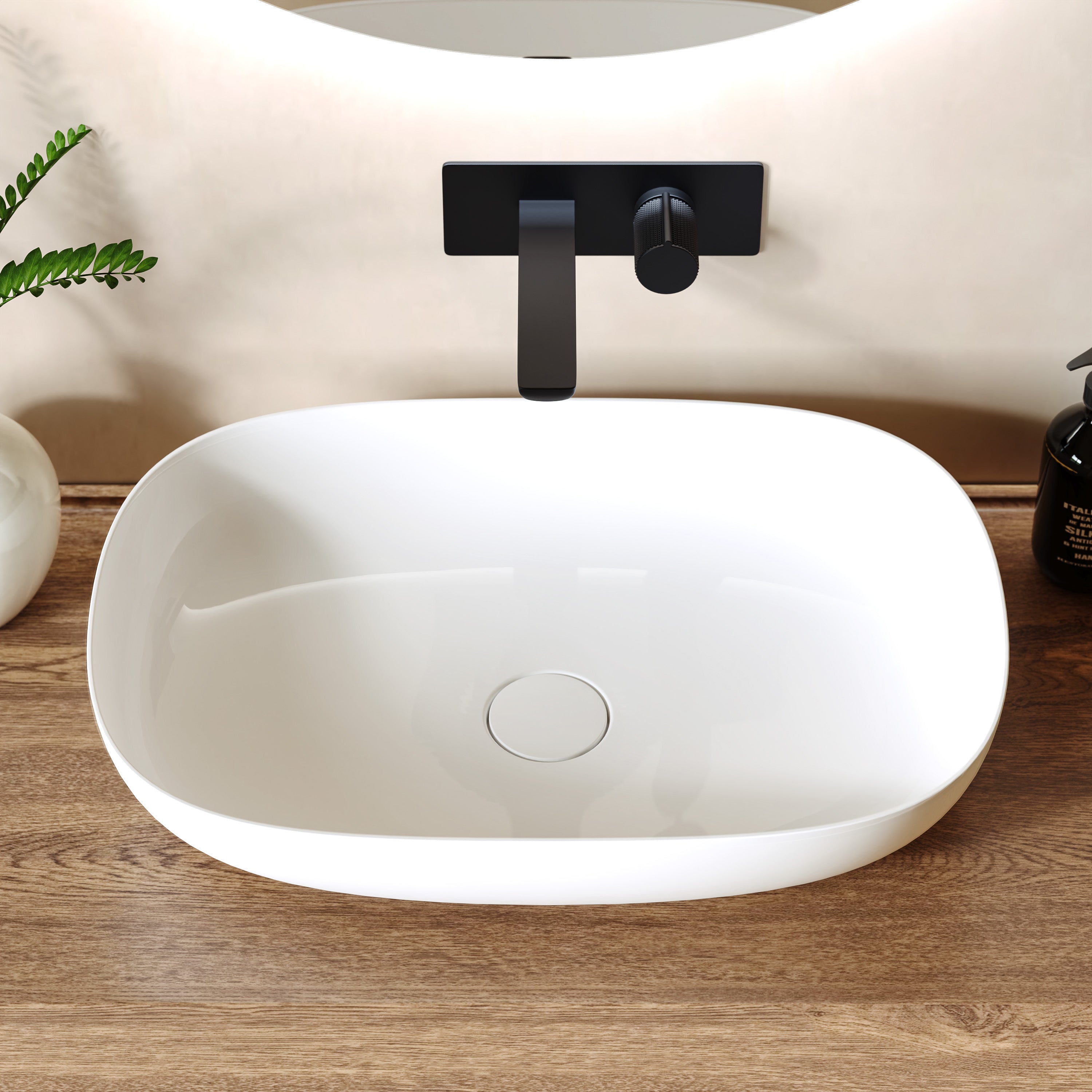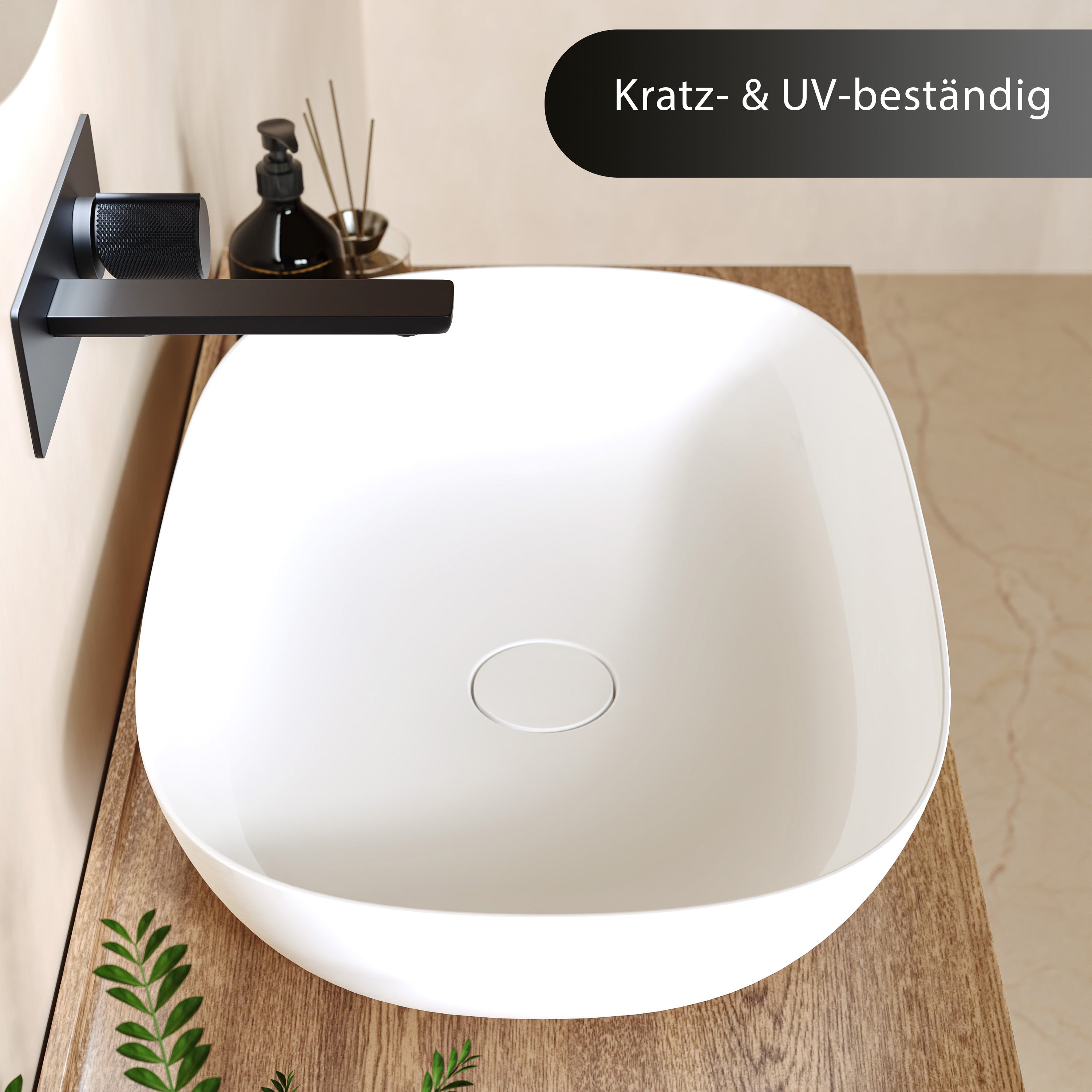 Die elegante weich abgerundete eckige Form des Aufsatzwaschbeckens fügt sich harmonisch in moderne und minimalistische Badezimmer ein. Die einheitliche Verarbeitung aus einem Guss erzeugt eine ruhige und monolithische Optik.