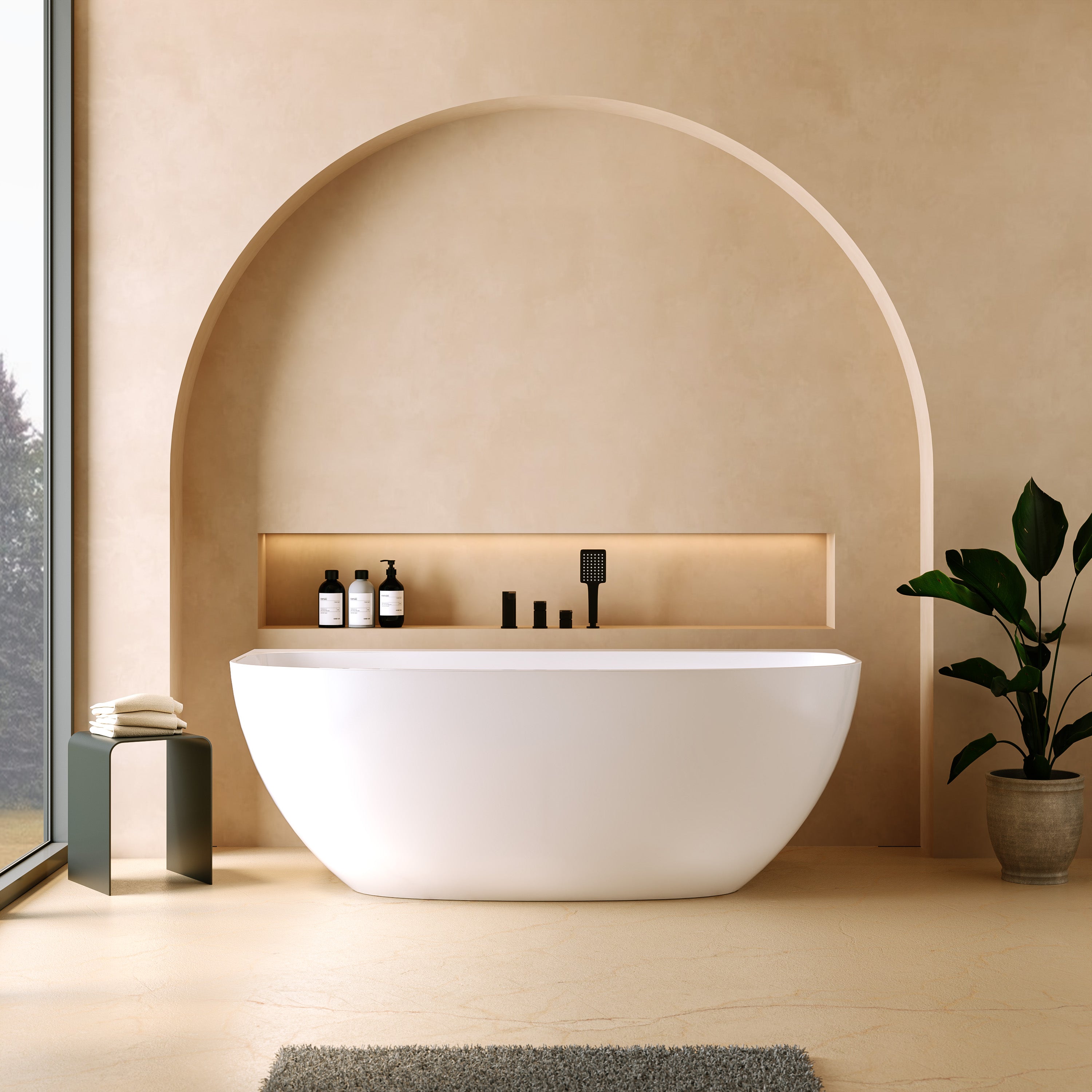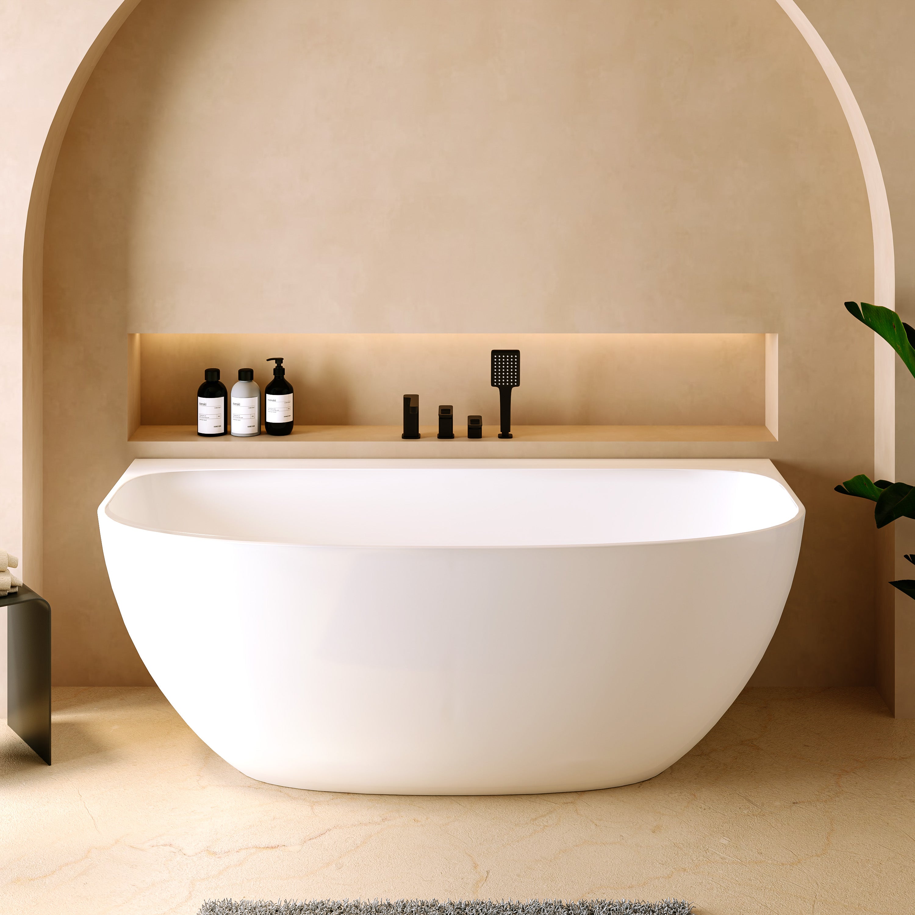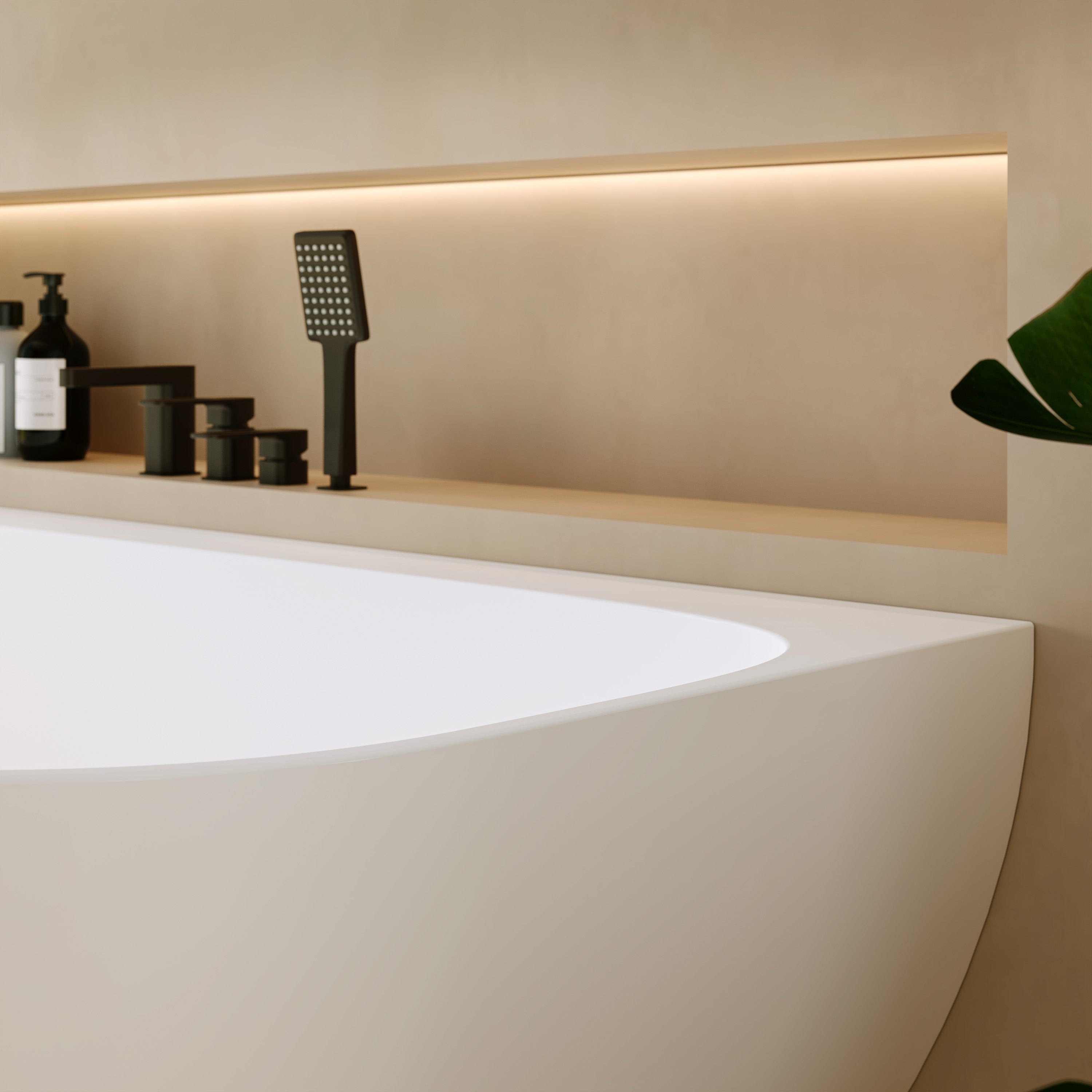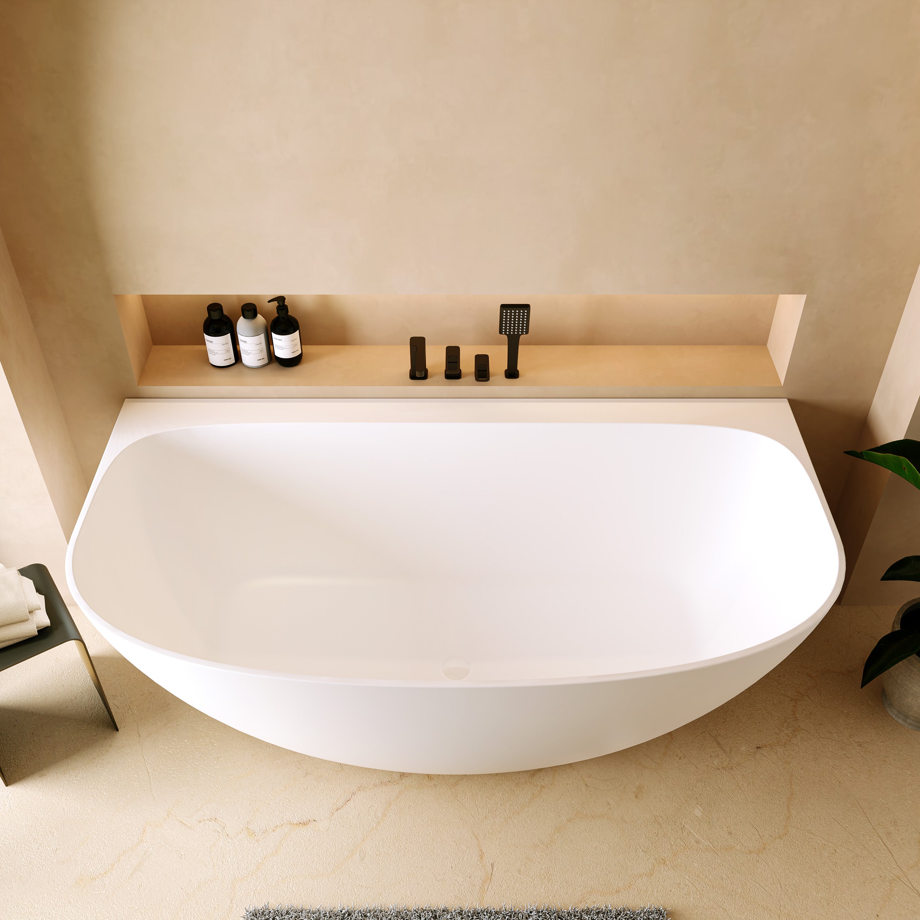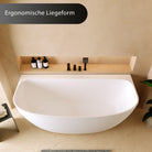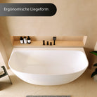 Die „Tahaa“ ist eine halb freistehende Mineralguss-Badewanne, die sich harmonisch an die Wand anschmiegt und dennoch wie ein eigenständiges Designstück wirkt. Die sanft gerundete Vorderseite, die klare Linienführung und die ruhige, moderne Form verleihen jedem Bad eine warme, ausgewogene Ästhetik. Die großzügige Innenform bietet viel Platz und unterstützt eine komfortable Liegeposition.