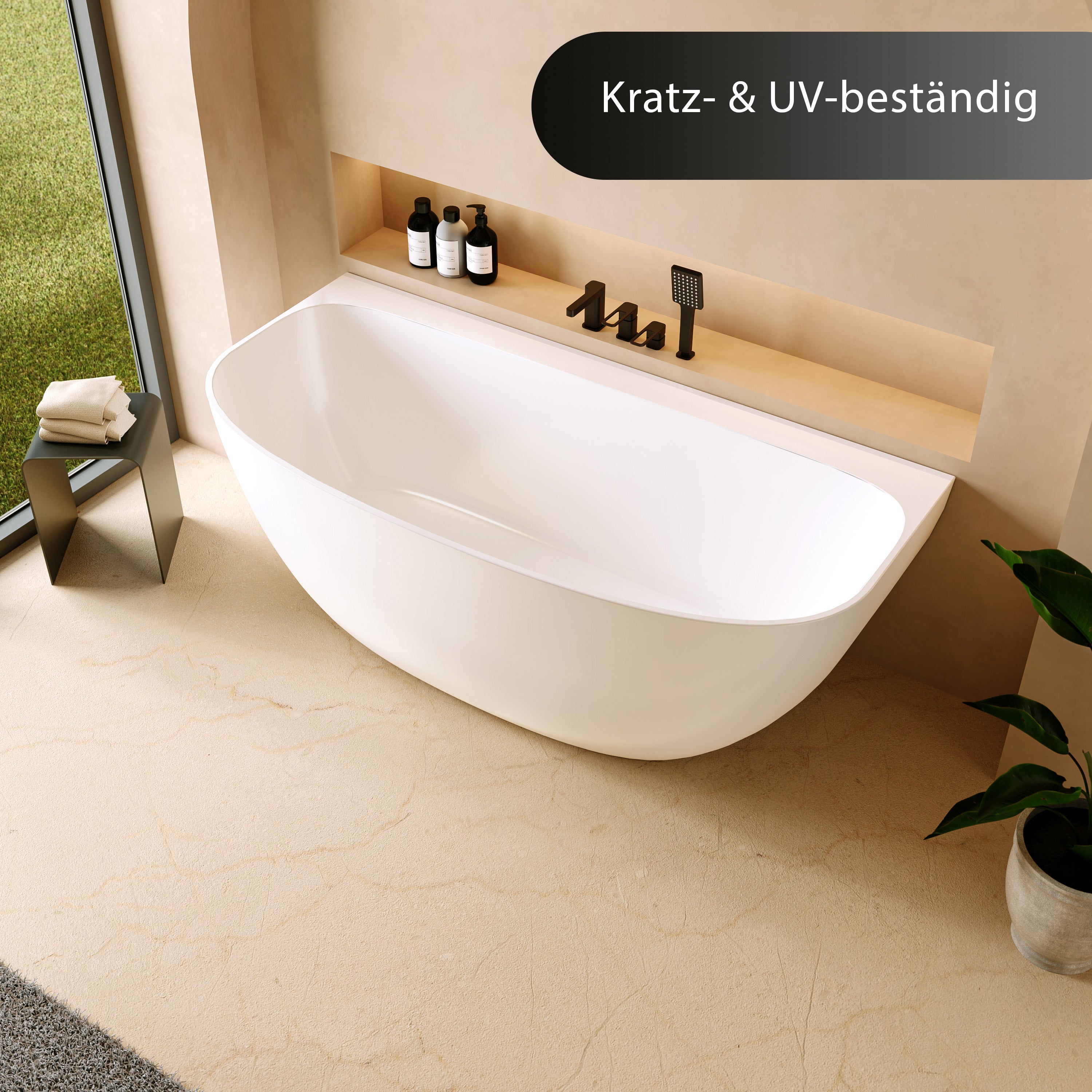 Die Badewanne wird aus einem innovativen Verbundwerkstoff gefertigt, der Robustheit und Leichtigkeit perfekt vereint. Die samtig-glatte Oberfläche ist mit einem hochwertigen, pflegeleichten Gelcoat veredelt