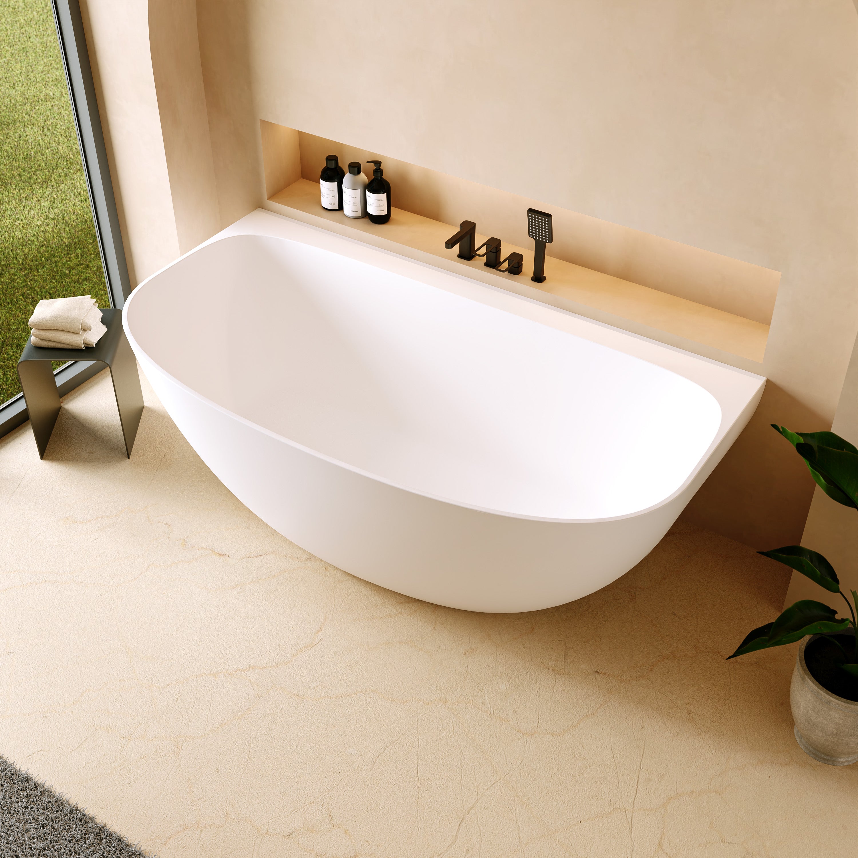 Durch nahtlose Verarbeitung aus einem Guss entsteht eine harmonische, monolithische Optik ohne Fugen oder Übergänge. Das verleiht der halbfreistehenden Badewanne eine ruhige, elegante Präsenz und macht sie zum stilprägenden Element im modernen Badezimmer.