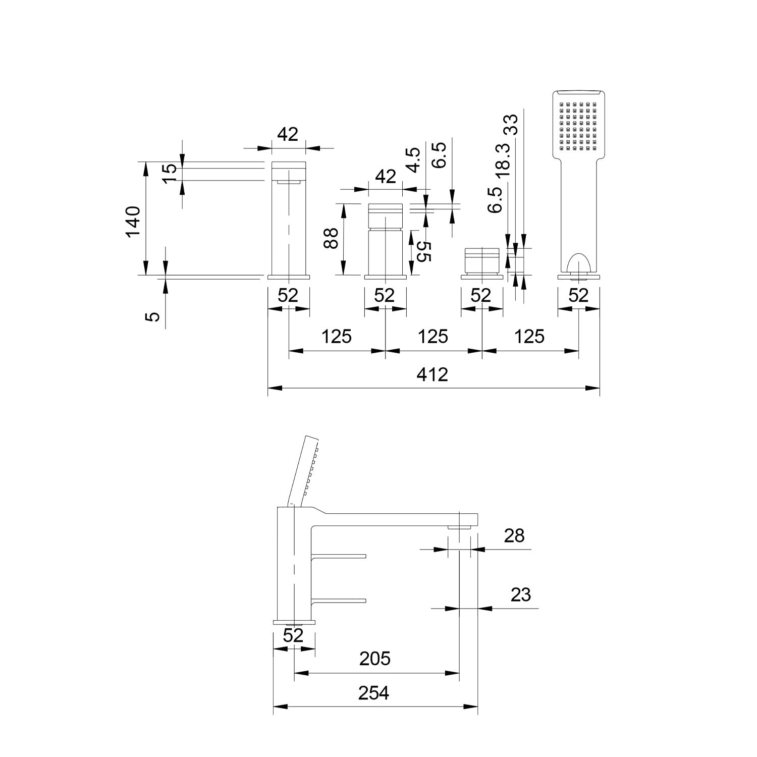 4-Loch Badewannenarmatur aus Messing "SLIDE" | Wannenrandarmatur mit Handbrause
