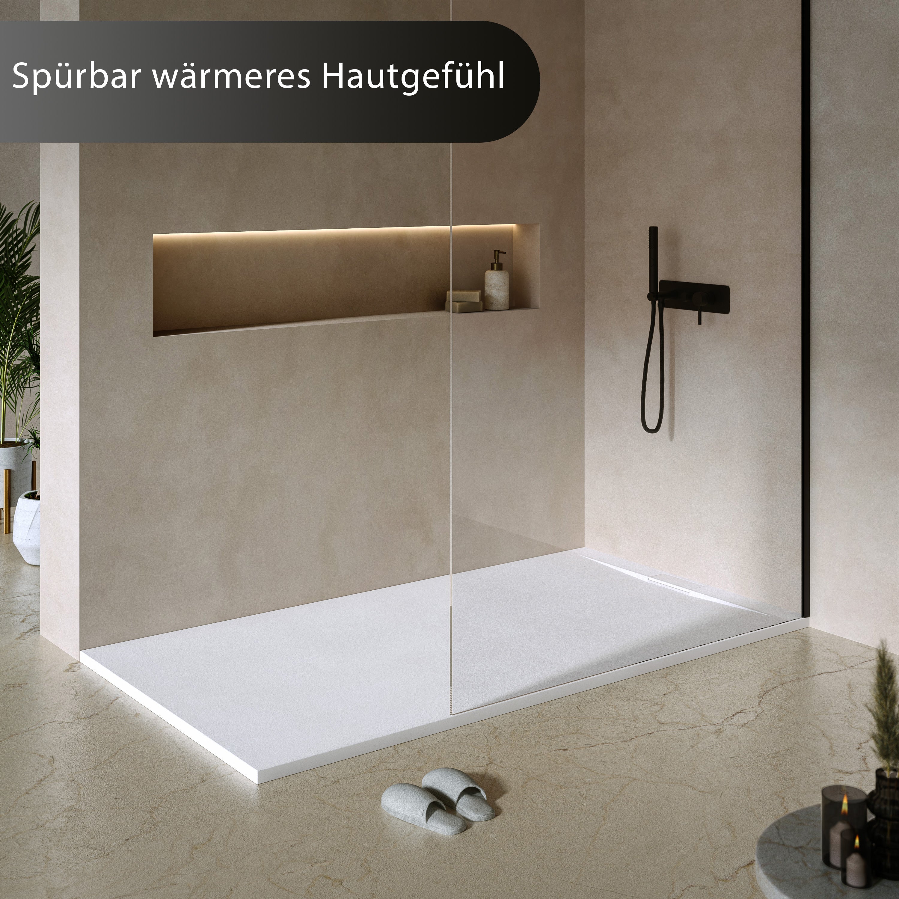 Wärme & Komfort: Die besondere Materialstruktur des Duschbecken speichert Wärme spürbar länger. So bleibt die Oberfläche angenehm temperiert und steigert den Duschkomfort deutlich.