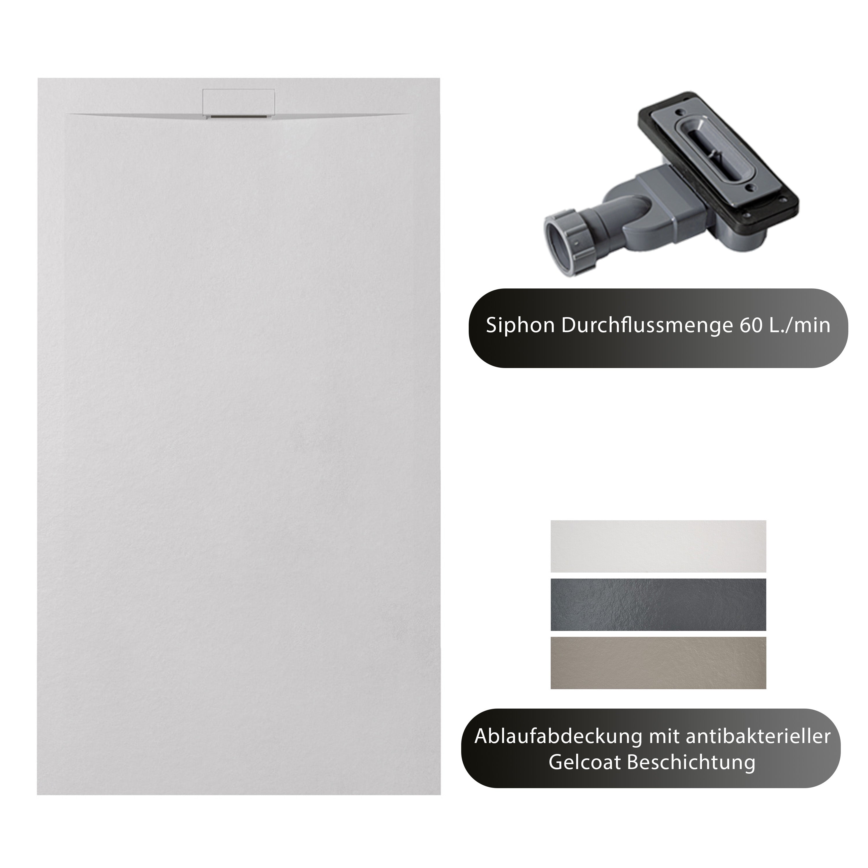 Hochwertiger Mineralguss: Die Duschtasse ist aus massivem Mineralguss gefertigt und veredelt mit einer antibakteriellen Gelcoat-Beschichtung. Diese Kombination sorgt für Stabilität, Hygiene und eine dauerhaft gepflegte Optik.