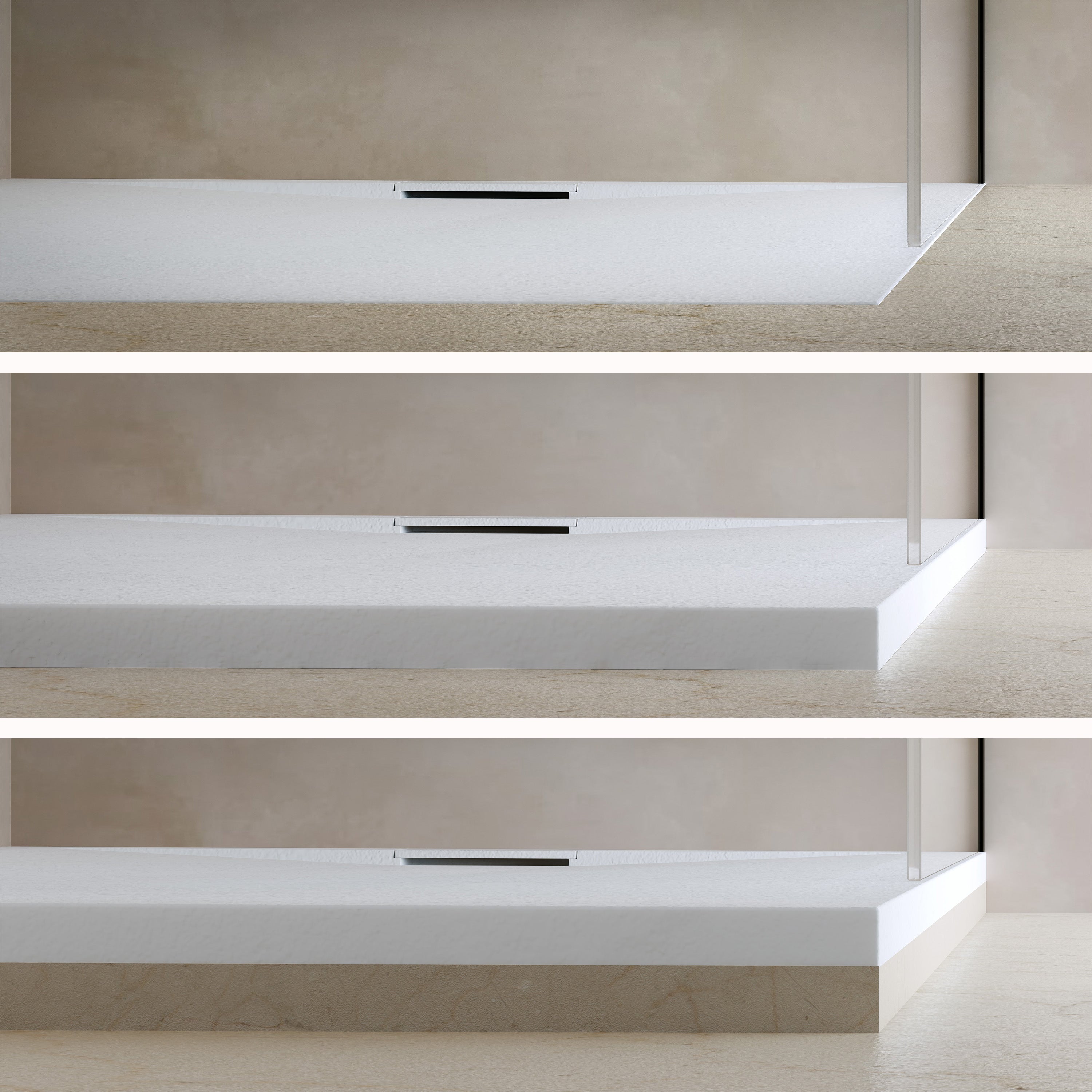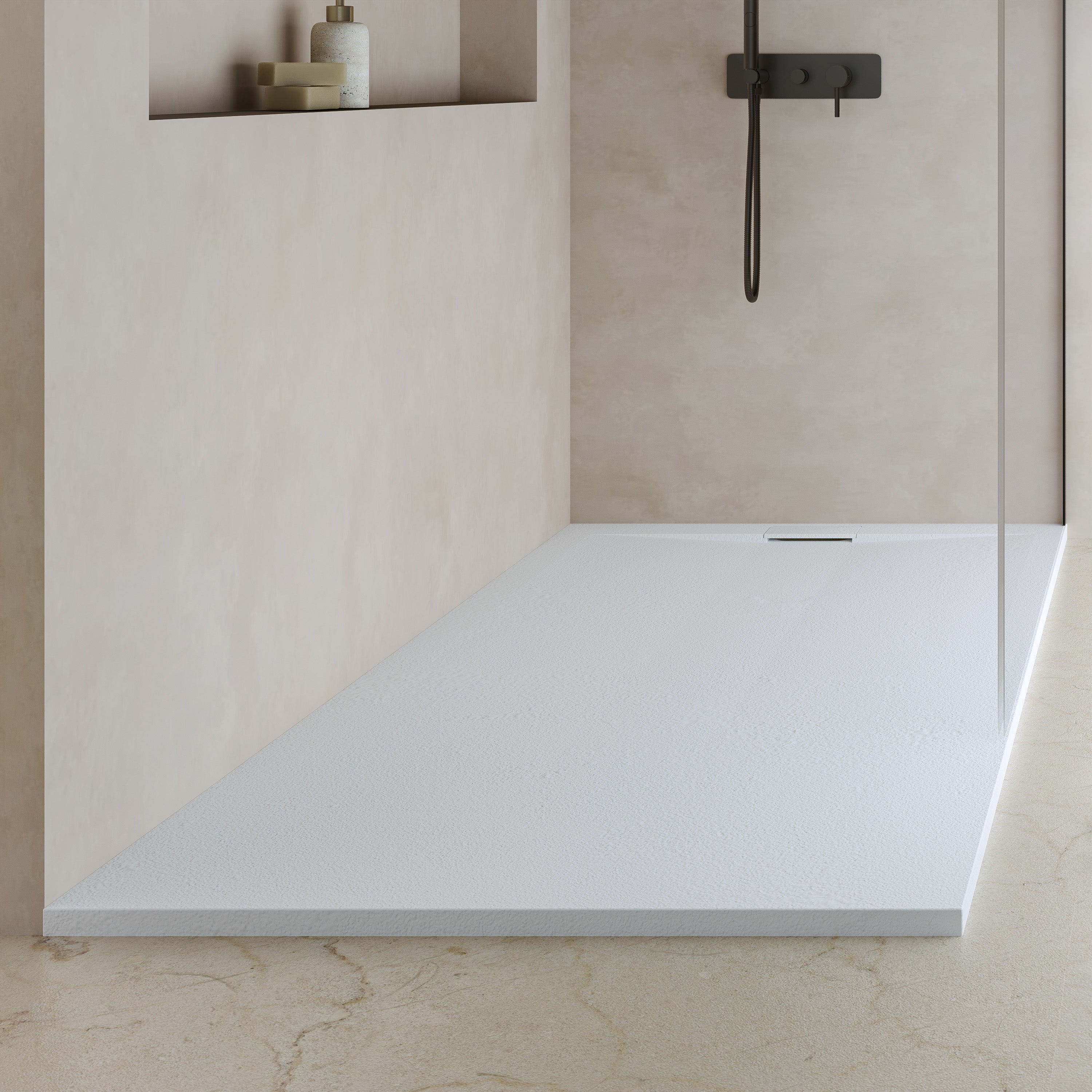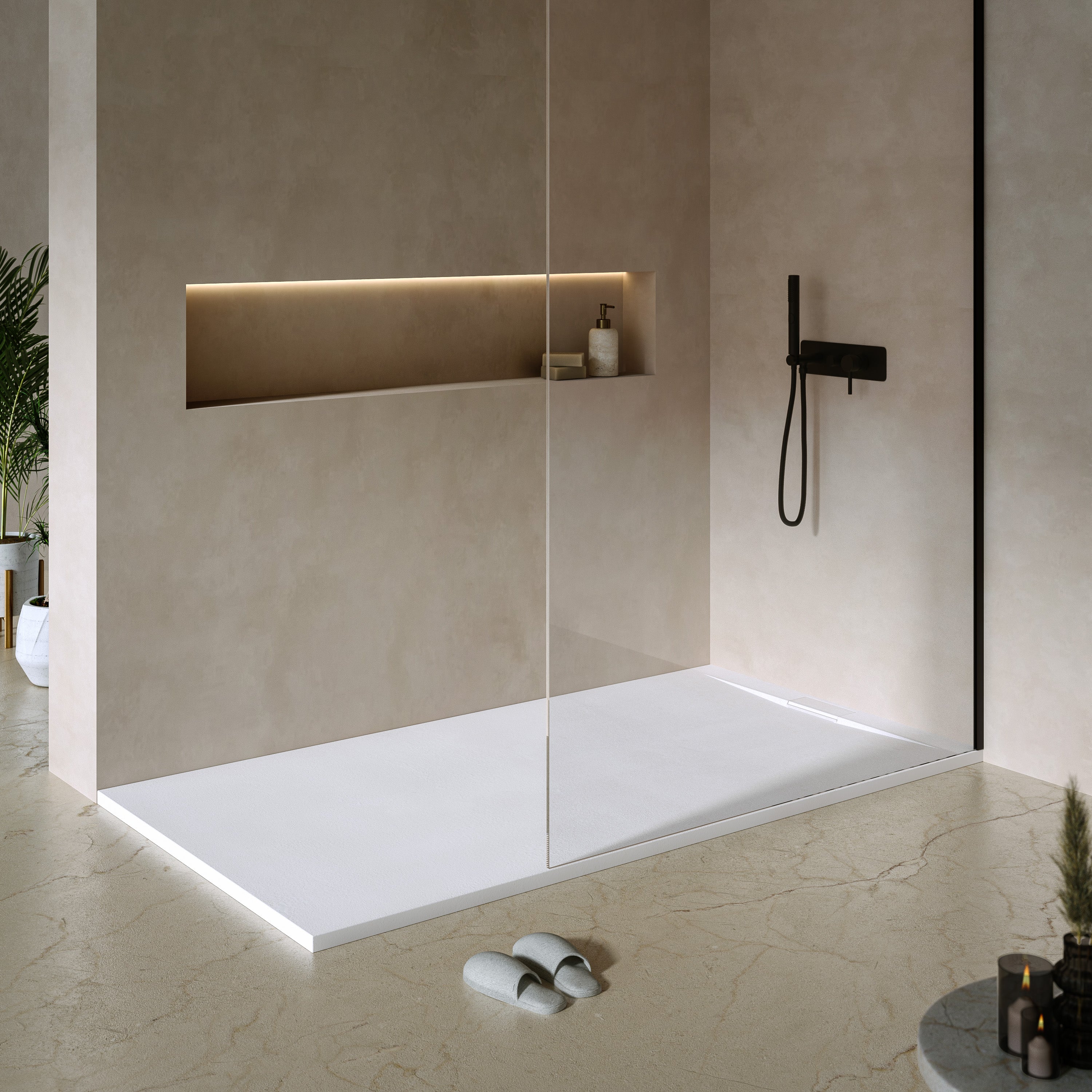Die „Ardea“ Duschwanne verwandelt jede Dusche in ein hochwertiges Design-Erlebnis, das du bei jedem Schritt spürst. Mit ihrer superflachen Höhe von nur 2,7 cm und der edlen Steinoptik-Oberfläche fügt sie sich nahtlos in jedes Badezimmer ein – minimalistisch, elegant und zeitlos.