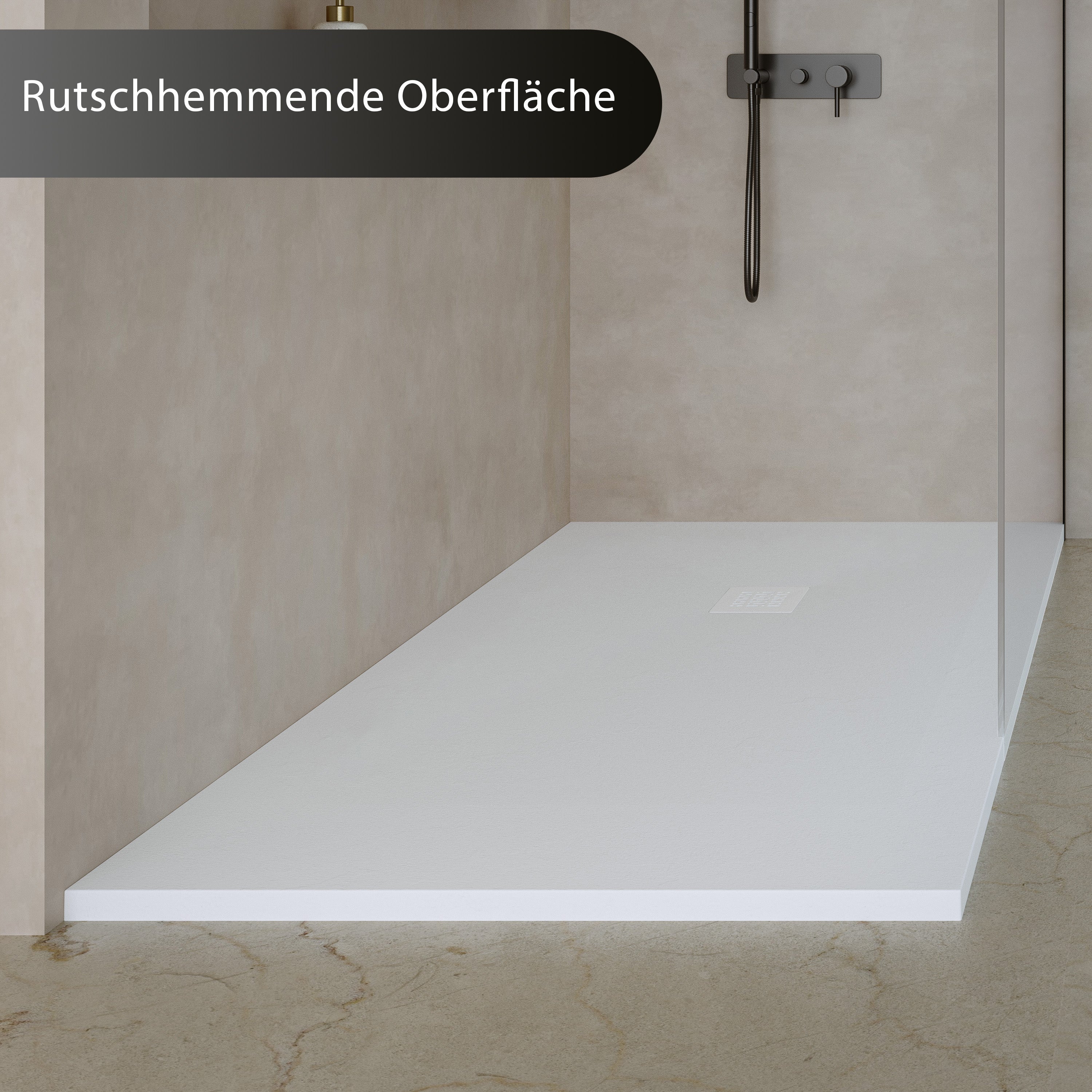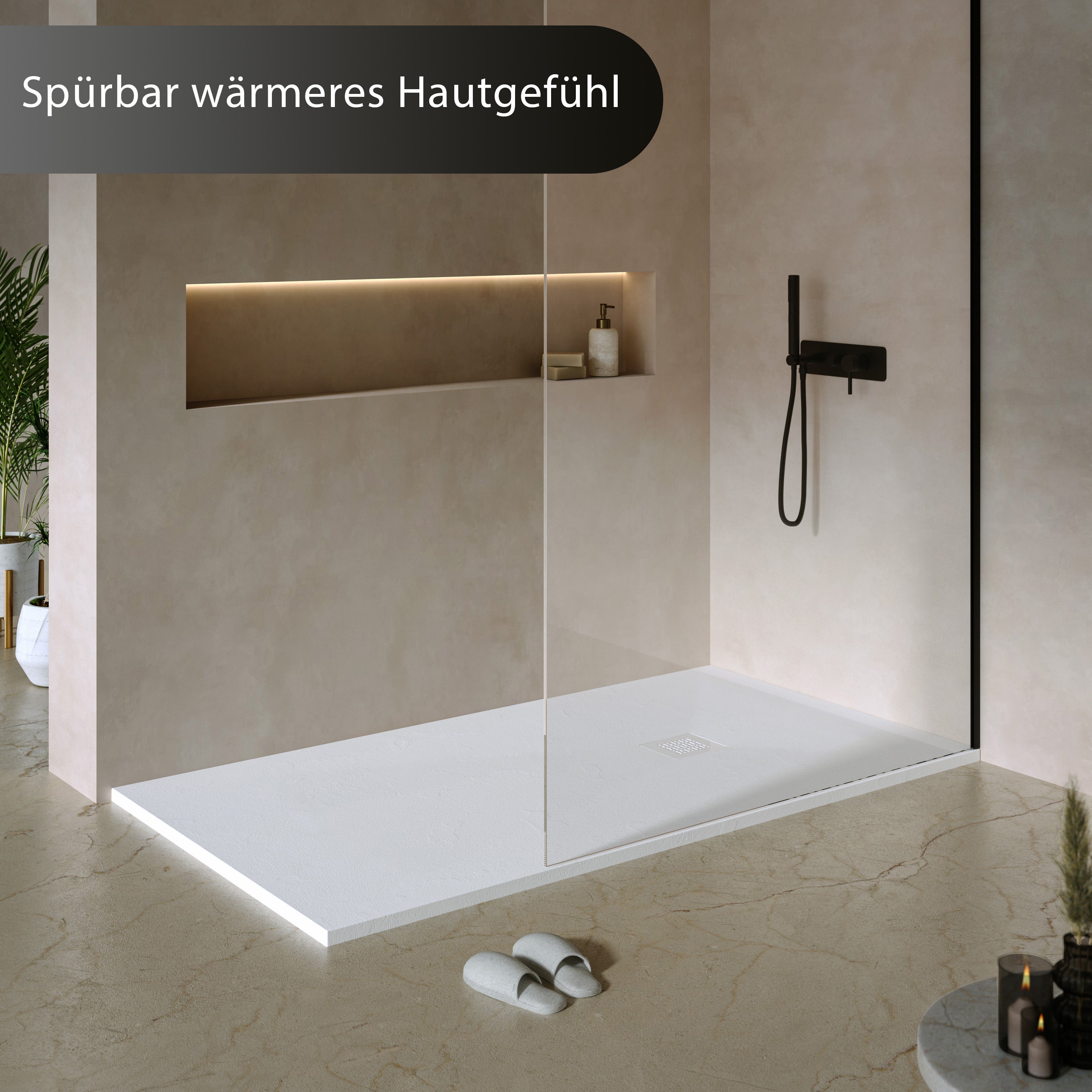 Wärme & Komfort: Die besondere Materialstruktur des Duschbecken speichert Wärme spürbar länger. So bleibt die Oberfläche angenehm temperiert und steigert den Duschkomfort deutlich.