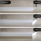 Die Abdichtung erfolgt durch ein spezielles Dichtband oder Abdichtset am Übergang zur Wand. So wird zuverlässig verhindert, dass Feuchtigkeit in den Untergrund eindringt.
