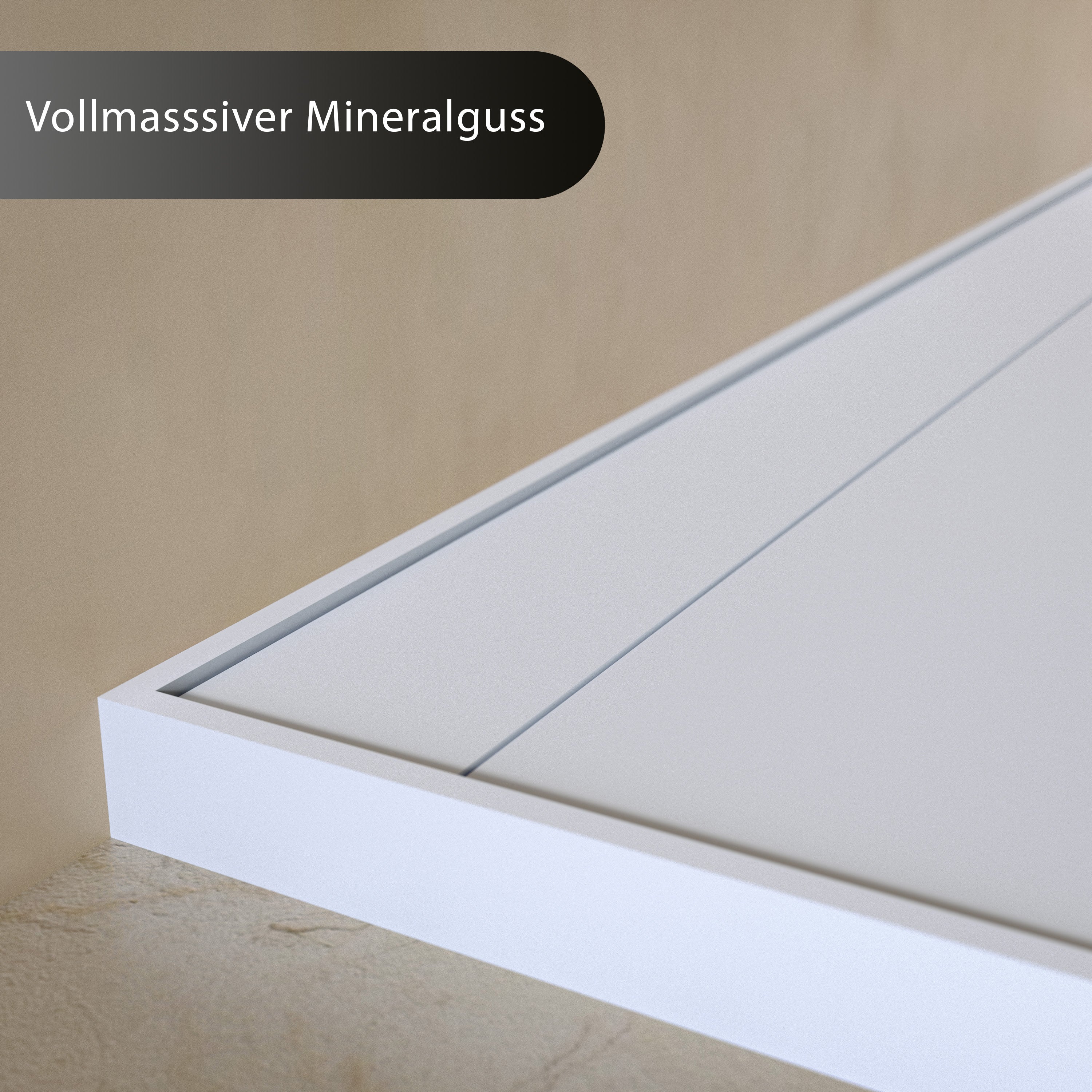 Das Full-Body-Mineralwerkstoff der Duschwanne überzeugt durch eine homogene, matte Oberfläche mit angenehmer Haptik. Die porenfreie Oberfläche ist besonders widerstandsfähig, hochwertig und langlebig und unterstreicht den architektonischen Charakter der Duschwanne.