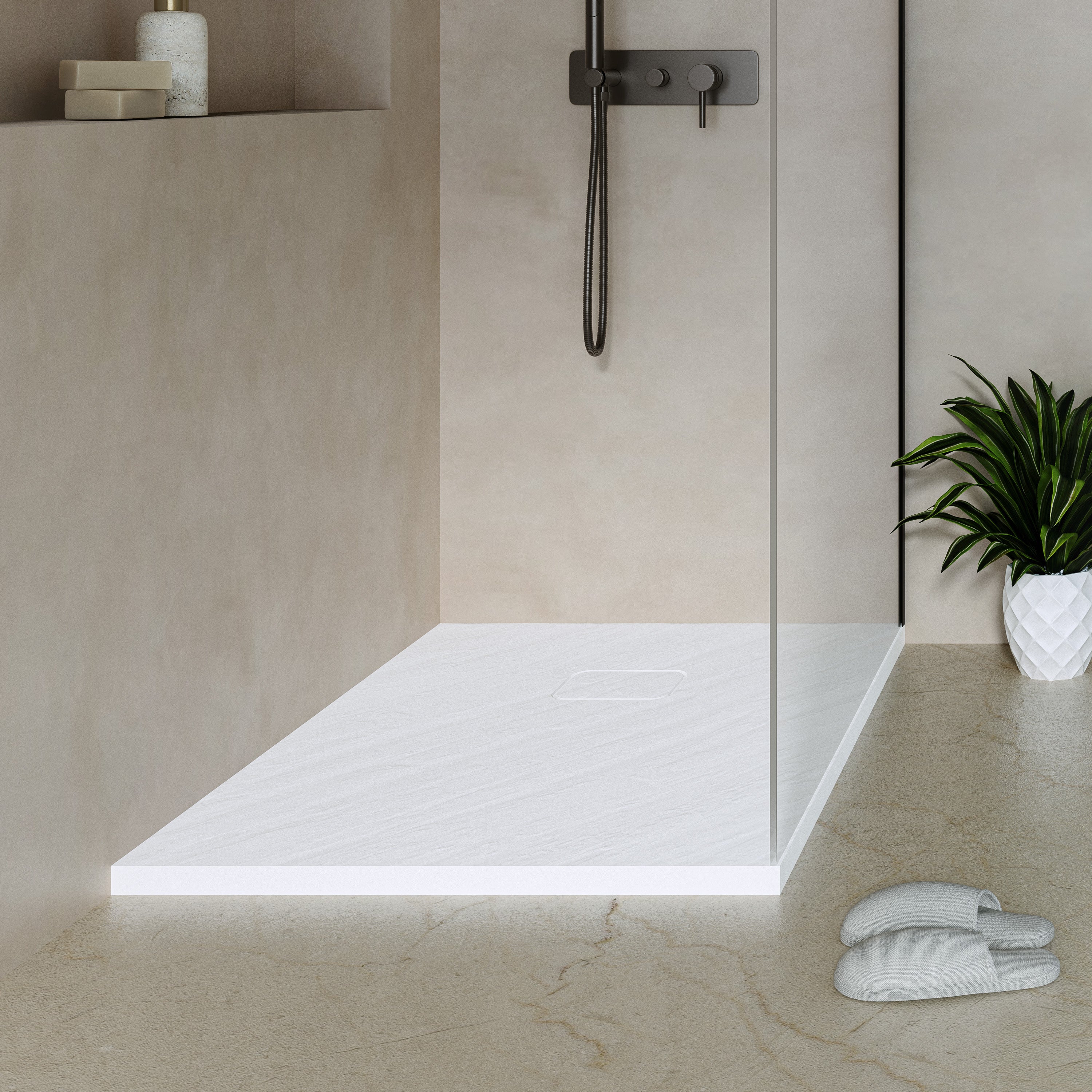 Elegant, zeitlos und mit natürlicher Haptik. Die charaktervolle Steinstruktur der Wanne verleiht deinem Bad ein edles Design und sorgt gleichzeitig für sicheren Halt beim Duschen.