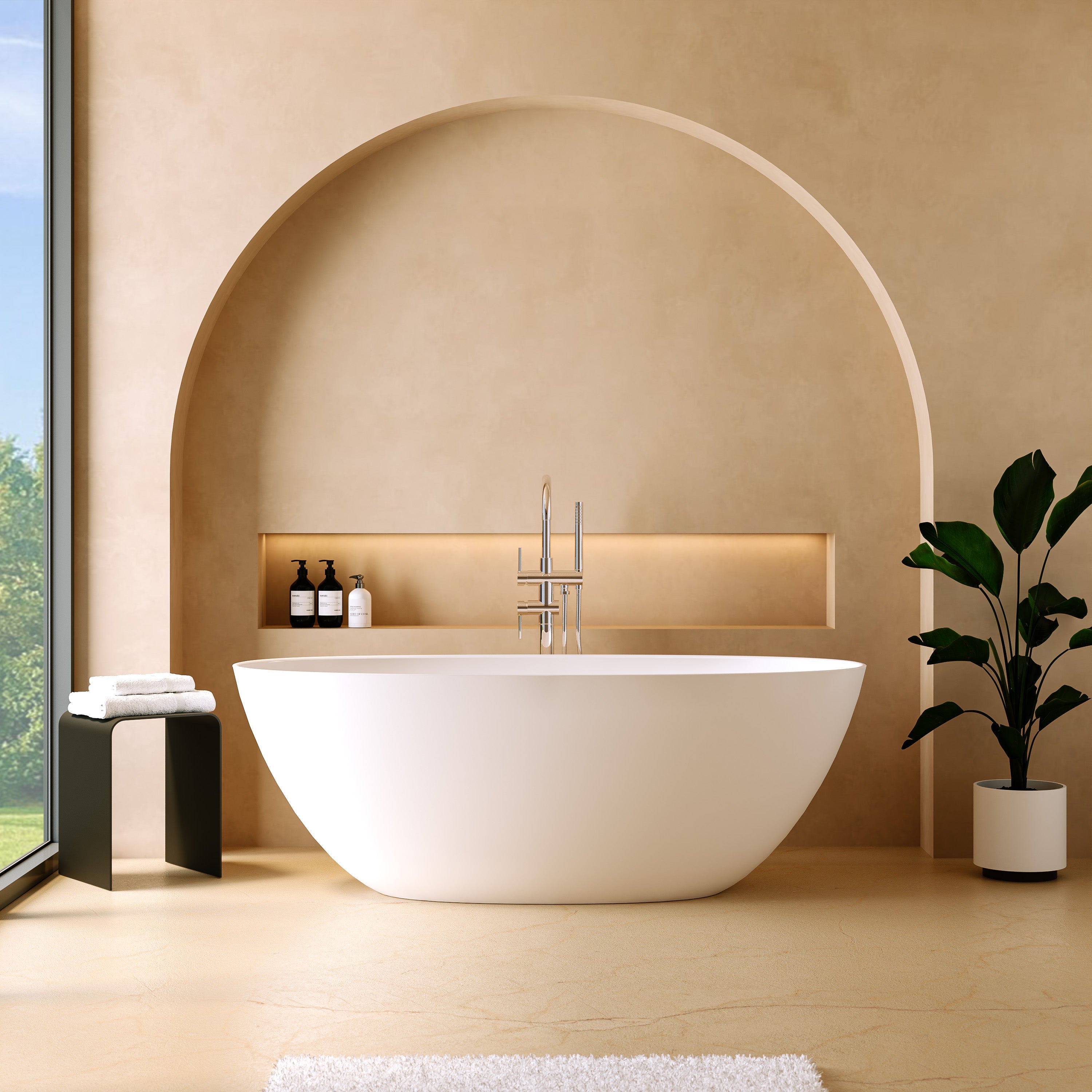 Die freistehende Mineralguss-Badewanne „Fiji“ wird zum ruhigen Mittelpunkt jedes modernen Badezimmers. Ihre weich fließende Form, die ausgewogenen Proportionen und die elegante, leicht zulaufende Silhouette verleihen ihr eine zeitlose Präsenz – als stilvolle Badewanne freistehend, die Offenheit und Leichtigkeit ausstrahlt.