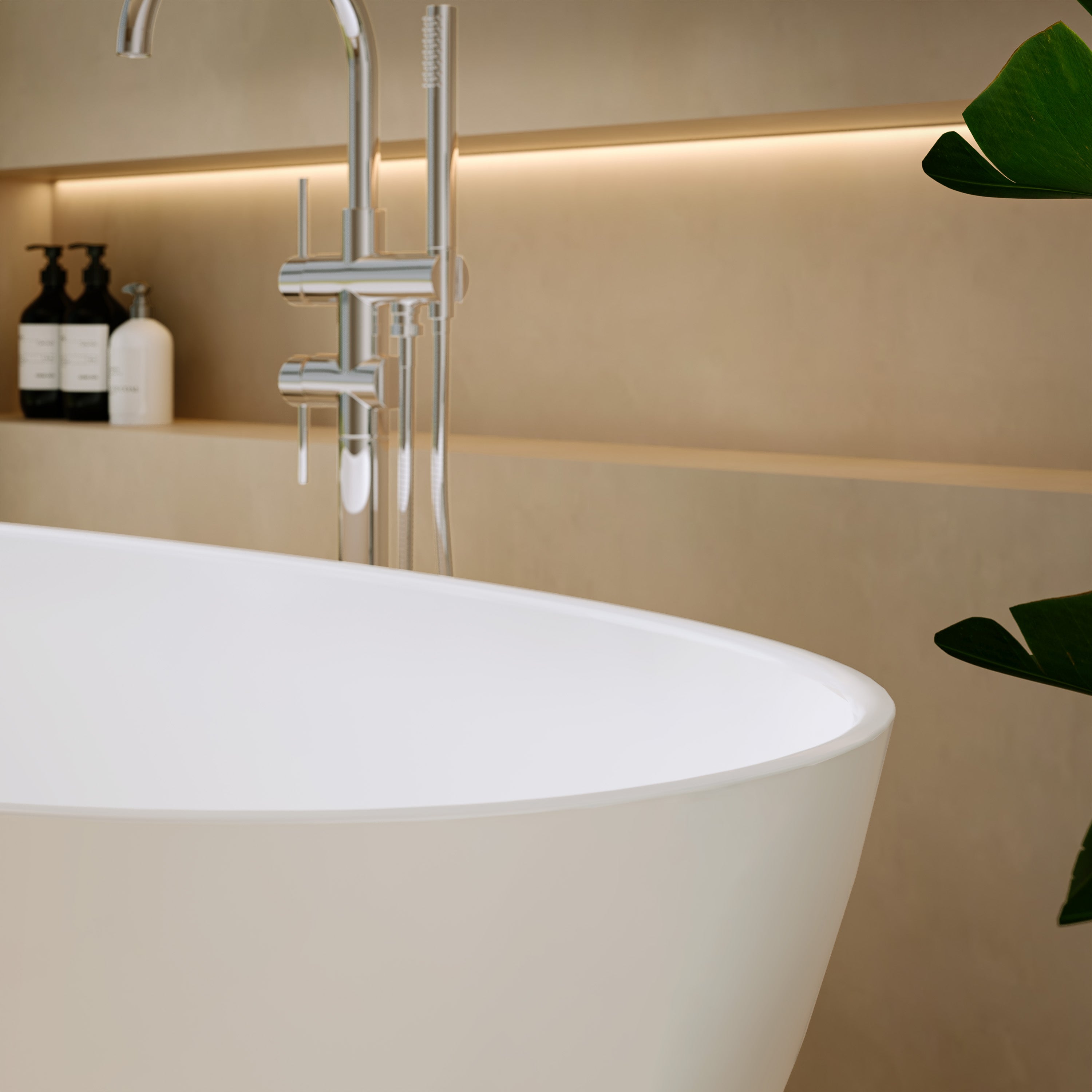 Die ovale Form mit sanfter Verjüngung zum Boden verleiht der freistehenden Badewanne eine elegante Leichtigkeit. Ein echtes Statement moderner Badarchitektur – stilvoll, harmonisch und formvollendet aus jedem Blickwinkel.