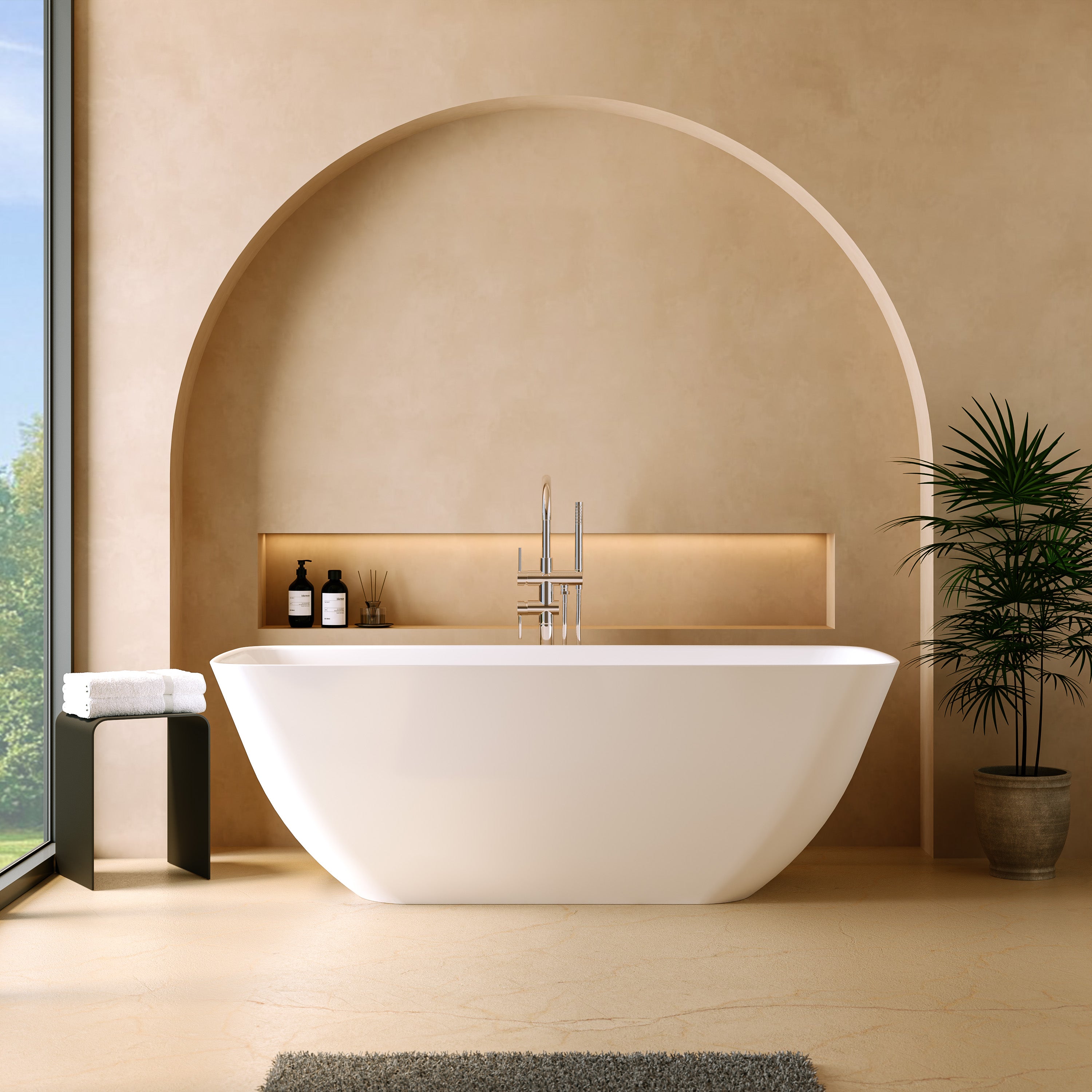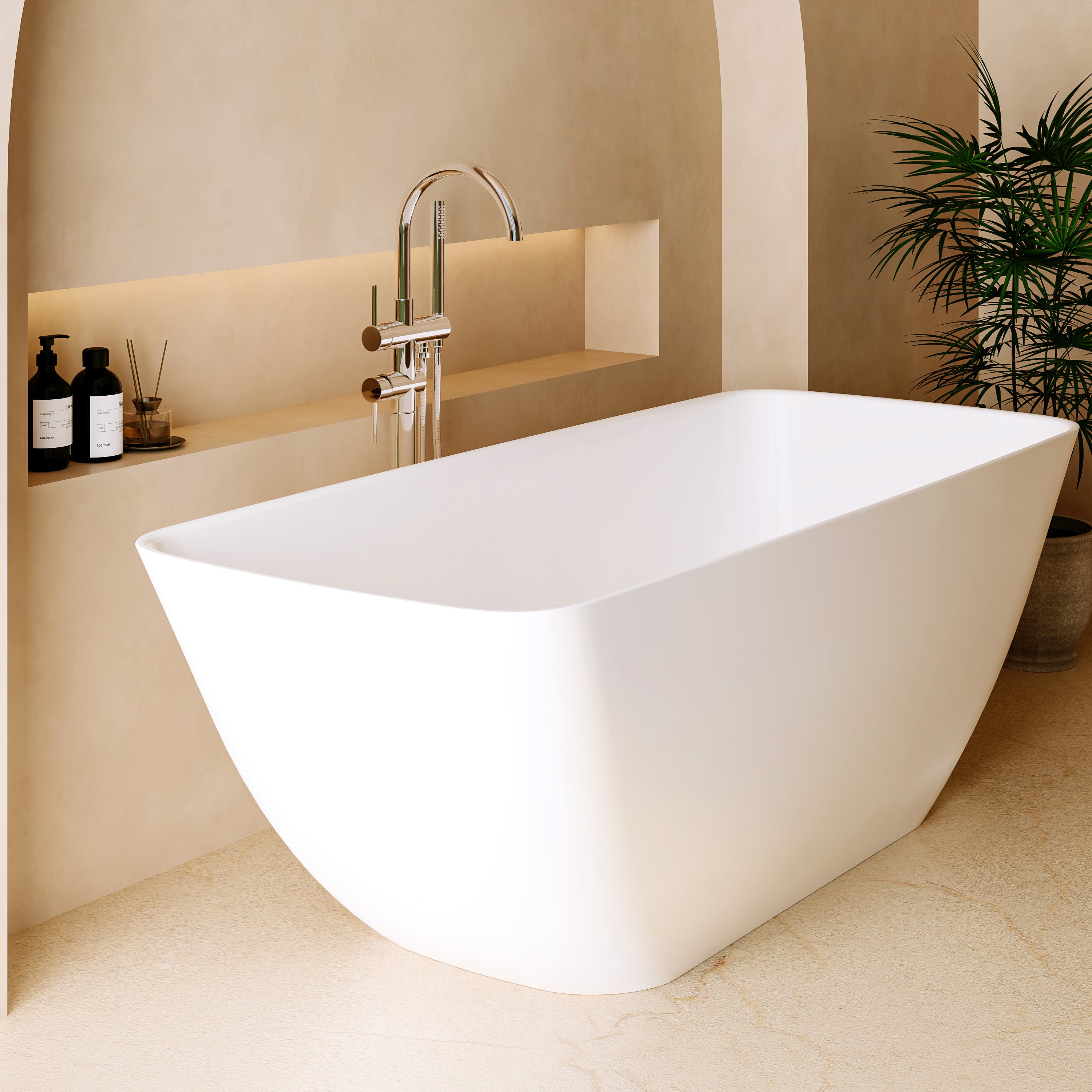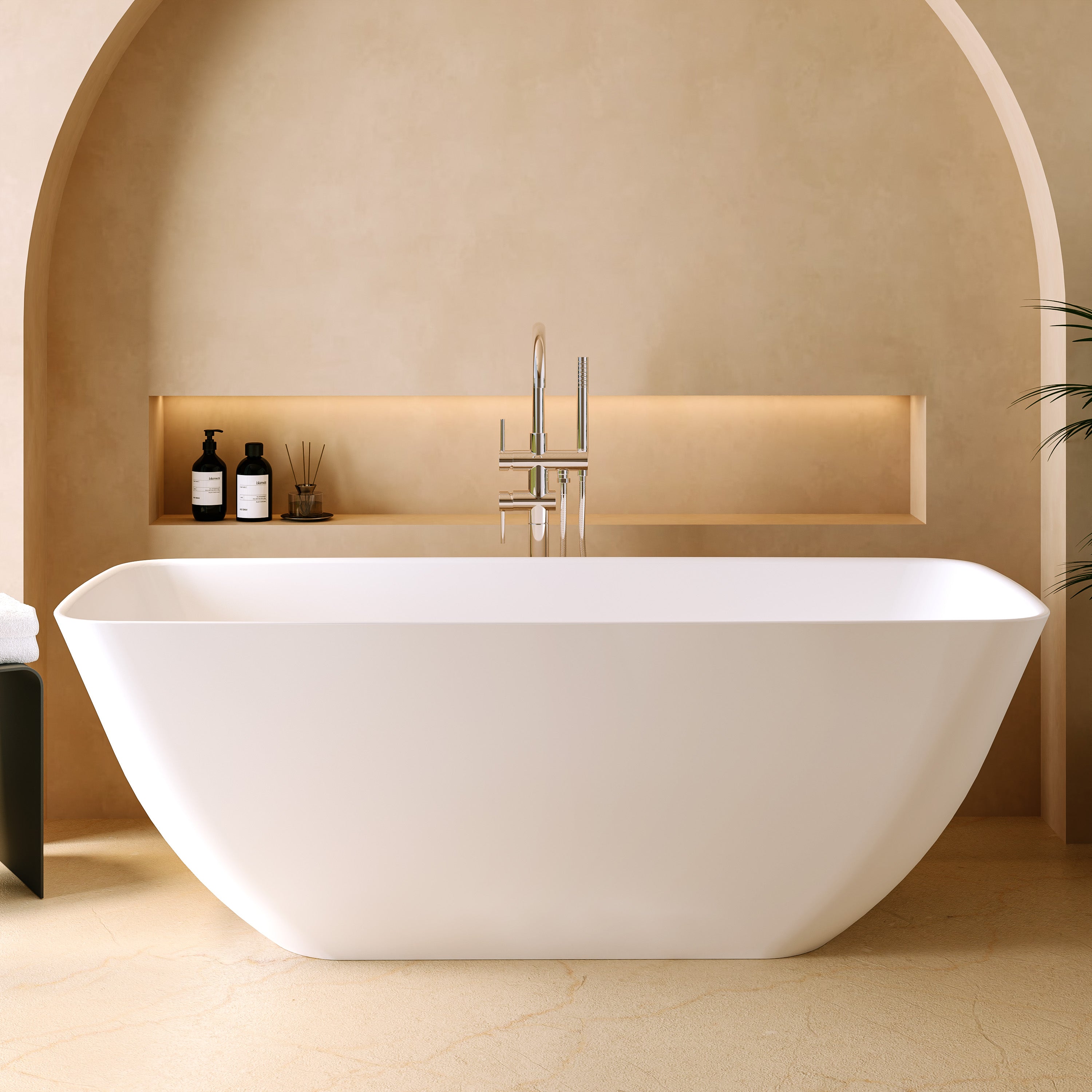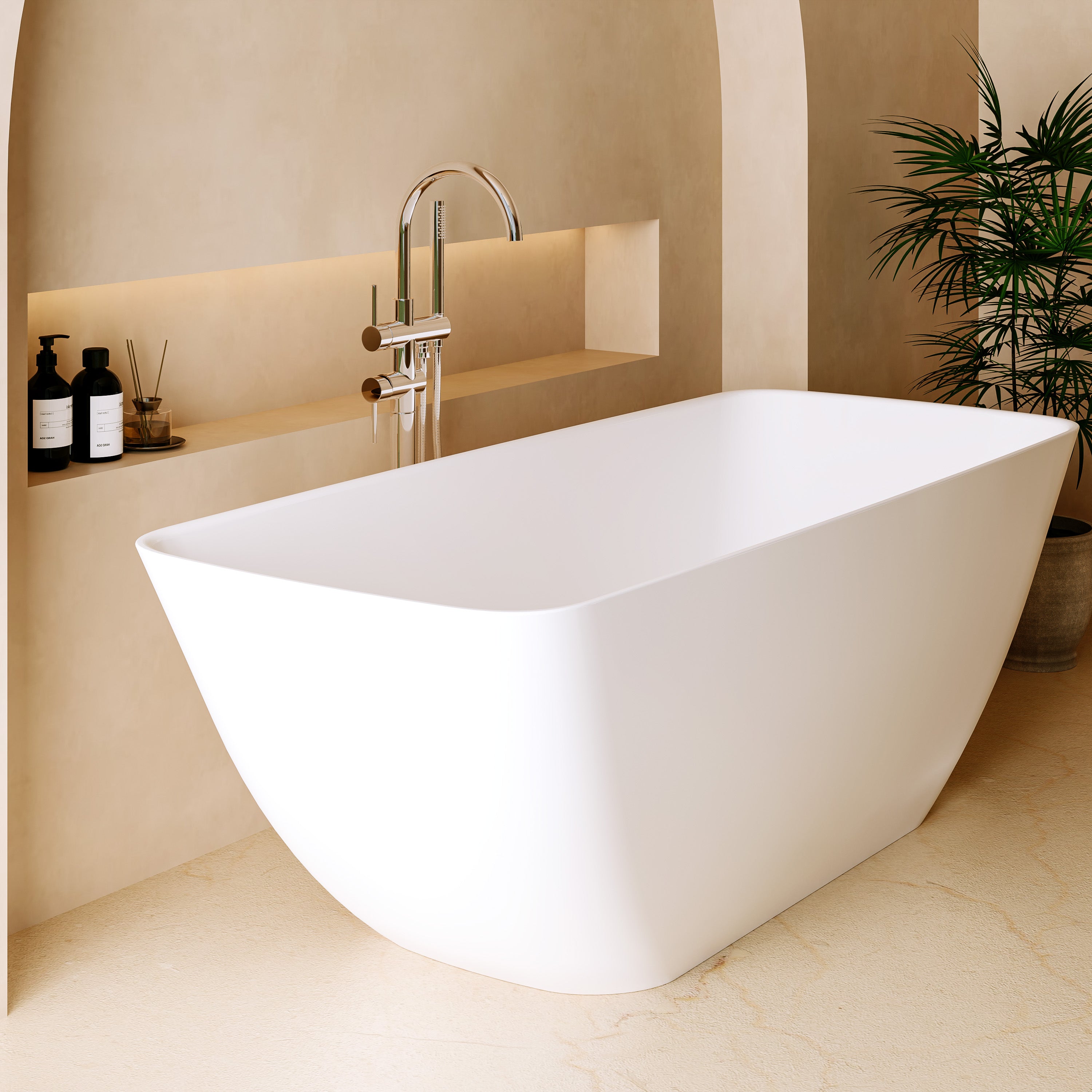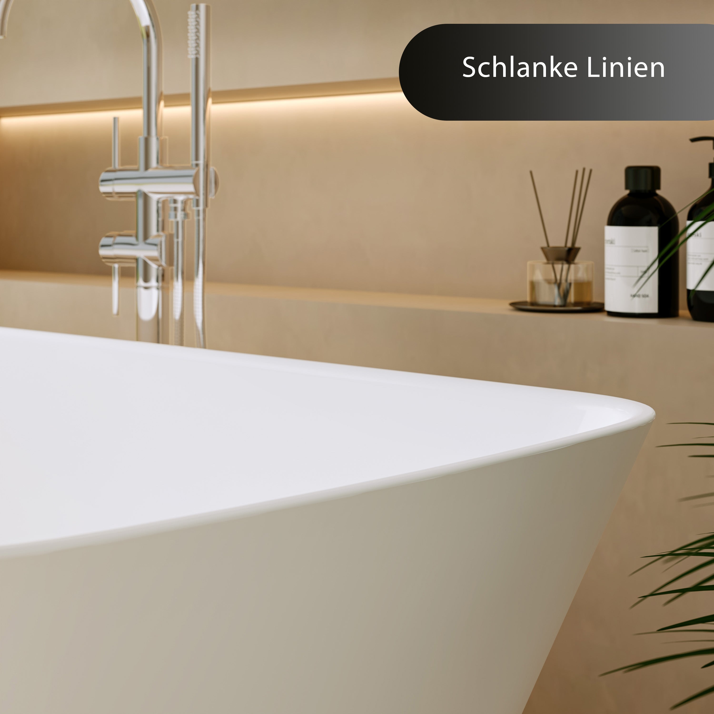 Die freistehende Mineralguss-Badewanne „Curacao“ verbindet klare Linien mit einer elegant zulaufenden eckigen Form, die dem Raum eine moderne Leichtigkeit verleiht. Ihre ruhige, ausgewogene Silhouette lässt die Badewanne freistehend wie ein stilvolles Designobjekt wirken – minimalistisch, zeitlos und zugleich warm in der Ausstrahlung.
