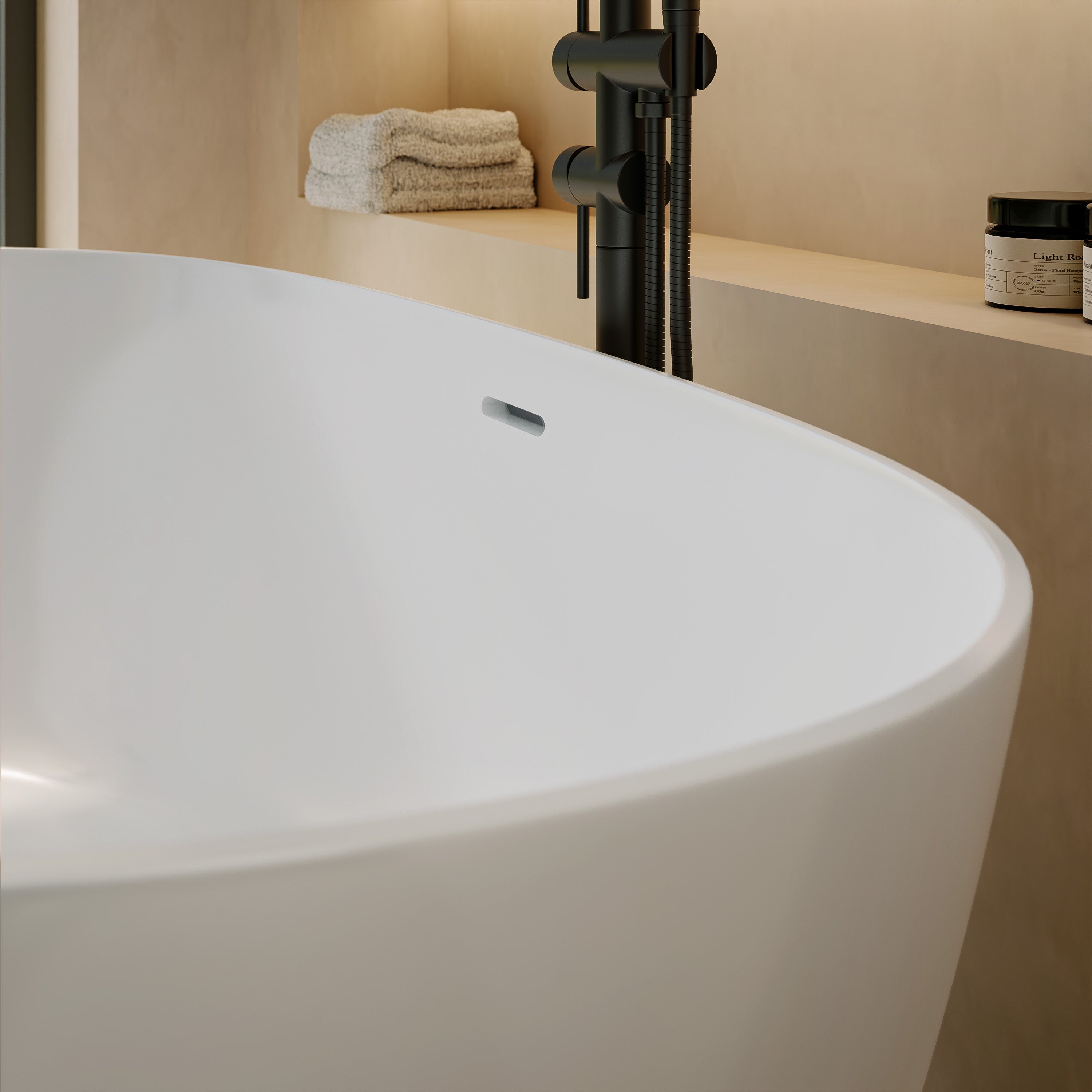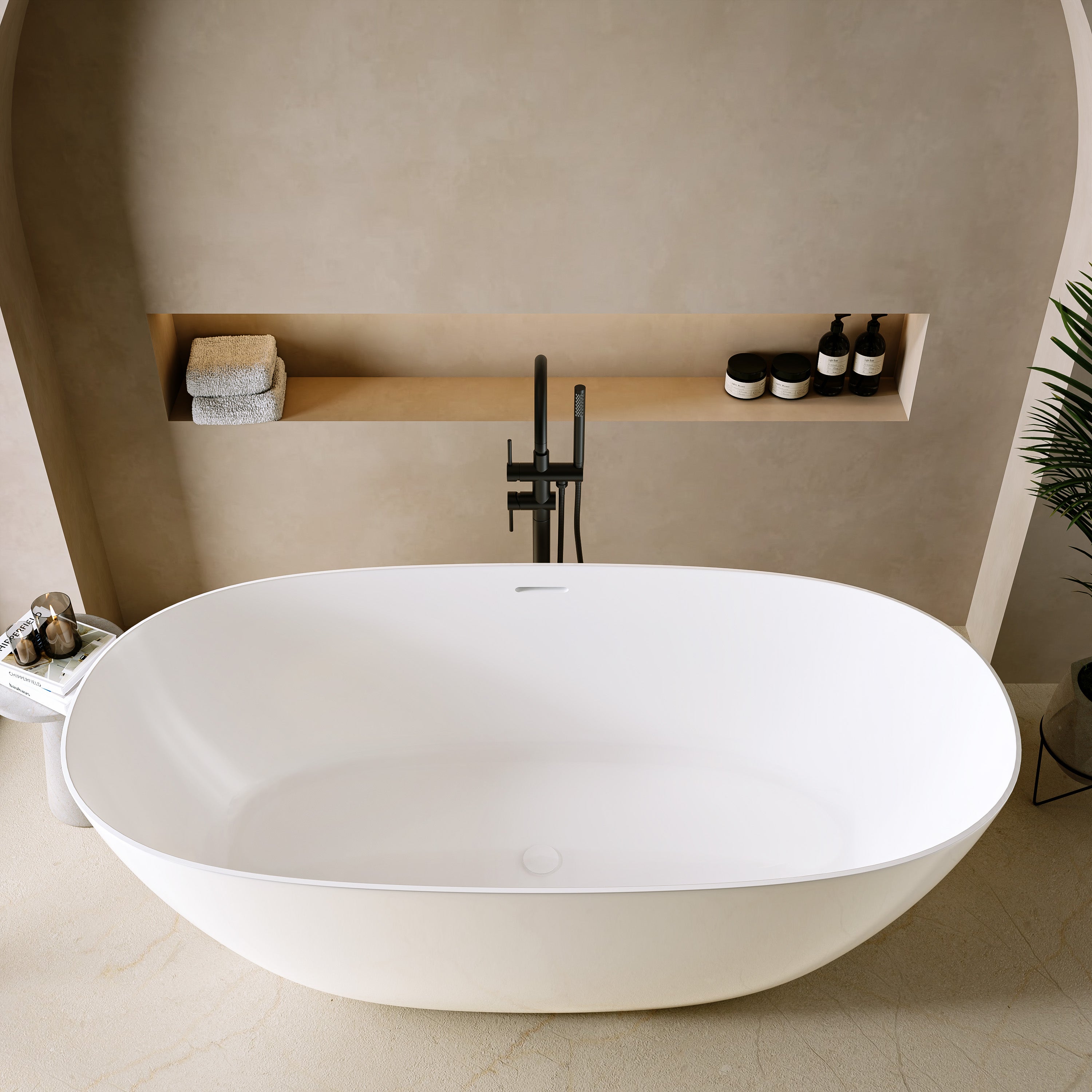 Die ovale Form mit sanfter Verjüngung zum Boden verleiht der freistehenden Badewanne eine elegante Leichtigkeit. Ein echtes Statement moderner Badarchitektur – stilvoll, harmonisch und formvollendet aus jedem Blickwinkel