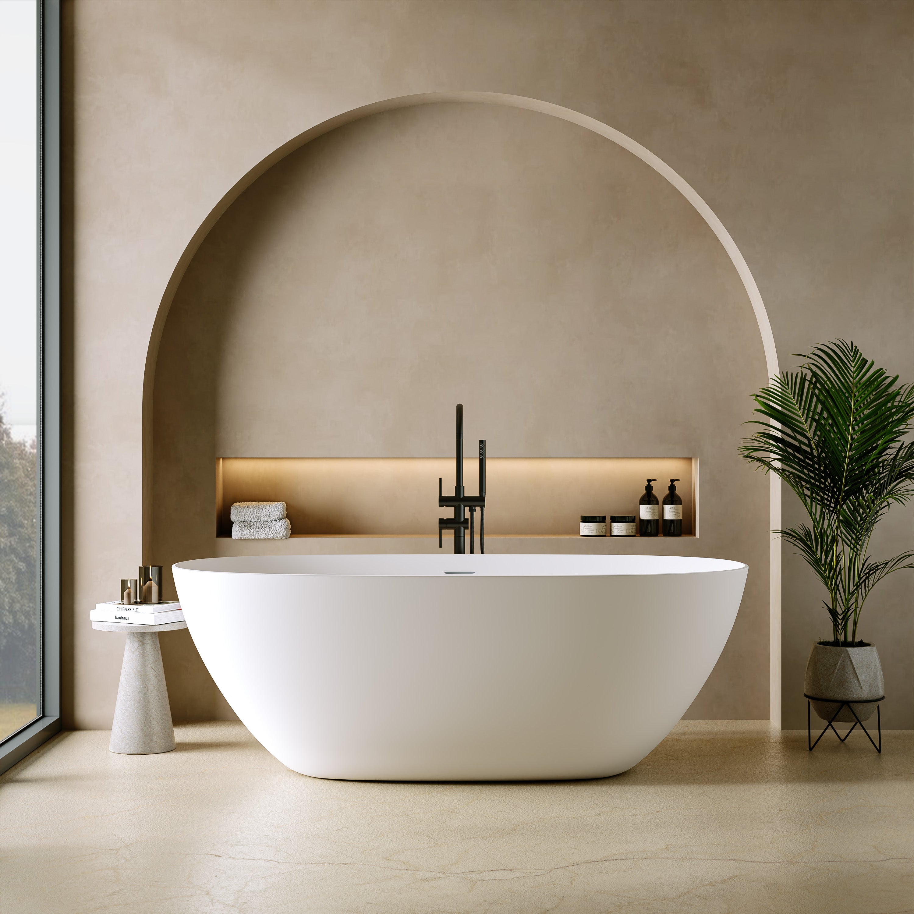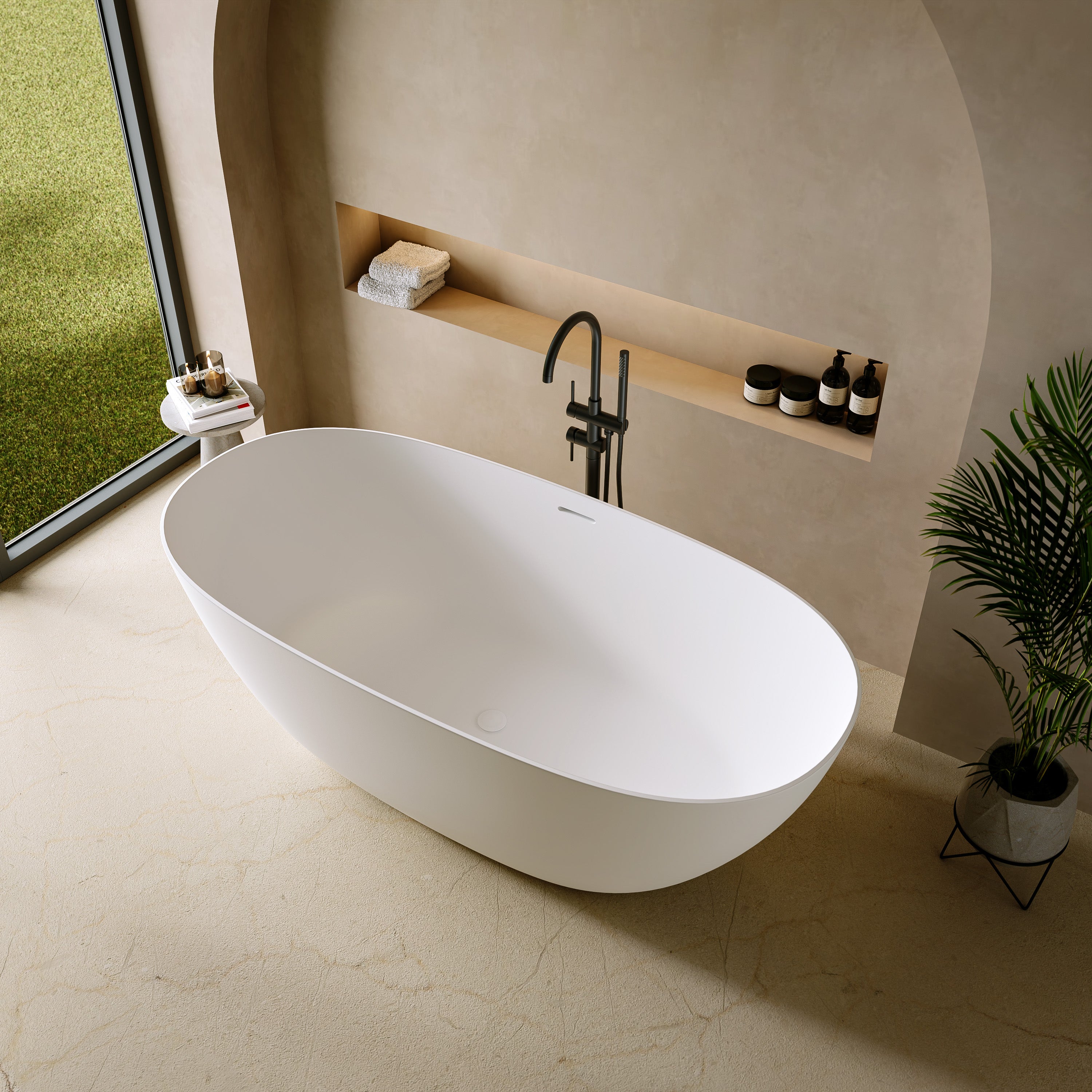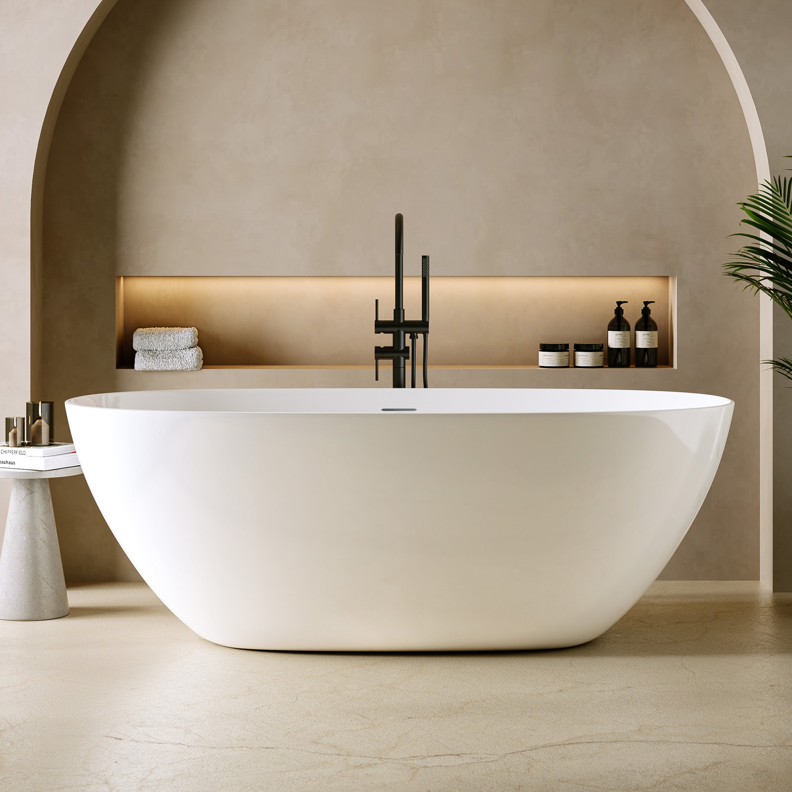 Die „Capri“ Badewanne überzeugt durch ihr weich geschwungenes, ovales Design, das sich harmonisch zum Boden hin verjüngt und eine zeitlose Leichtigkeit ausstrahlt. Ihr fließendes, symmetrisches Design wird zum Blickfang in jedem modernen Badezimmer