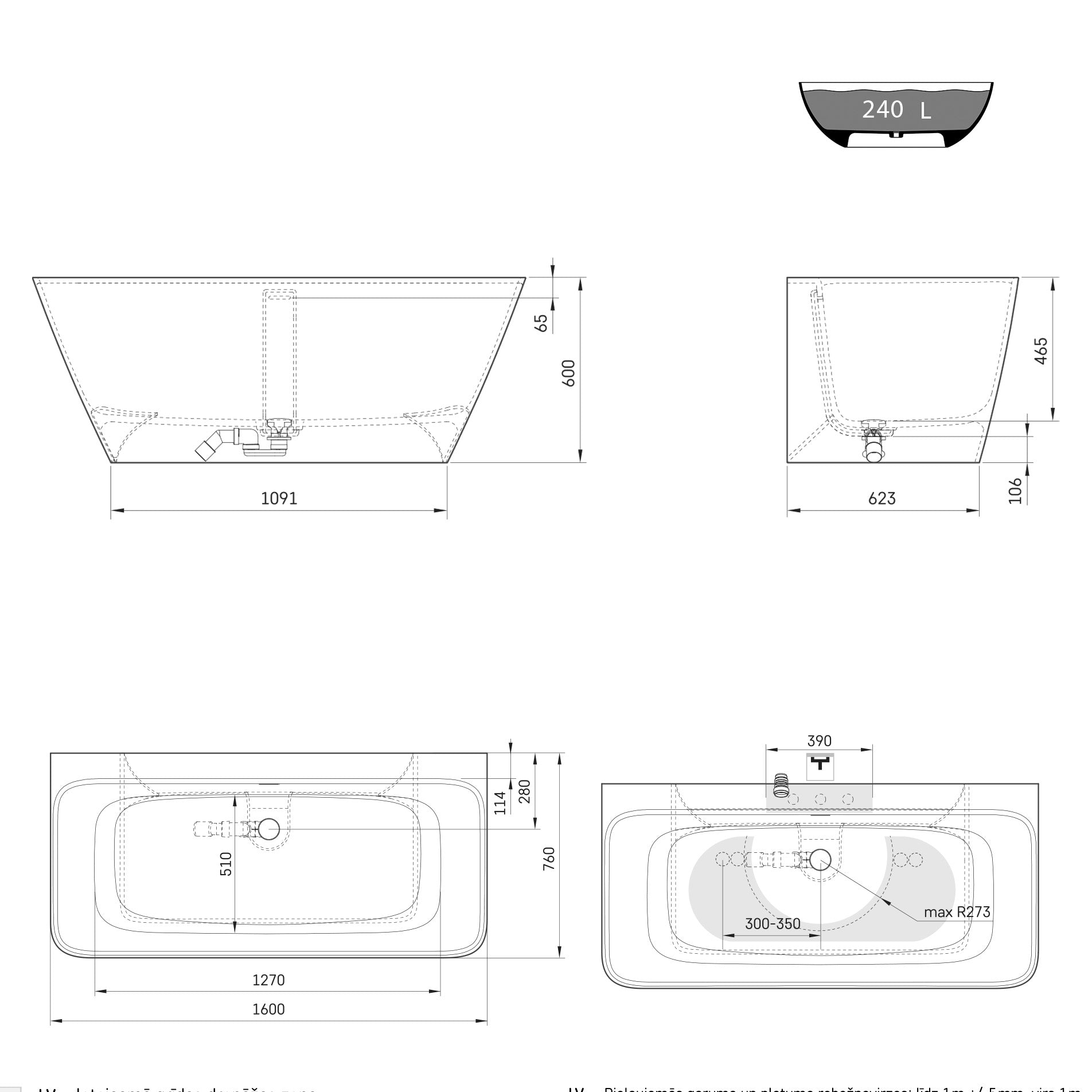 Die Badewanne hat ein Außenmaß von 160 × 76 cm und eine Höhe von 60 cm. Durch die gerade Rückseite kann sie direkt an der Wand aufgestellt werden.