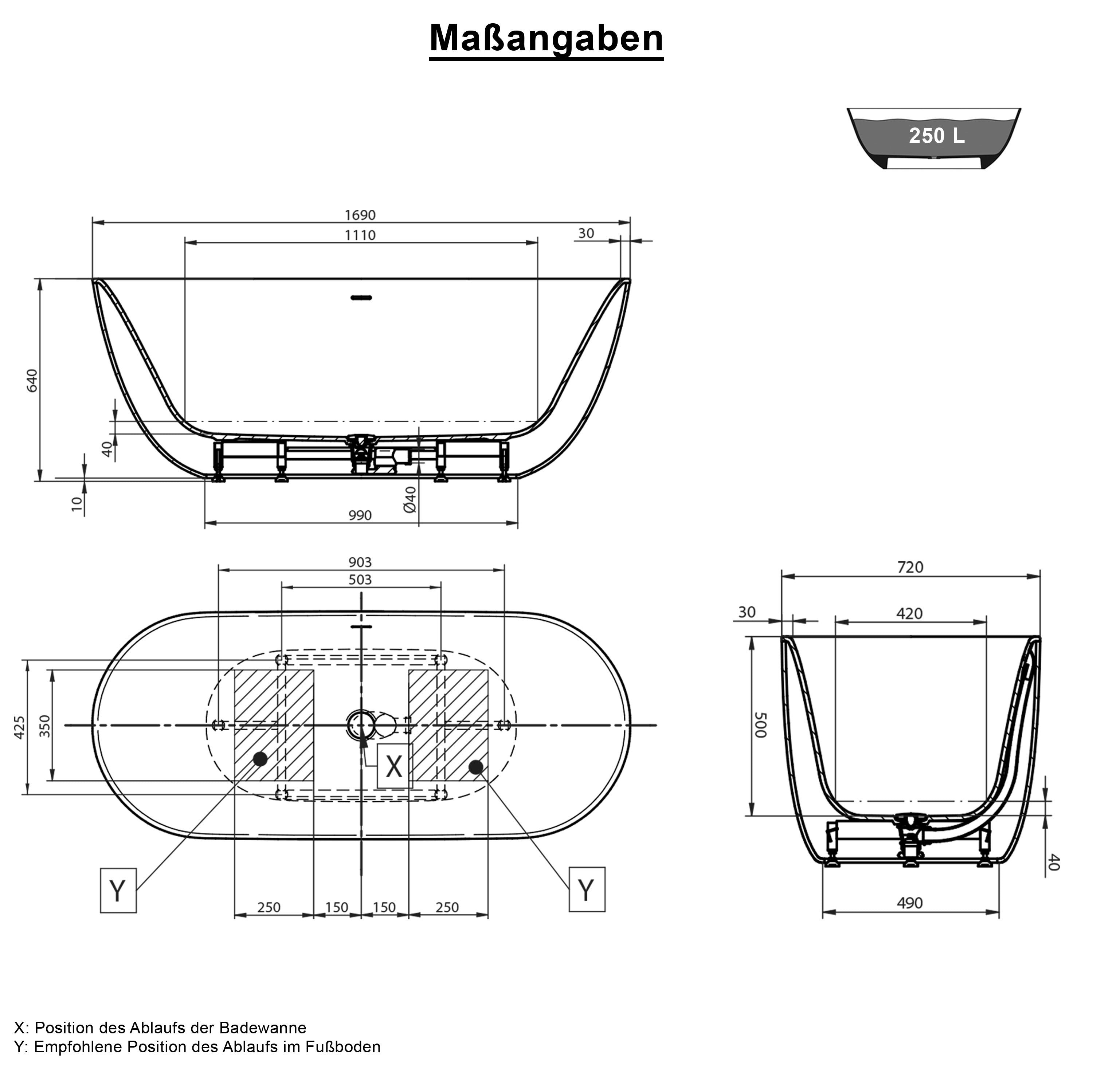 Dolvhin® Freistehende Badewanne „Kalua“ | XONYX Solid Stone Mineralguss | Oval | 169x72x64 cm