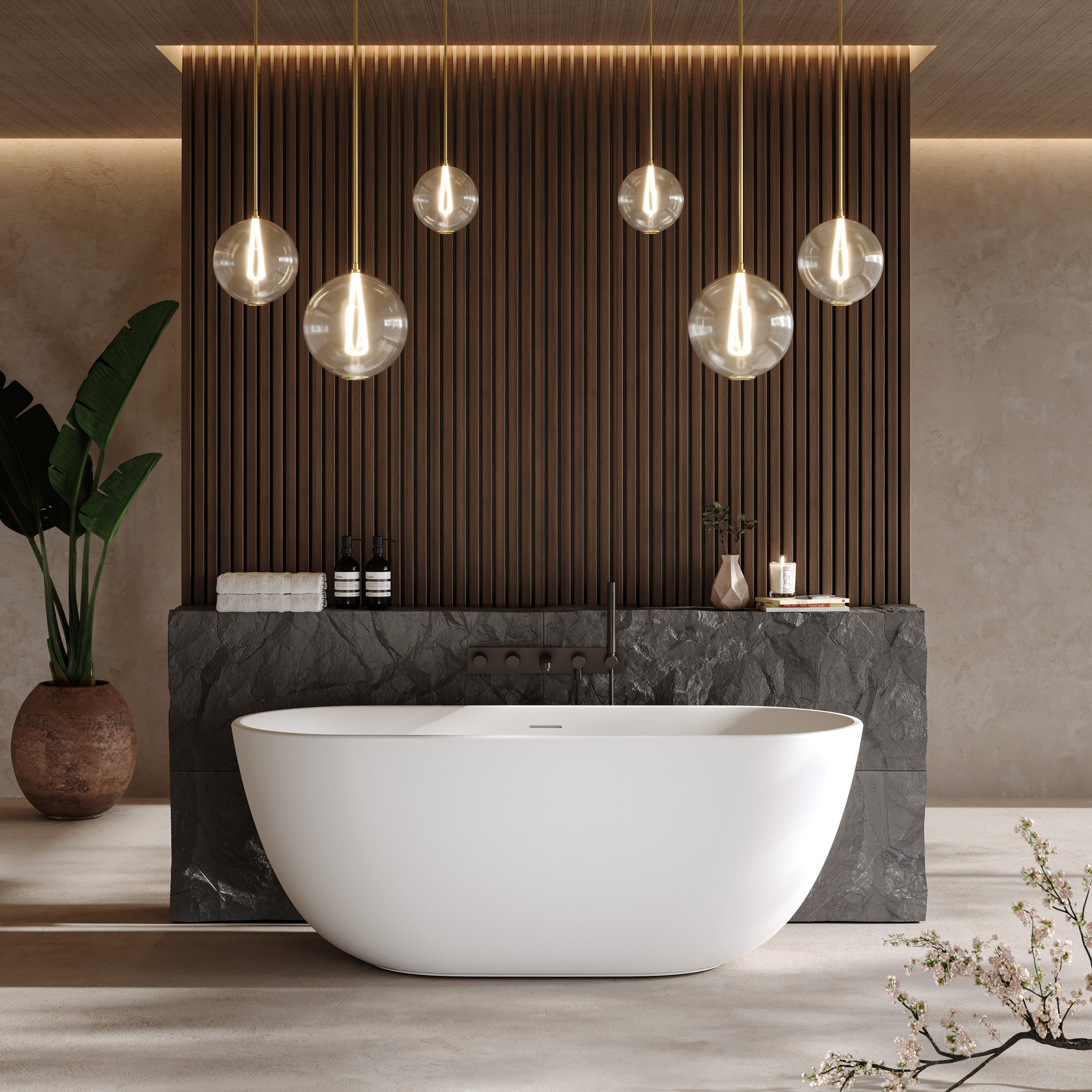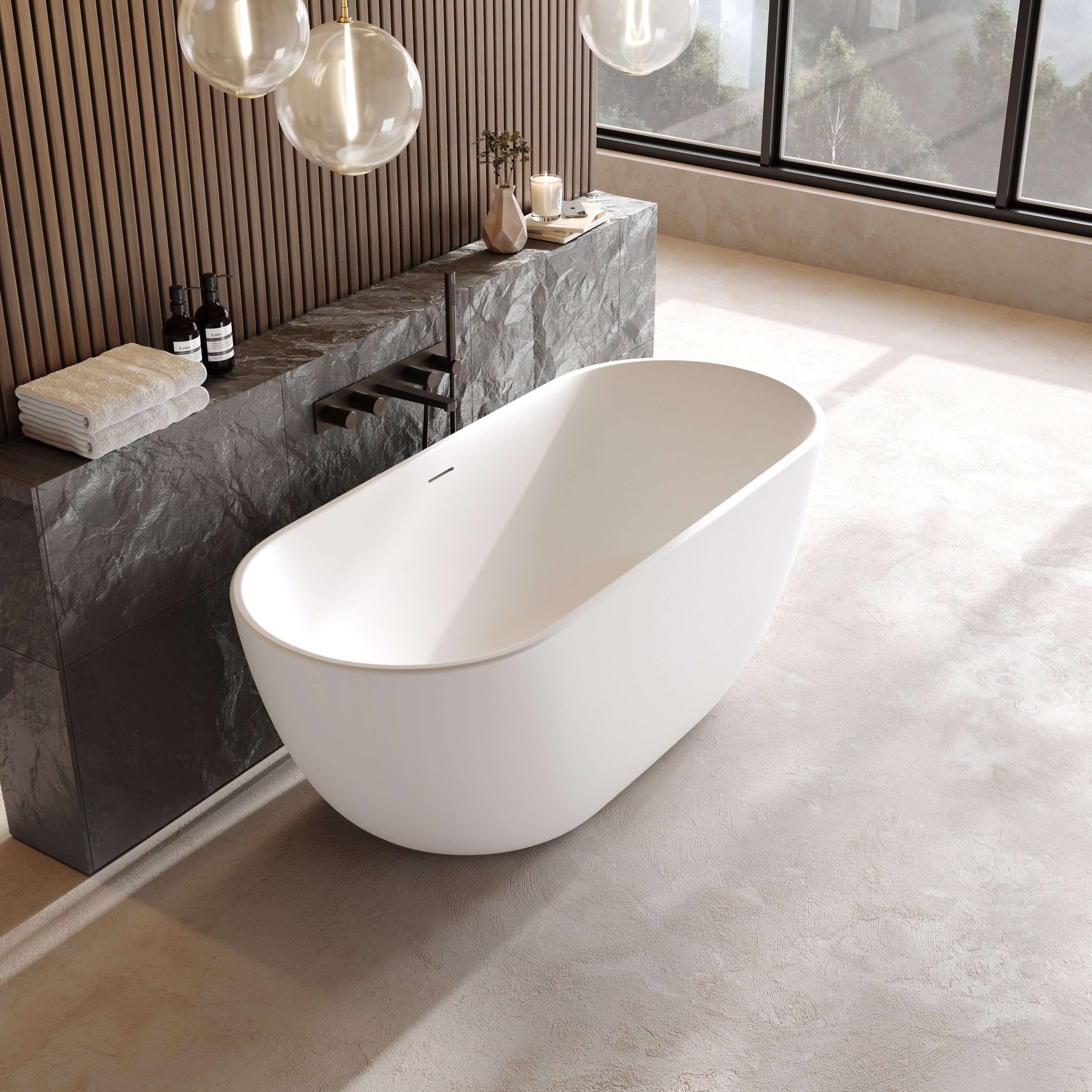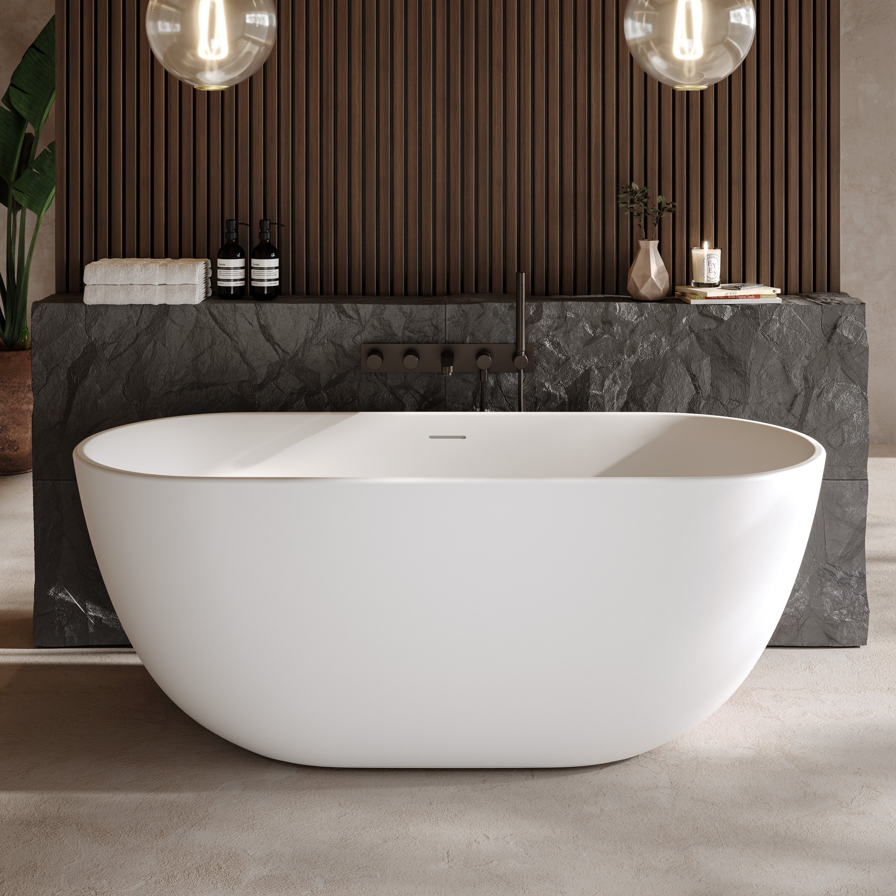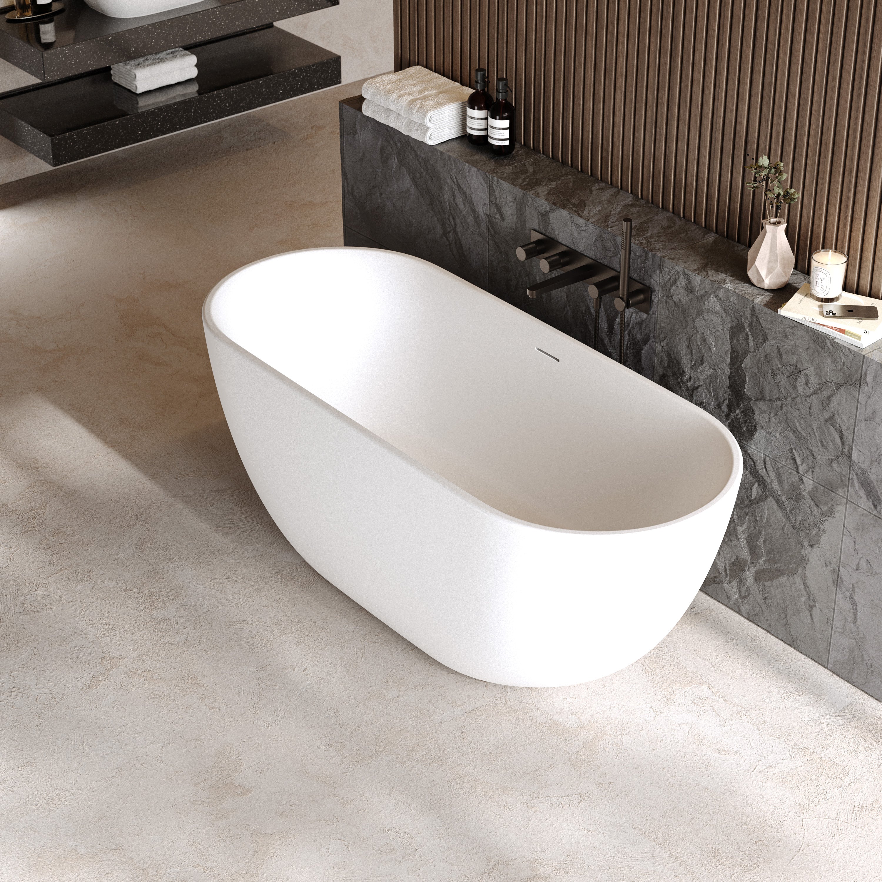 Die freistehende Badewanne „Kalua“ aus XONYX™ Solid Stone Premium Mineralguss besticht durch ihre sanft gespannte Linienführung und eine harmonisch geformte Silhouette, die Ruhe und Präsenz zugleich ausstrahlt. Die fließenden Übergänge und die ausgewogene Ovalform verleihen dem Bad eine elegante Leichtigkeit und machen die Wanne zum selbstverständlichen Mittelpunkt des Raums.