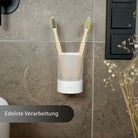Damit der Zahnputzbecher nicht nur optisch beeindruckt, haben wir einen speziellen Noppen-Ring für die Zahnbecher Halterung entwickelt. Dadurch lässt sich der Zahnbürstenbecher super einfach einsetzen und bleibt beständig in der Halterung. Nichts wird zerkratzt und kein nerviges Wackeln oder herausfallen.