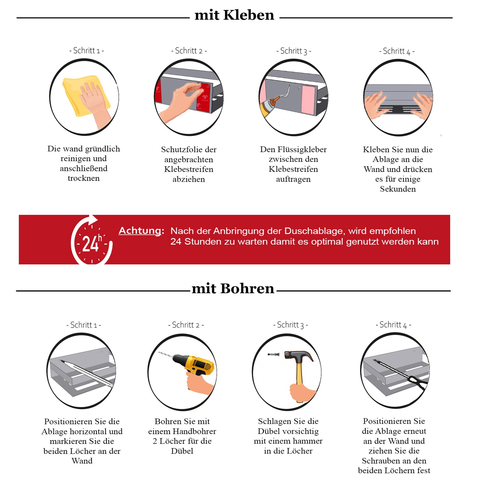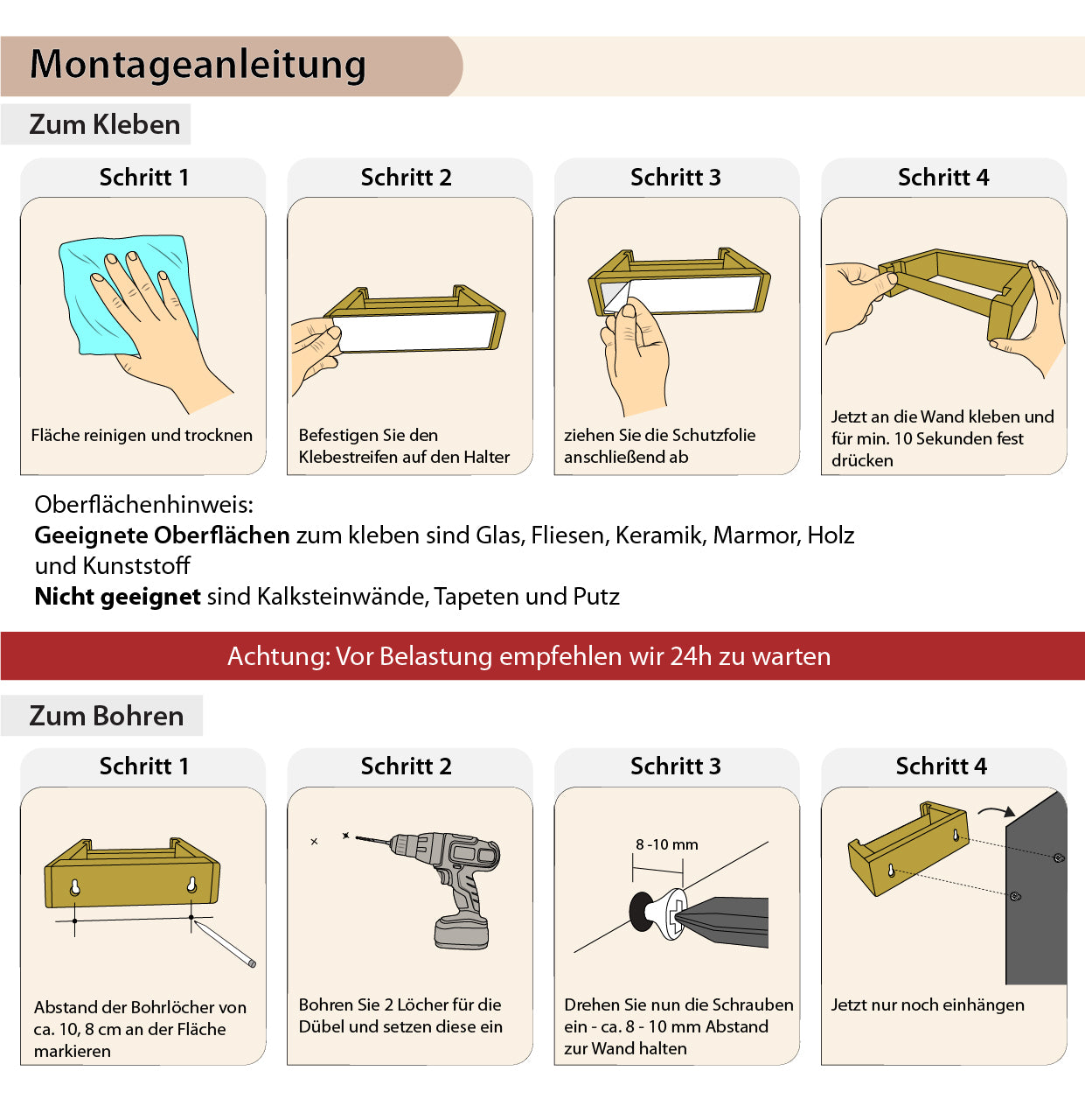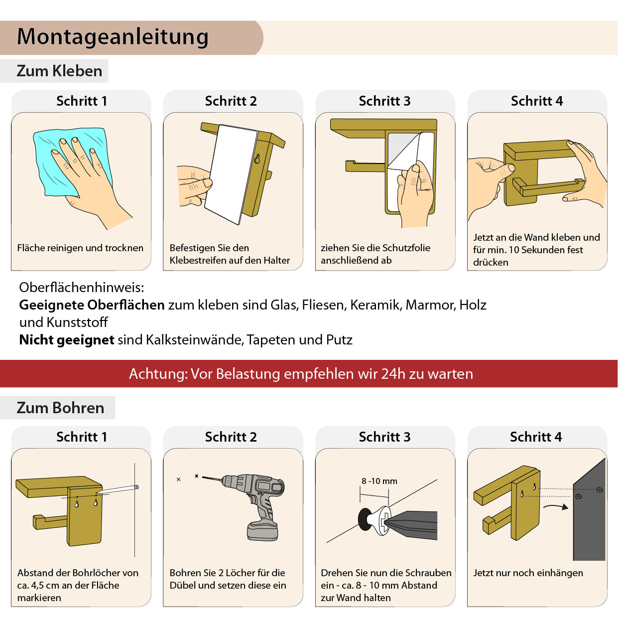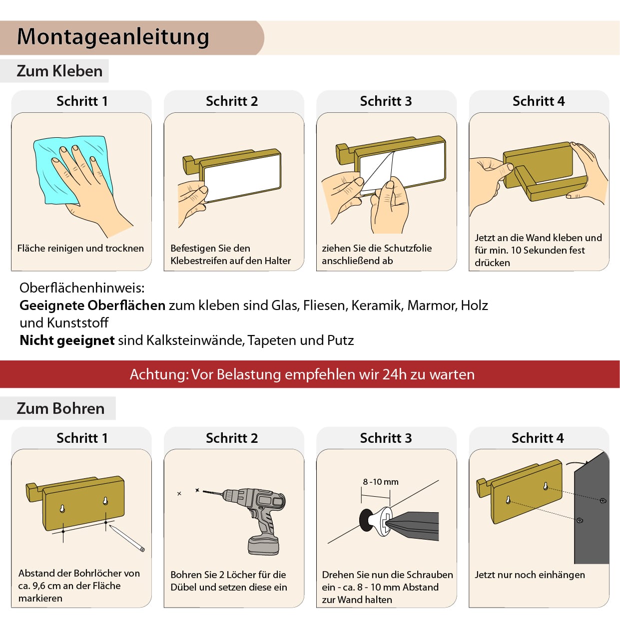 Kleben statt bohren! Leicht und in wenigen Sekunden angebracht halten unsere Zahnputzbecherhalter auf allen glatten Oberflächen. Den 3M Klebestreifen anbringen, abziehen, ankleben, fertig. Eine genaue Schritt-für-Schritt-Anleitung als auch Klebehinweise findest du in der Produktbeschreibung. Des Weiteren wird auch eine bebilderte Montageanleitung deiner Bestellung beigelegt.