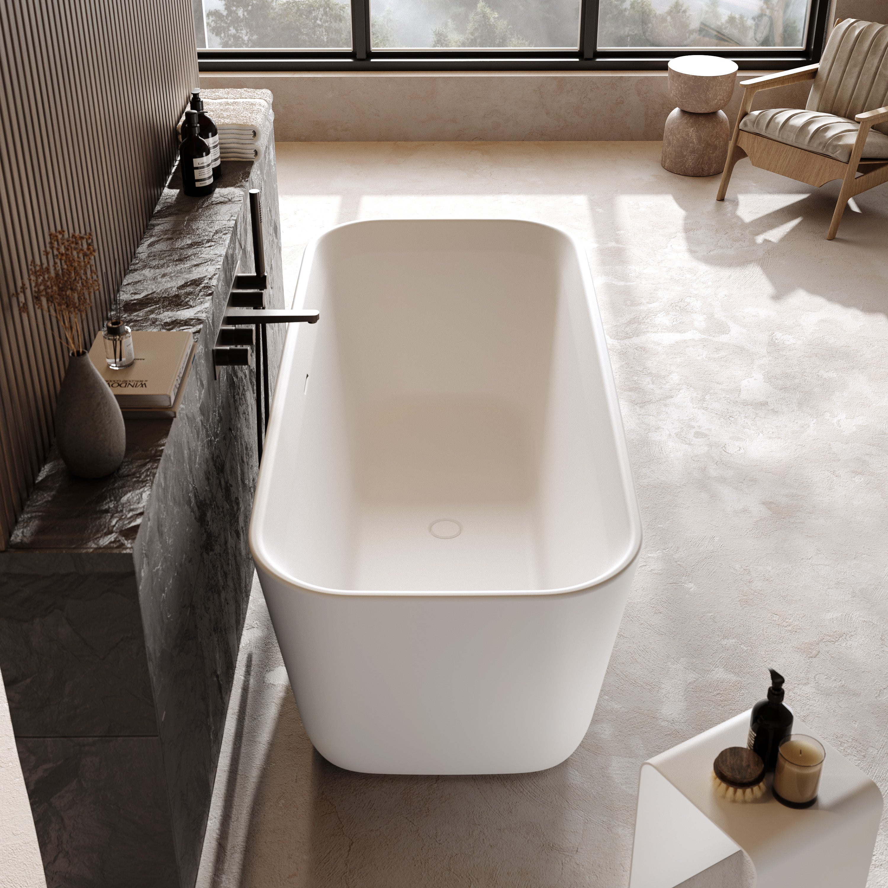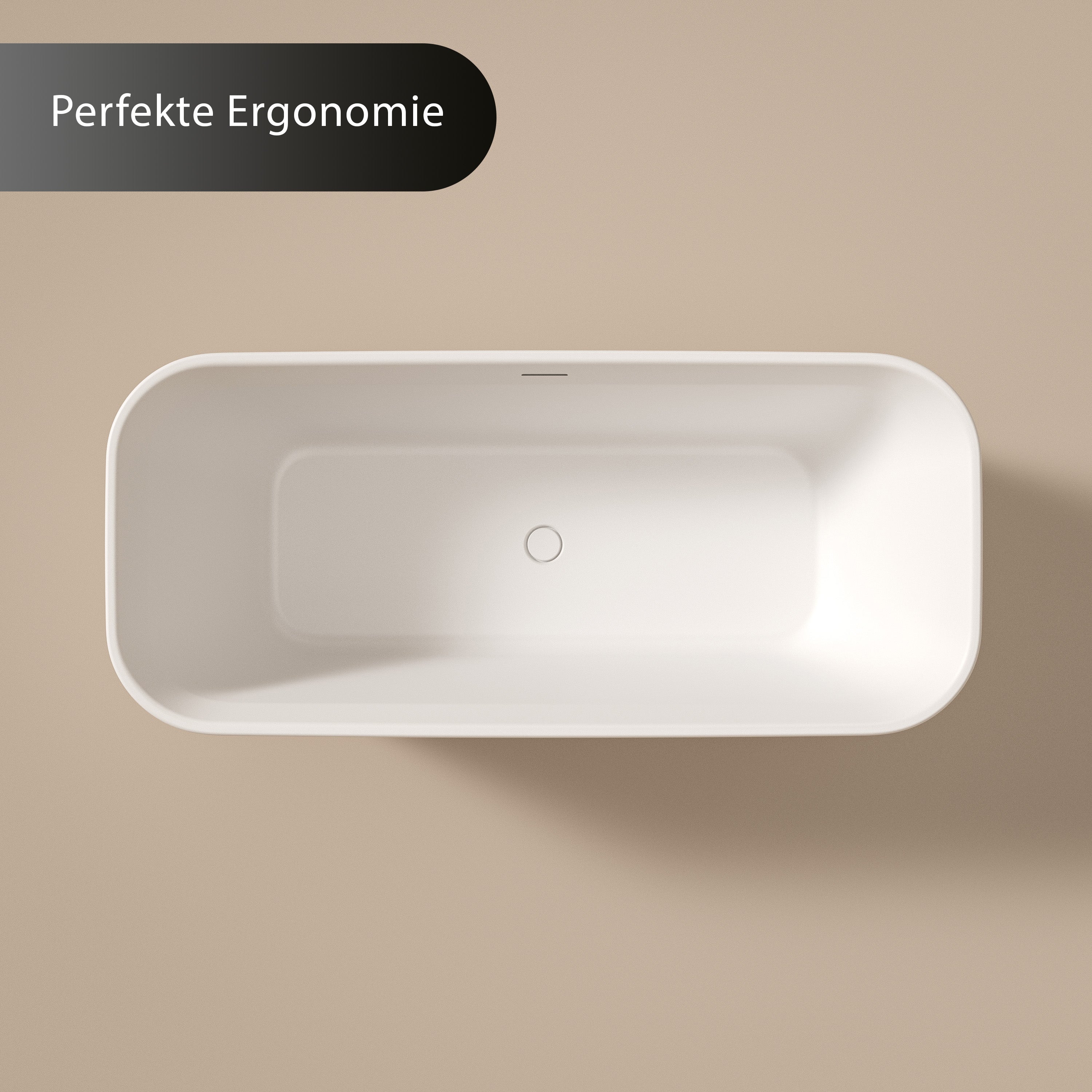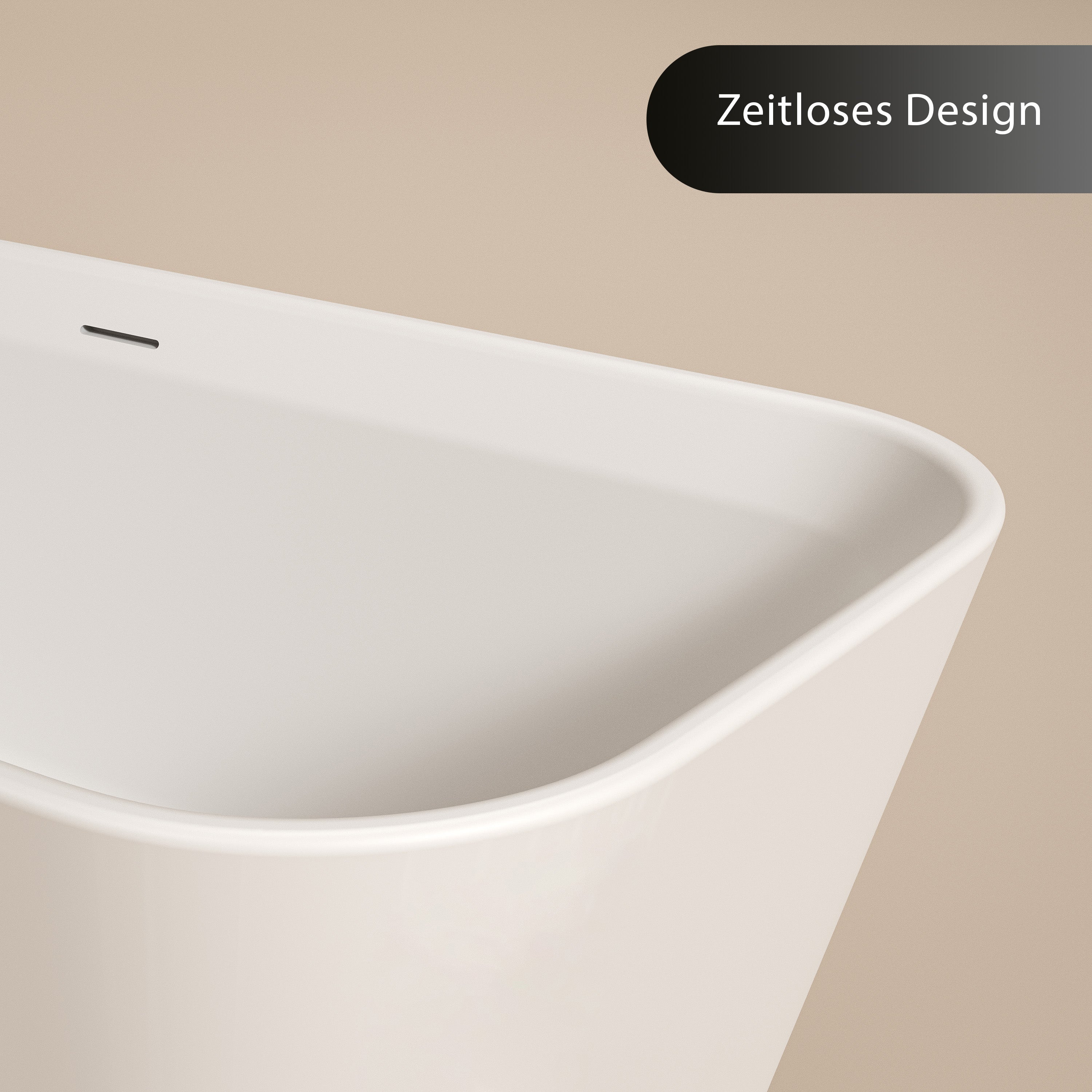 Der massive Mineralwerkstoff vermittelt ein warmes, ruhiges und äußerst hochwertiges Gefühl und unterstützt ein entspanntes Badeerlebnis. Die großzügig ausgeformten Innenflächen bieten angenehmen Liegekomfort und bewahren die klare, hochwertige Anmutung der Badewanne dauerhaft im täglichen Gebrauch.