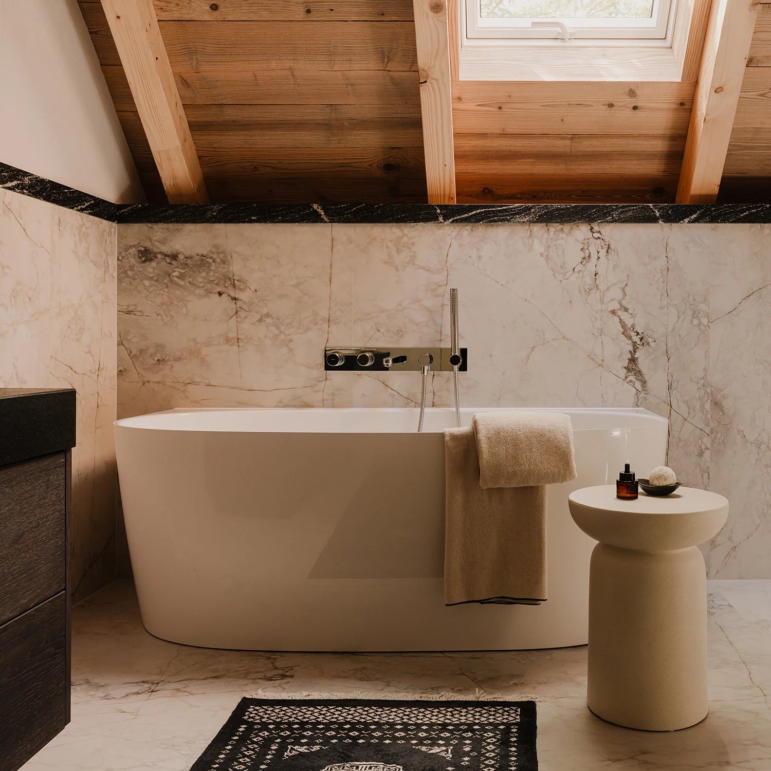 Das Ergebnis: zeitloses Design, clevere Raumnutzung und entspannter Badekomfort – vereint in einer halbfreistehenden Mineralguss Badewanne.