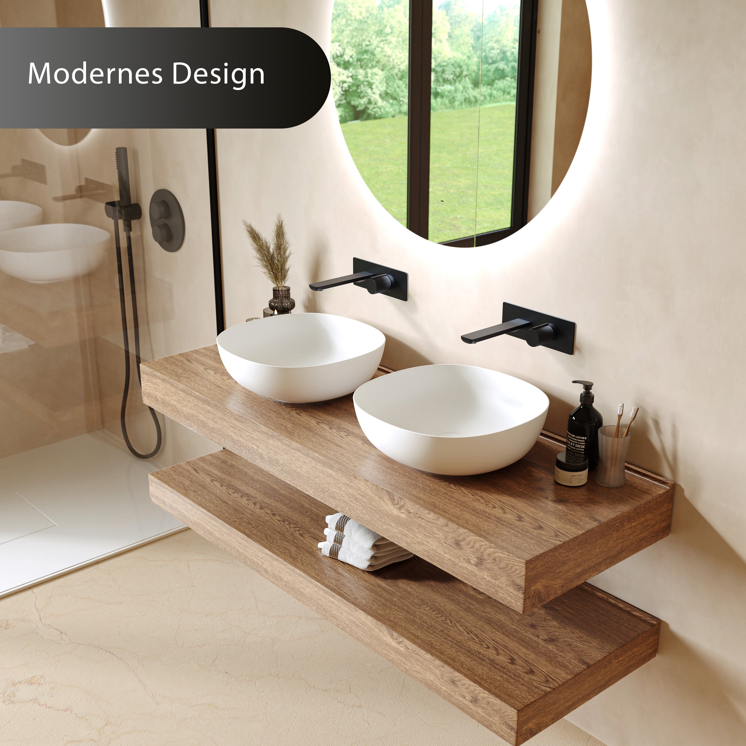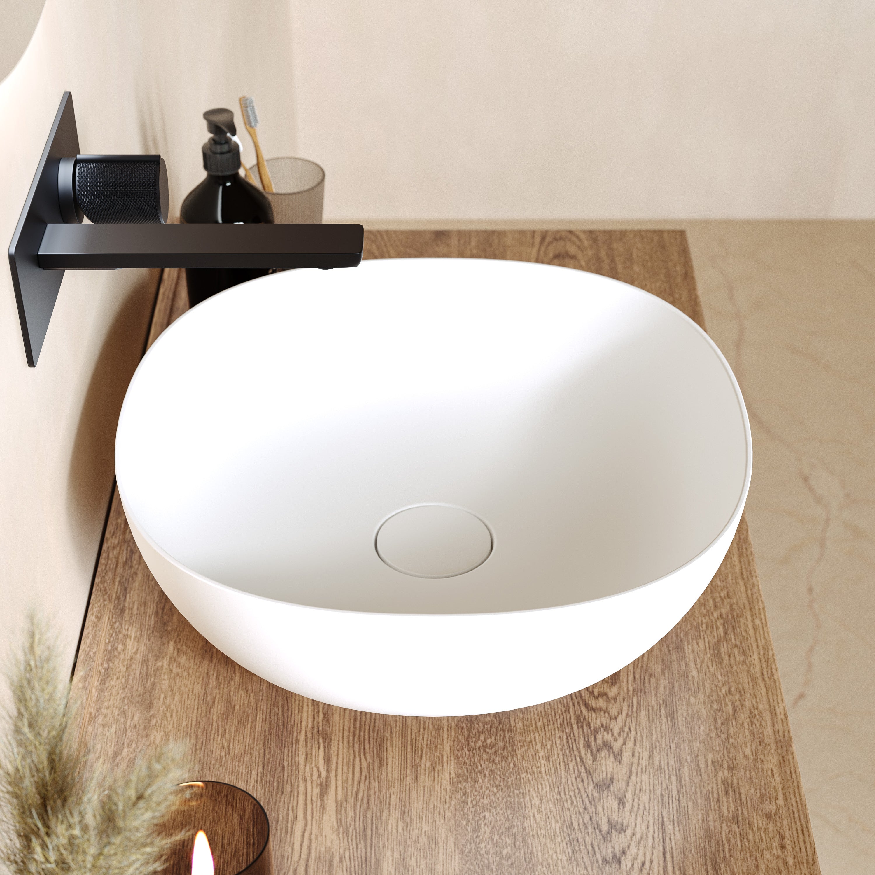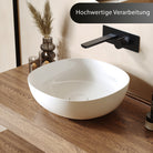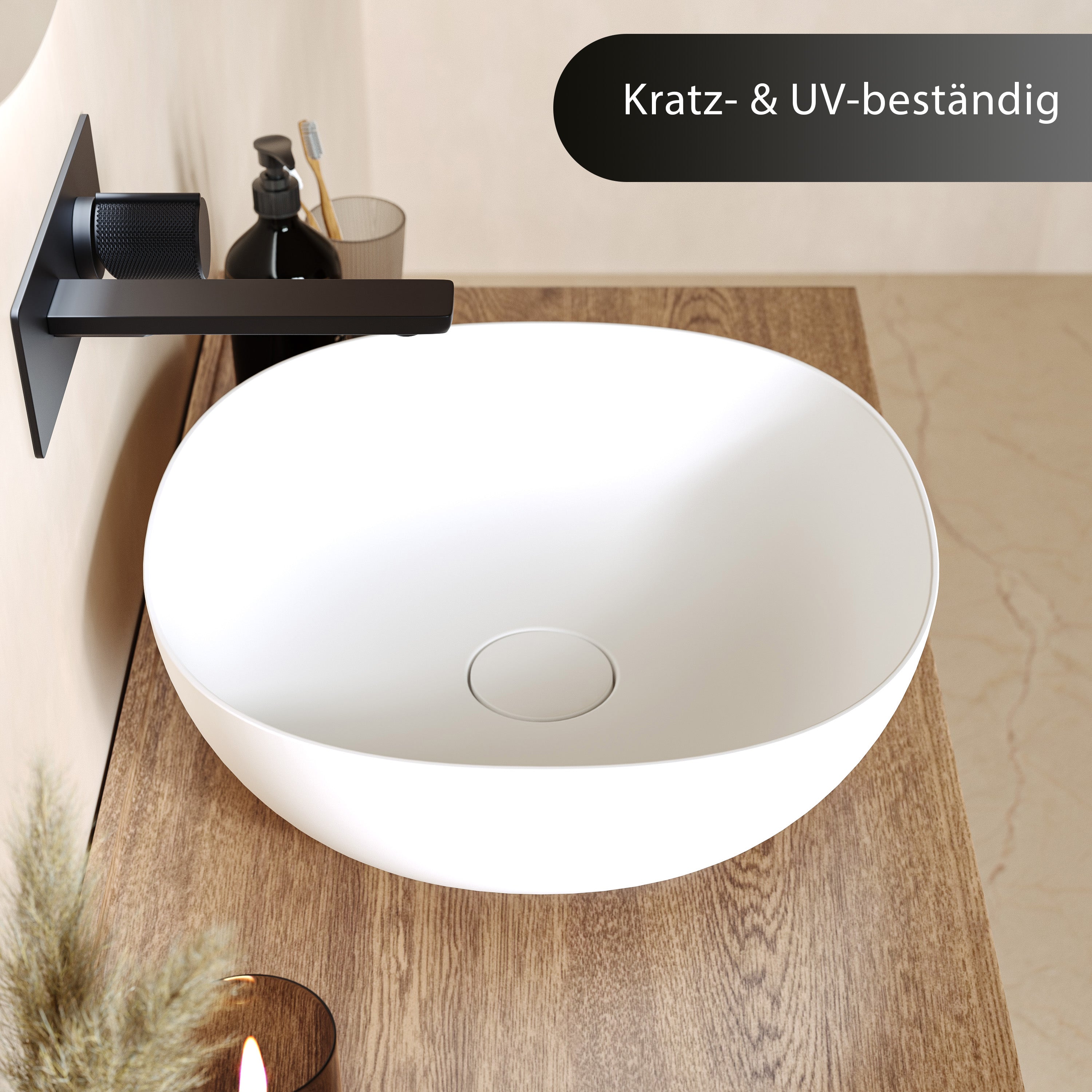 Angenehm warme Haptik: Im Gegensatz zu vielen Keramikbecken fühlt sich das Mineralguss-Aufbauwaschbecken angenehm warm und samtig an. Die Oberfläche schafft ein komfortables, hochwertiges Gefühl beim täglichen Gebrauch und macht jeden Waschtisch spürbar angenehmer.