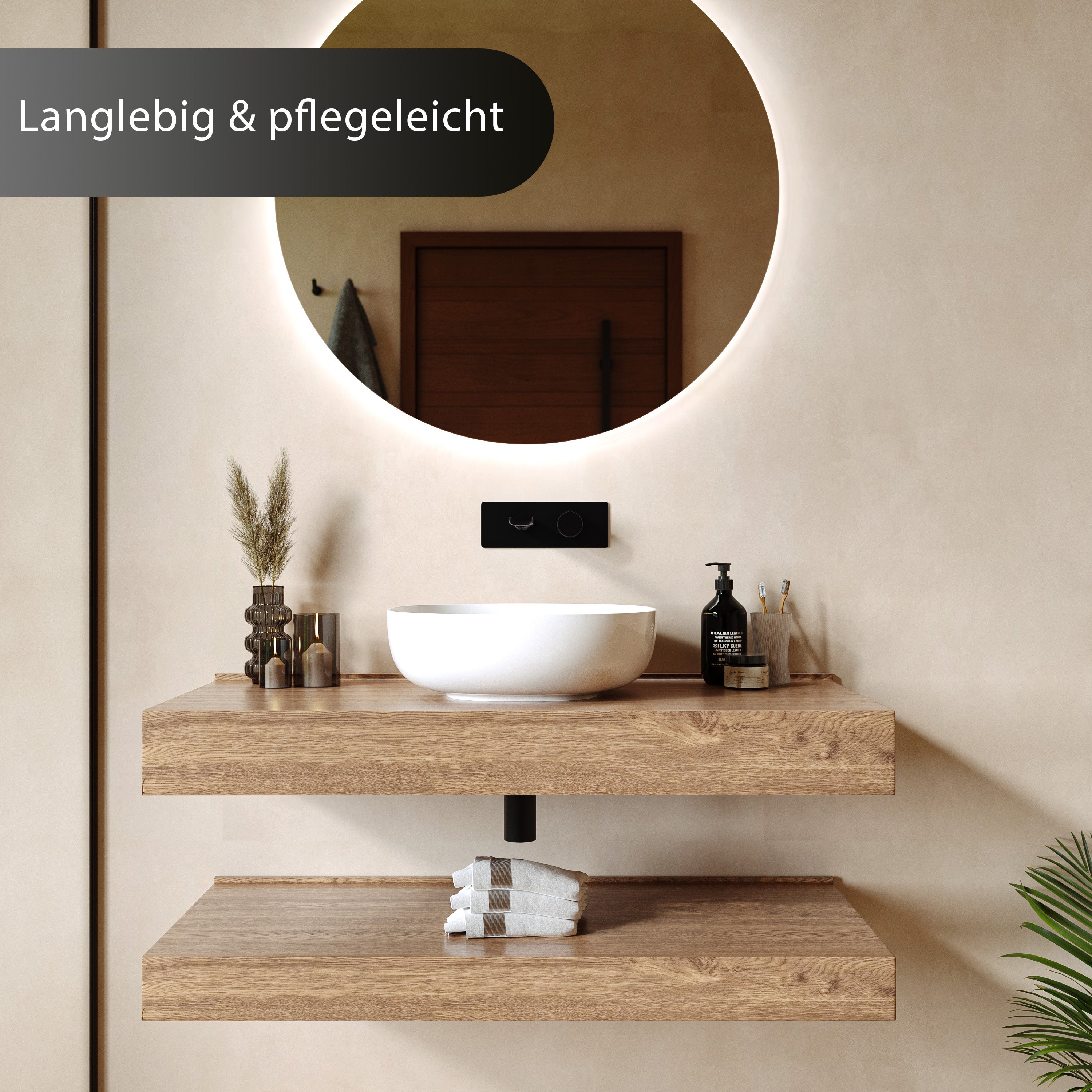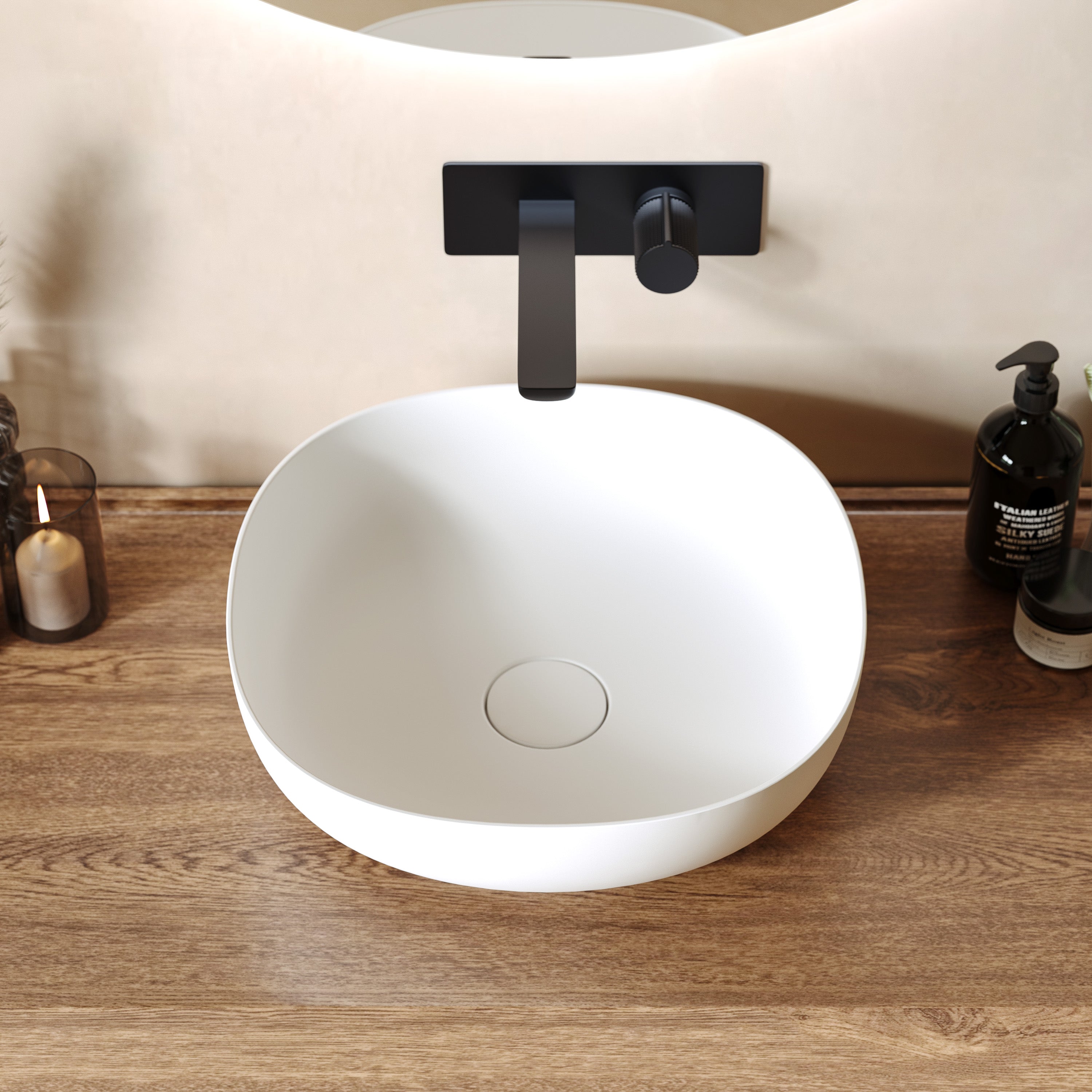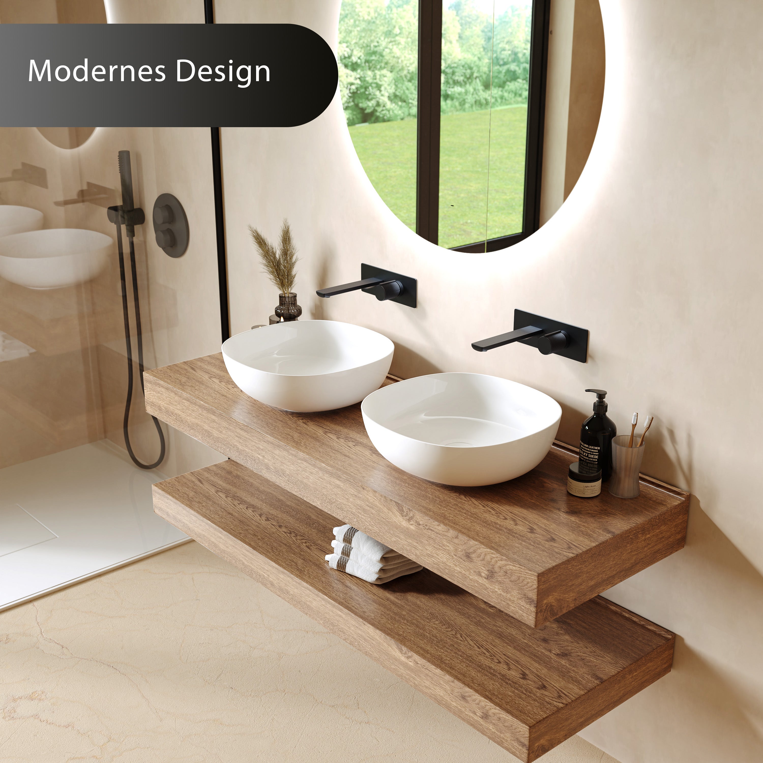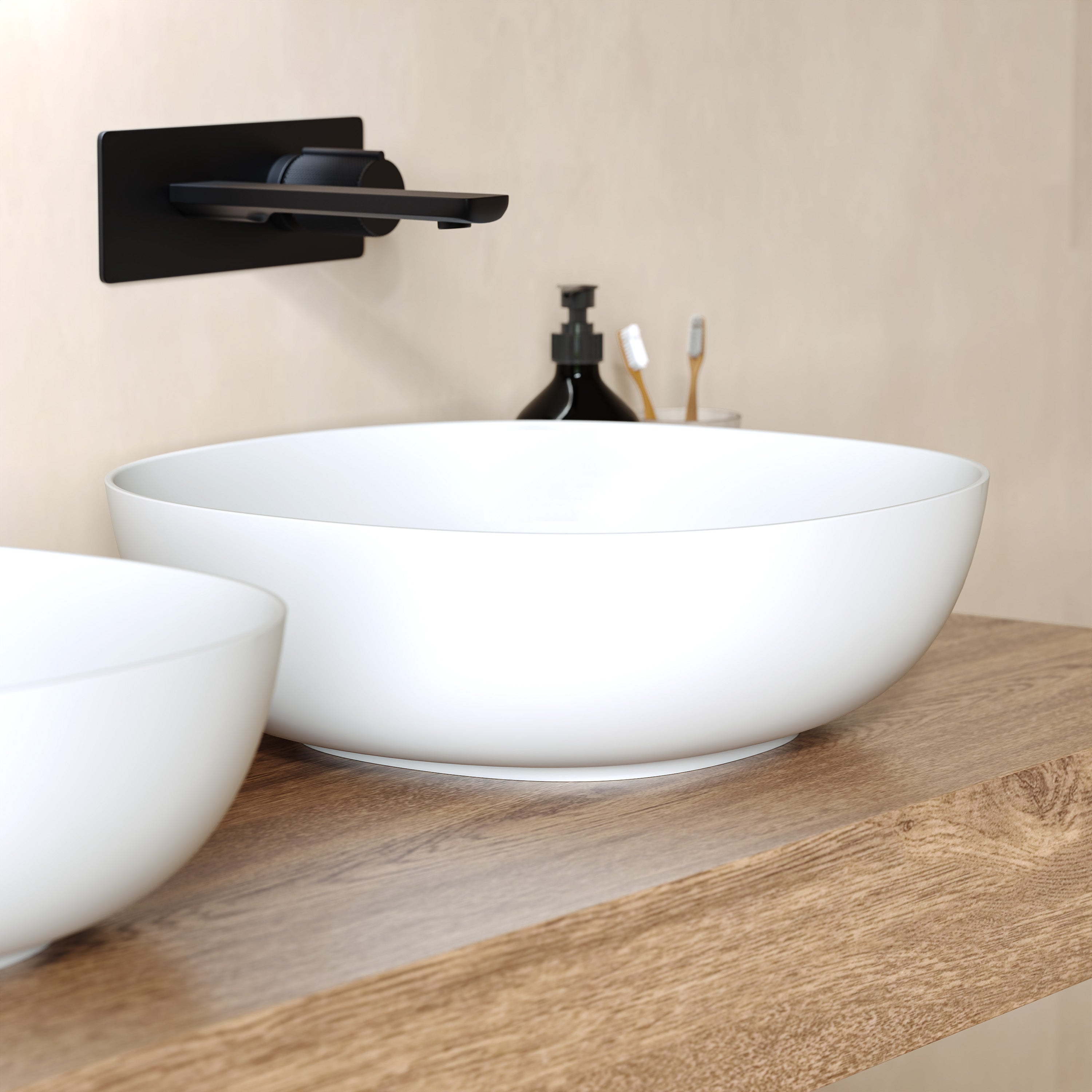 Angenehm warme Haptik: Im Gegensatz zu vielen Keramikbecken fühlt sich das Mineralguss-Aufbauwaschbecken angenehm warm und samtig an. Die Oberfläche schafft ein komfortables, hochwertiges Gefühl beim täglichen Gebrauch und macht jeden Waschtisch spürbar angenehmer.