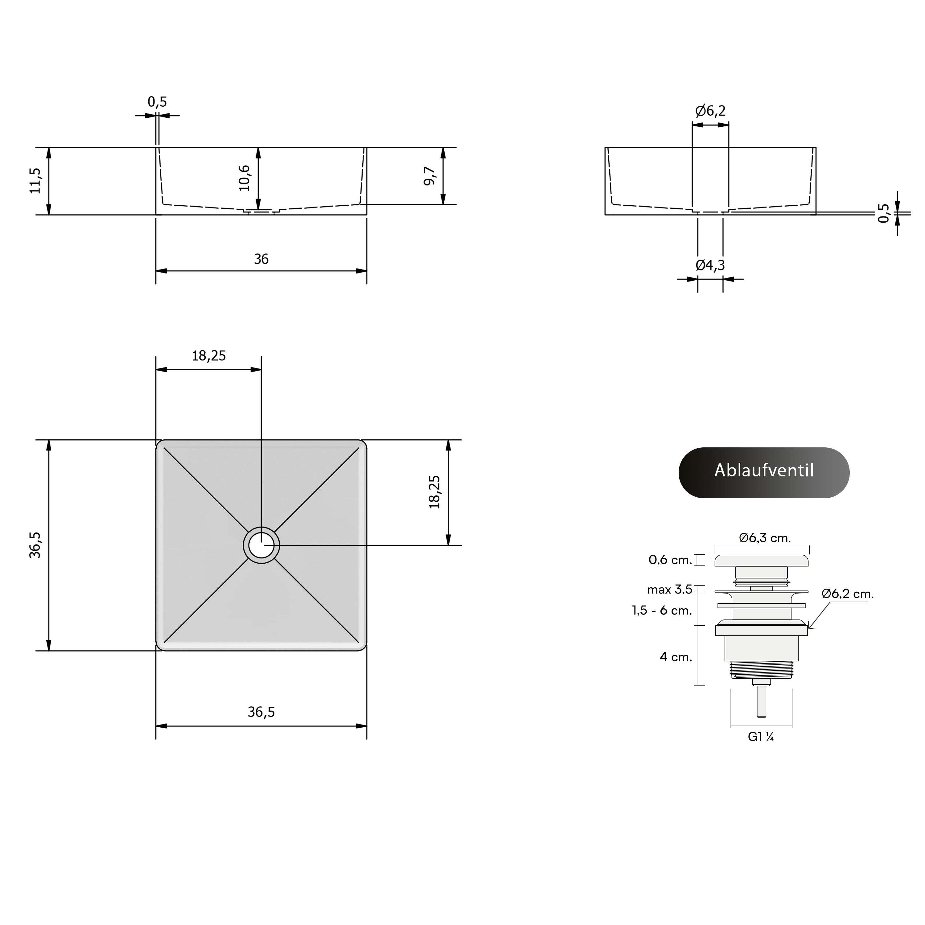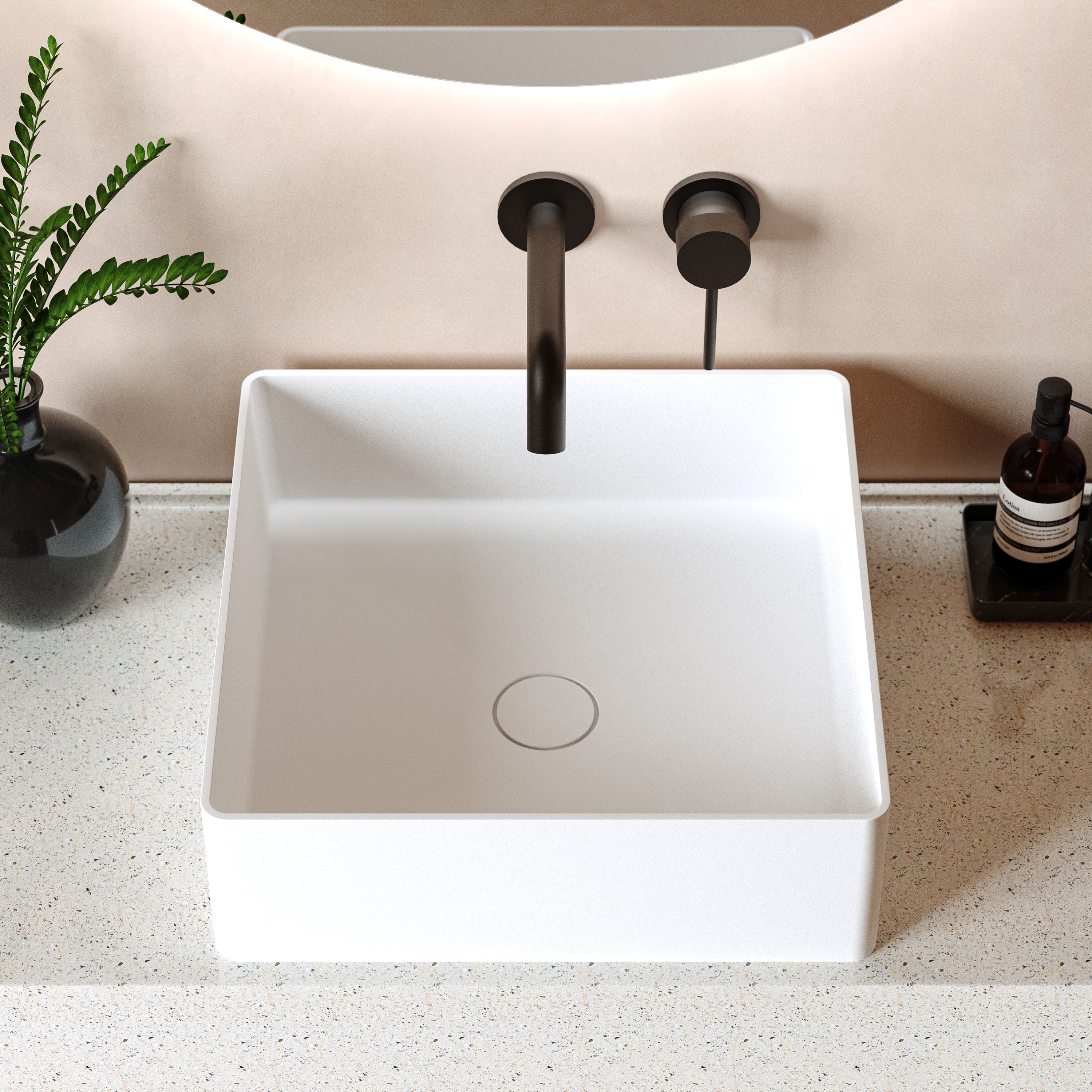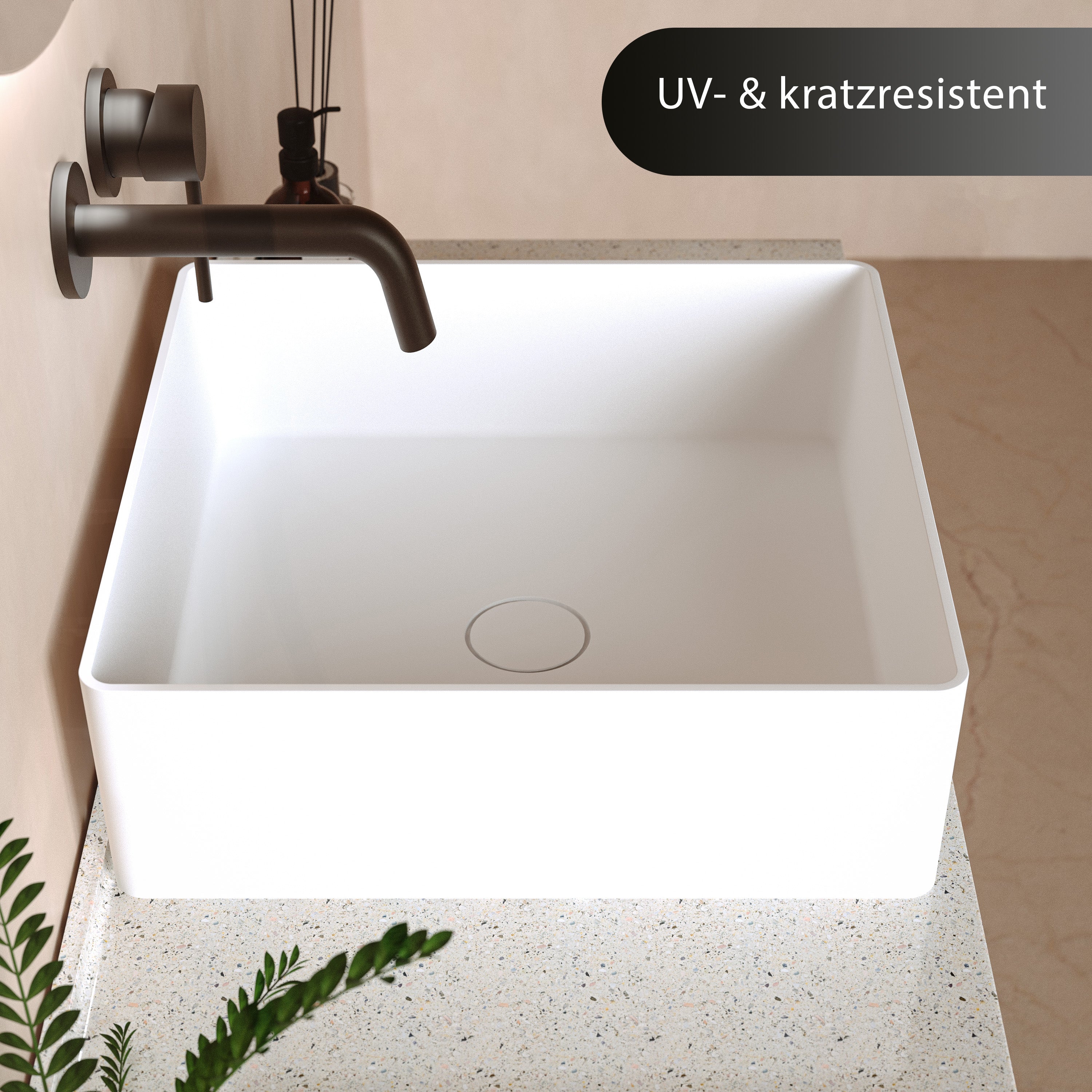 Dolvhin® Aufsatzwaschbecken aus Premium-Mineralguss "Tahi" | Eckig | Weiß Matt | 36x36x11 cm