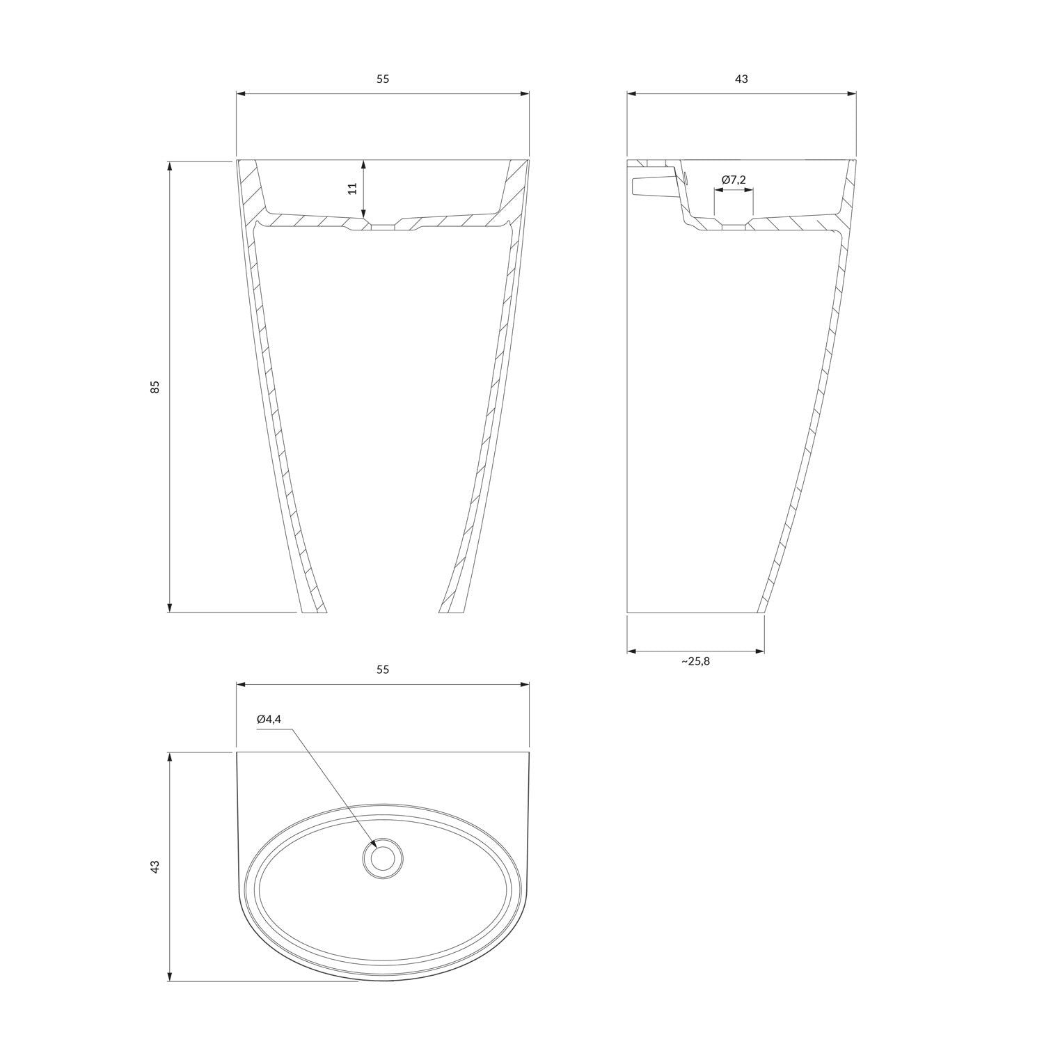 Das Siena Standwaschbecken mit den Maßen 55 x 43 x 85 cm benötigt für eine komfortable Nutzung und eine harmonische Raumwirkung mindestens 75 cm Breite und 65 cm Tiefe an freiem Platz.