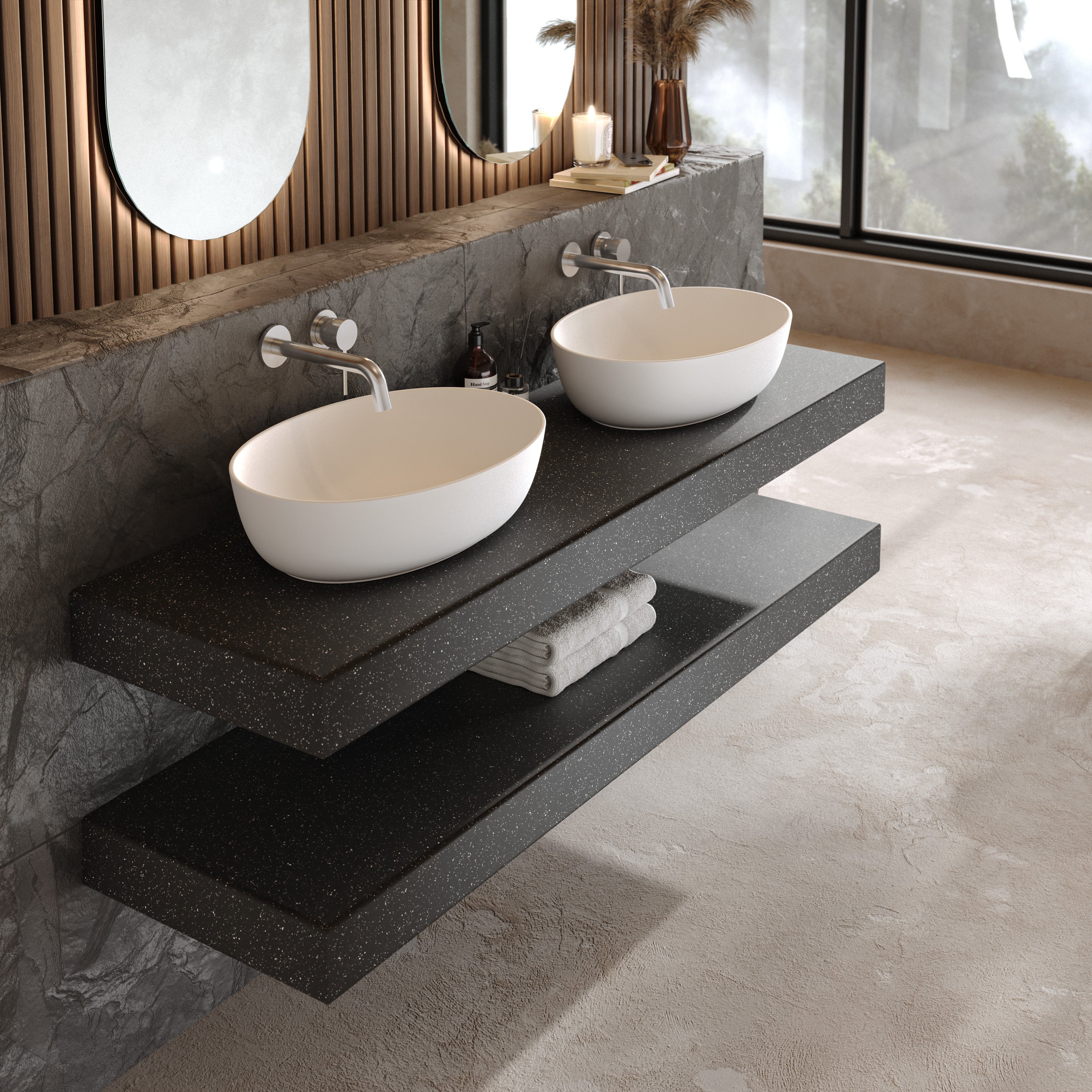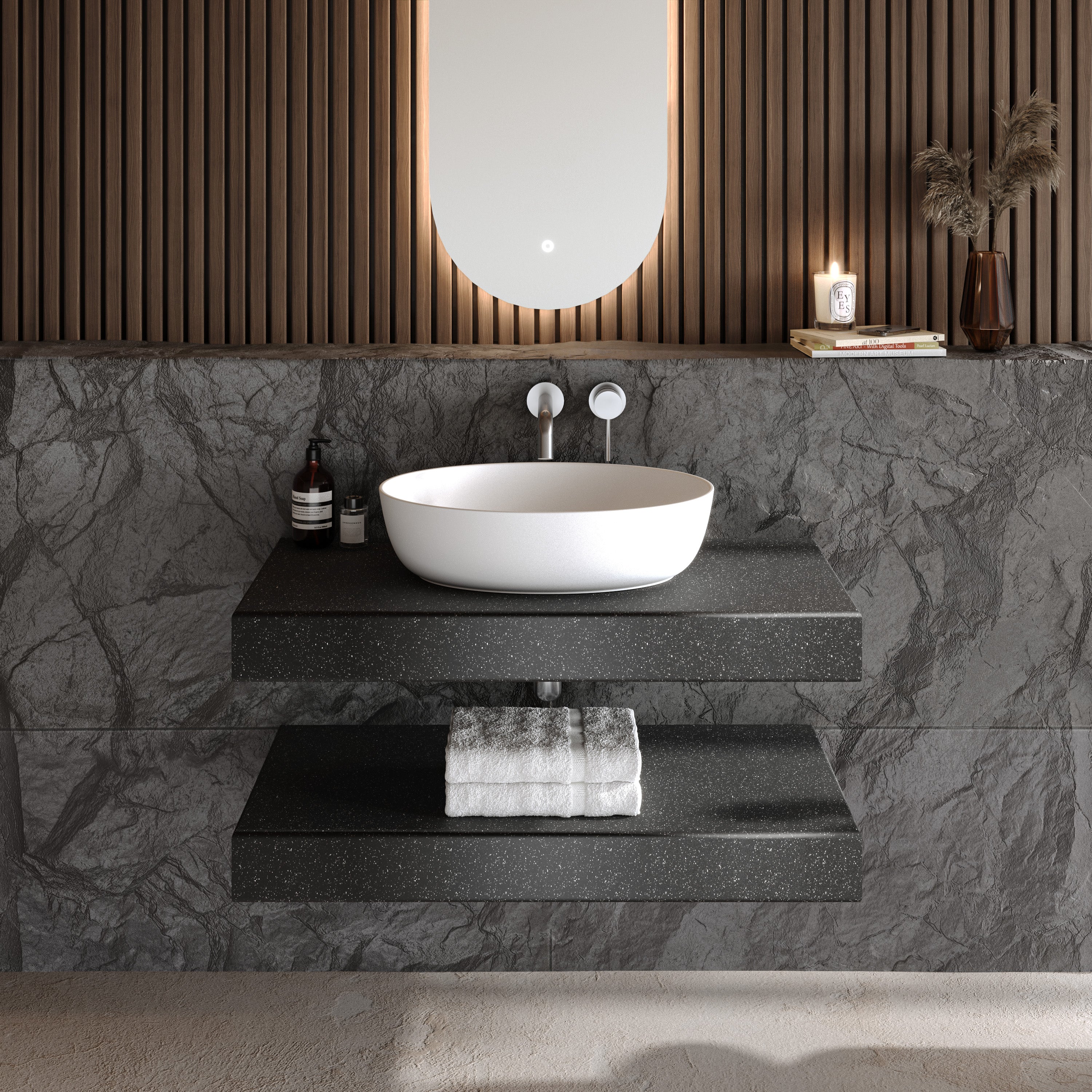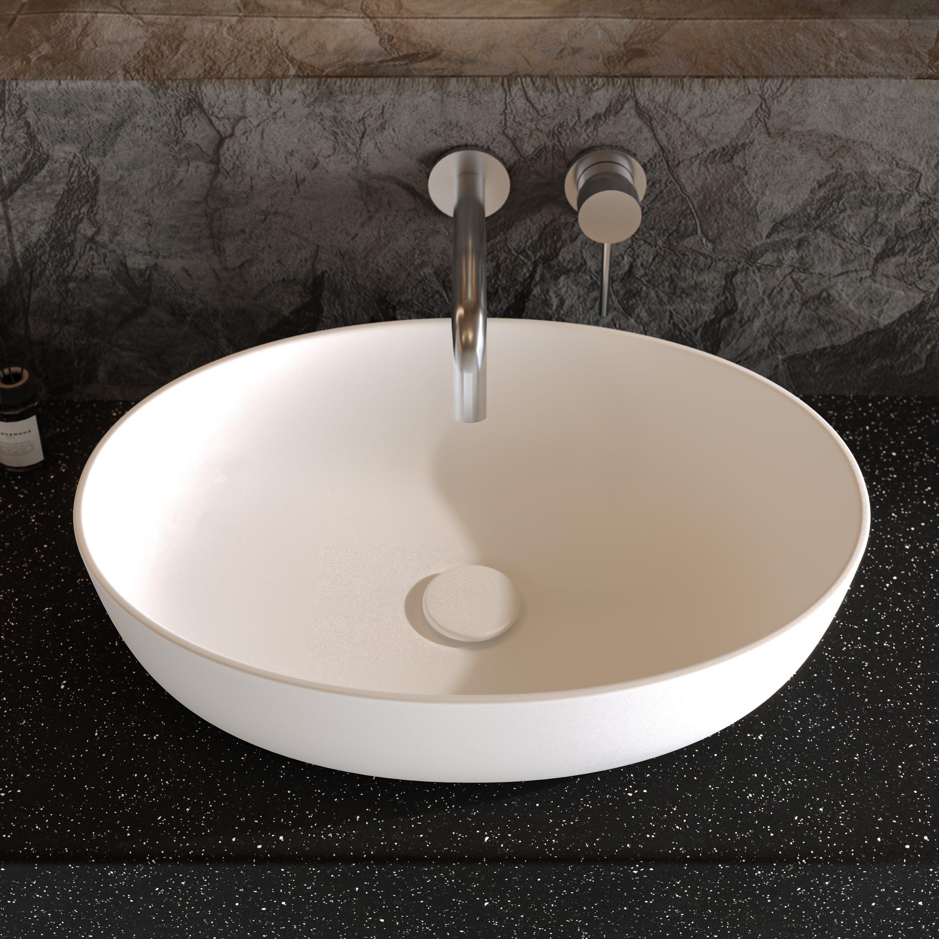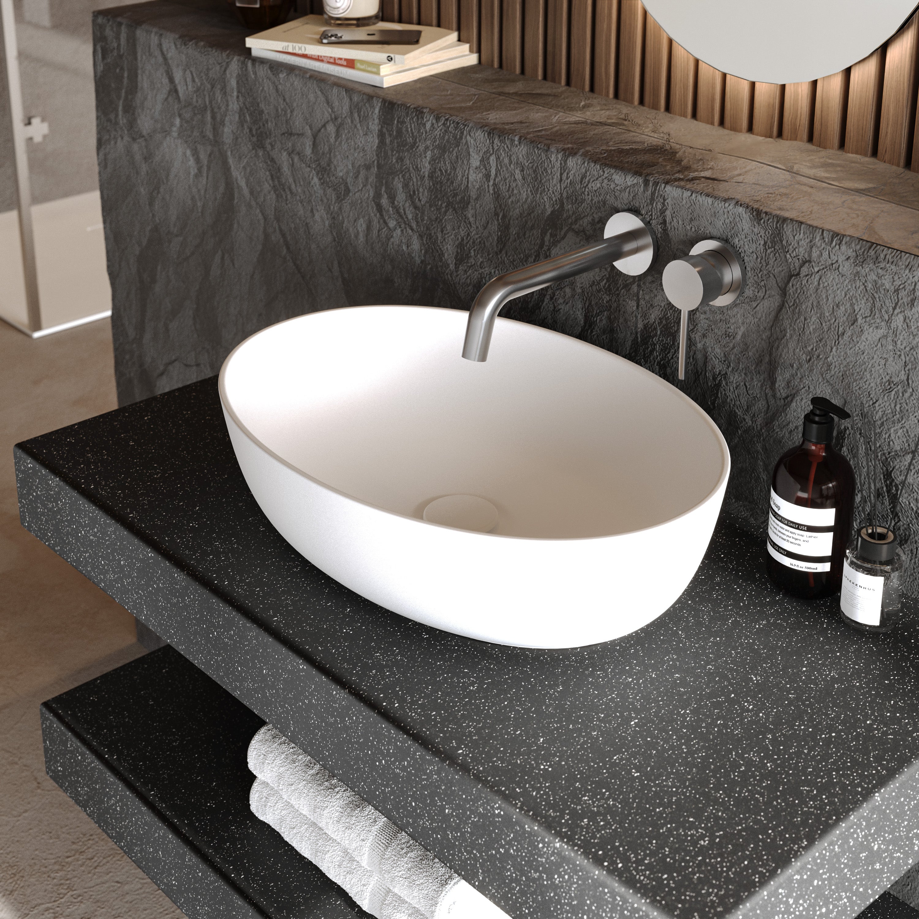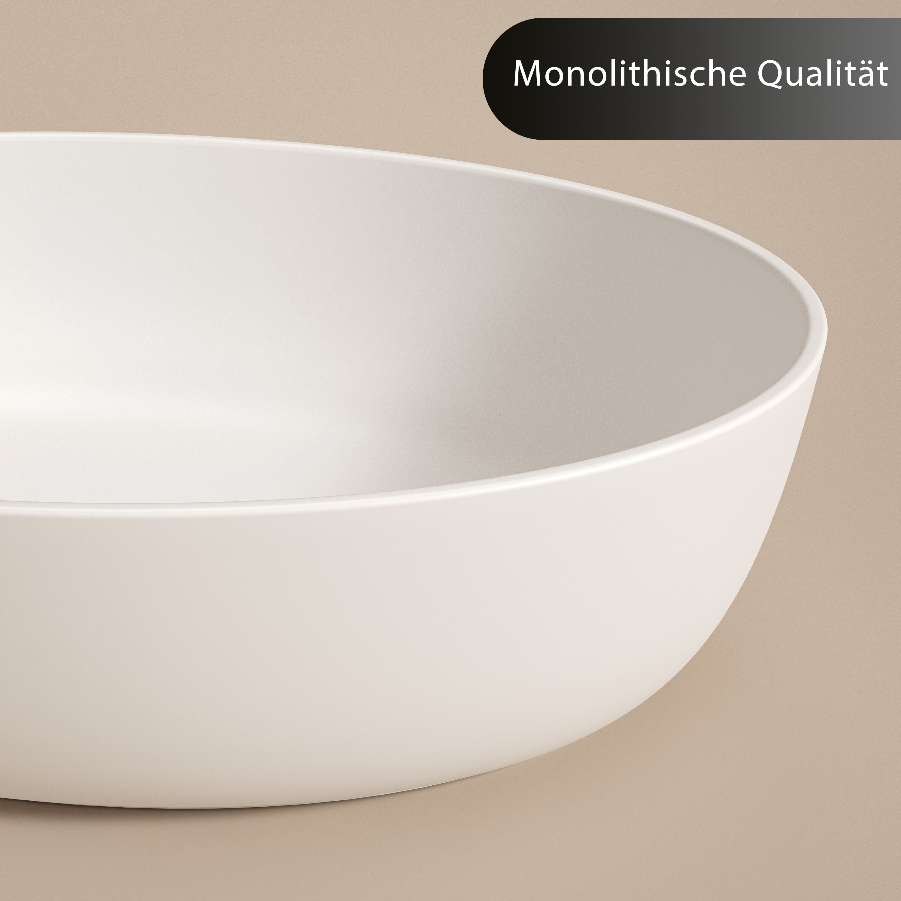 Jedes Aufsatzwaschbecken wird in präziser Handarbeit endgefertigt, um höchste Präzision an jedem Detail sicherzustellen. Nicht porös, kratzresistent und hitzebeständig – das massive Mineralwerkstoff bleibt auch bei täglicher Beanspruchung makellos und formstabil.