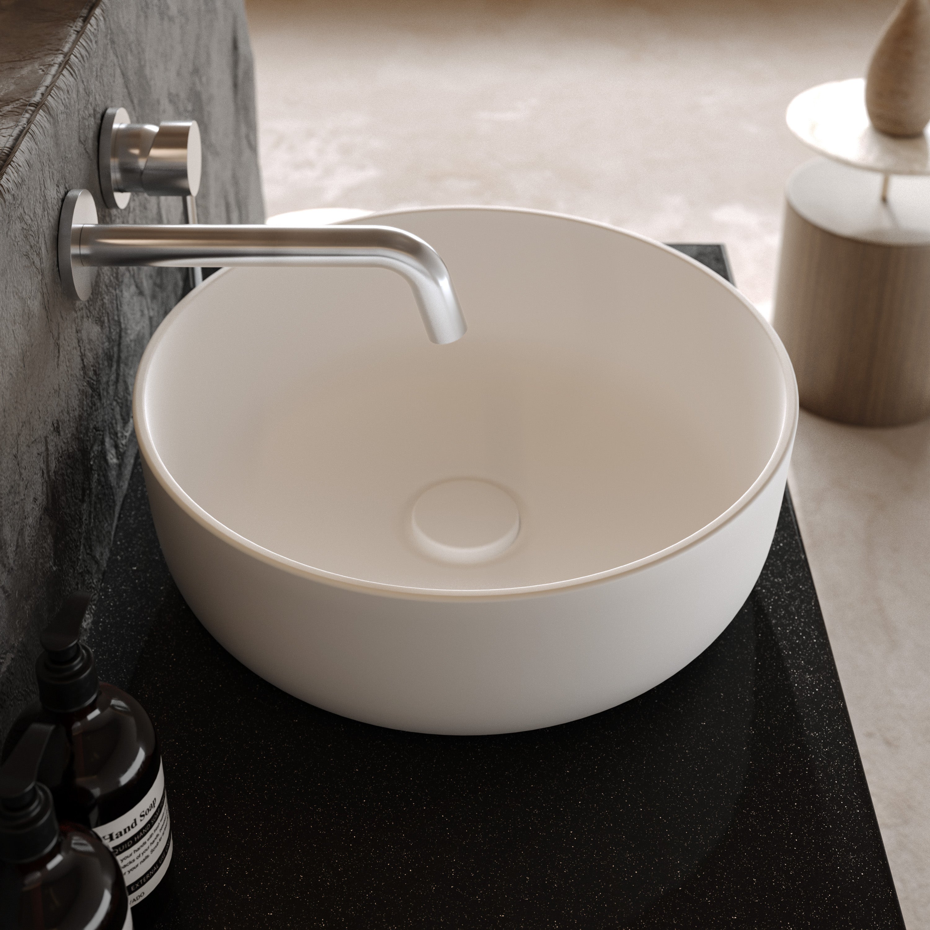 Das runde Aufsatzwaschbecken „Norea“ besticht durch sein harmonisches, fließendes Design. Gefertigt aus hochwertigem Solid Surface Mineralguss, verleihen seine sanften, gerundeten Konturen jedem modernen Badezimmer oder Gäste-WC eine elegante Ausstrahlung und machen es zu einem stilvollen Highlight.