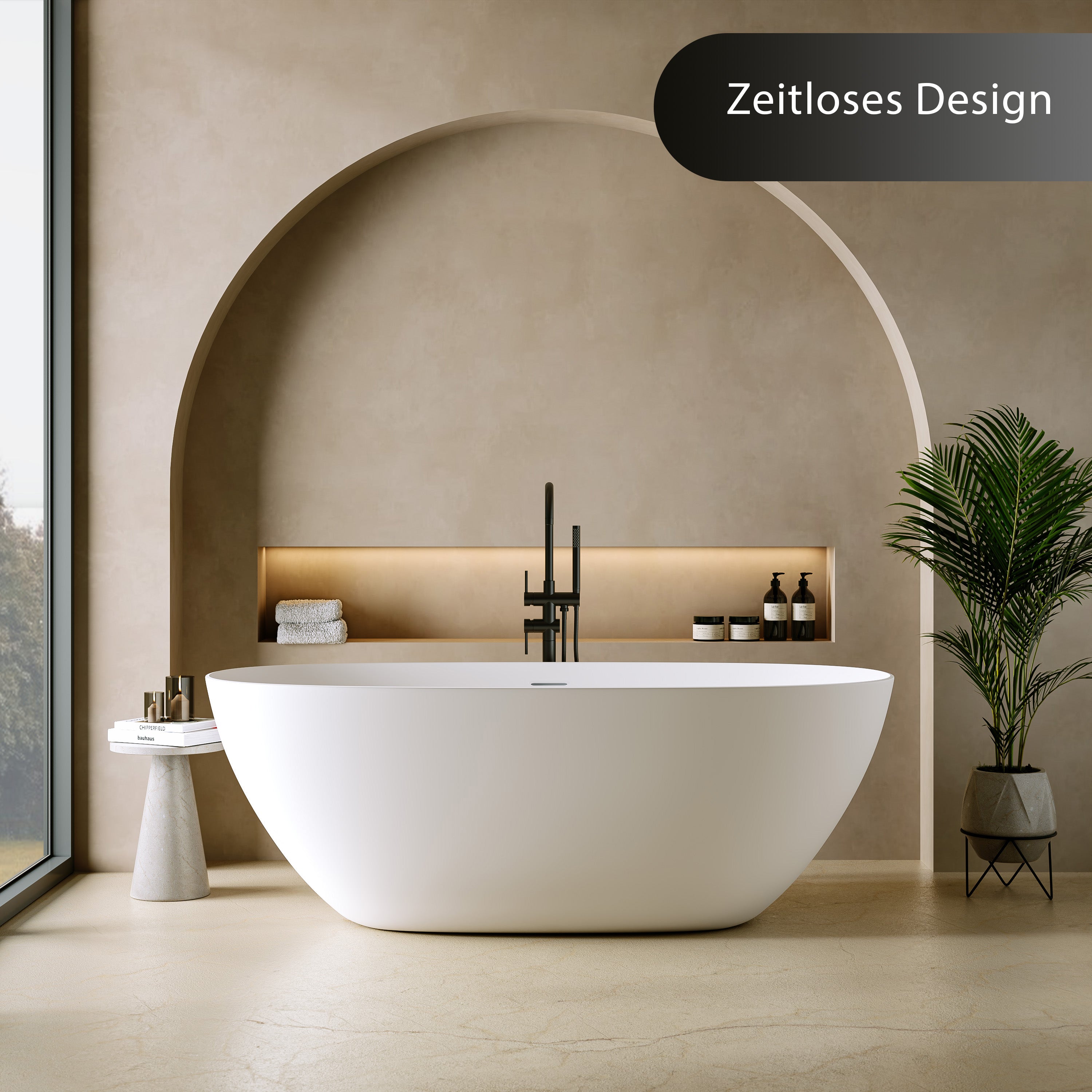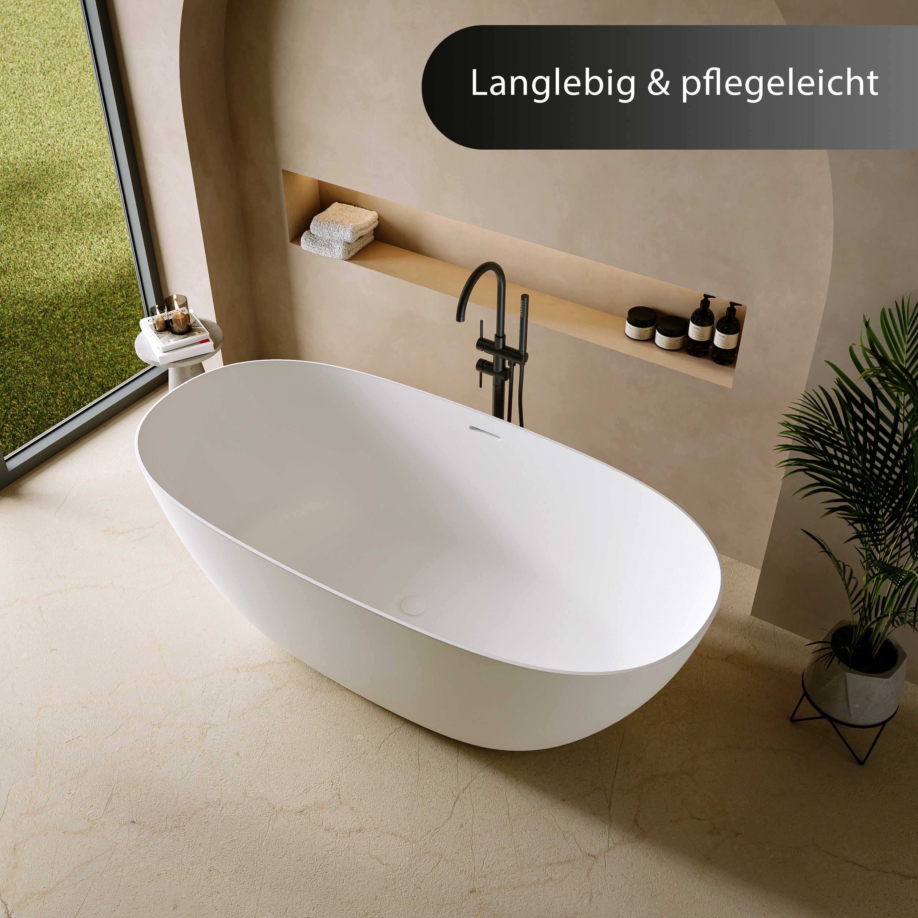 Die ovale Form mit sanfter Verjüngung zum Boden verleiht der freistehenden Badewanne eine elegante Leichtigkeit. Ein echtes Statement moderner Badarchitektur – stilvoll, harmonisch und formvollendet aus jedem Blickwinkel