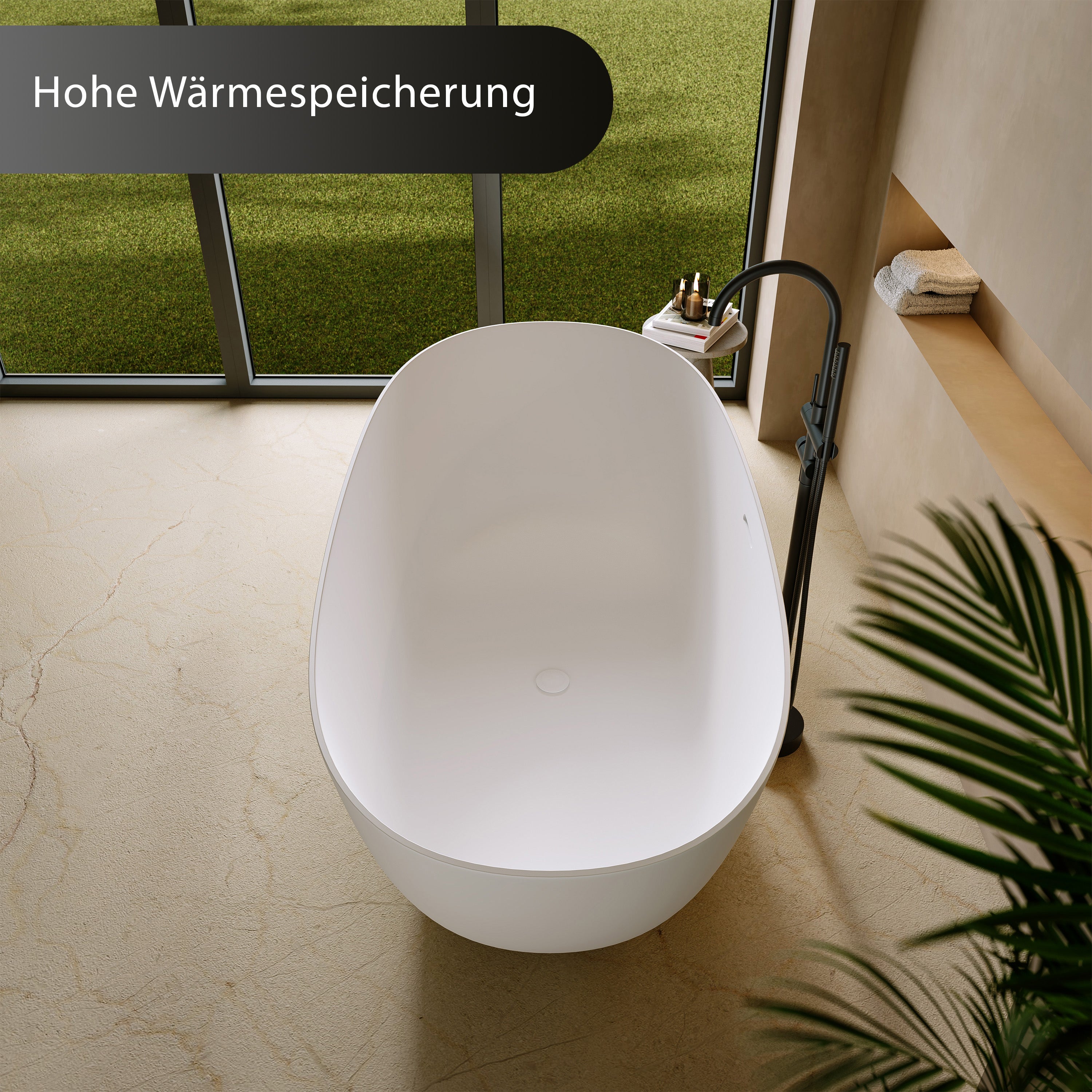Die Mineralguss-Badewanne speichert die Wärme des Wassers besonders effektiv. Das sorgt für langanhaltend angenehme Badetemperaturen und ein rundum entspanntes Badeerlebnis – auch bei längerer Nutzung.