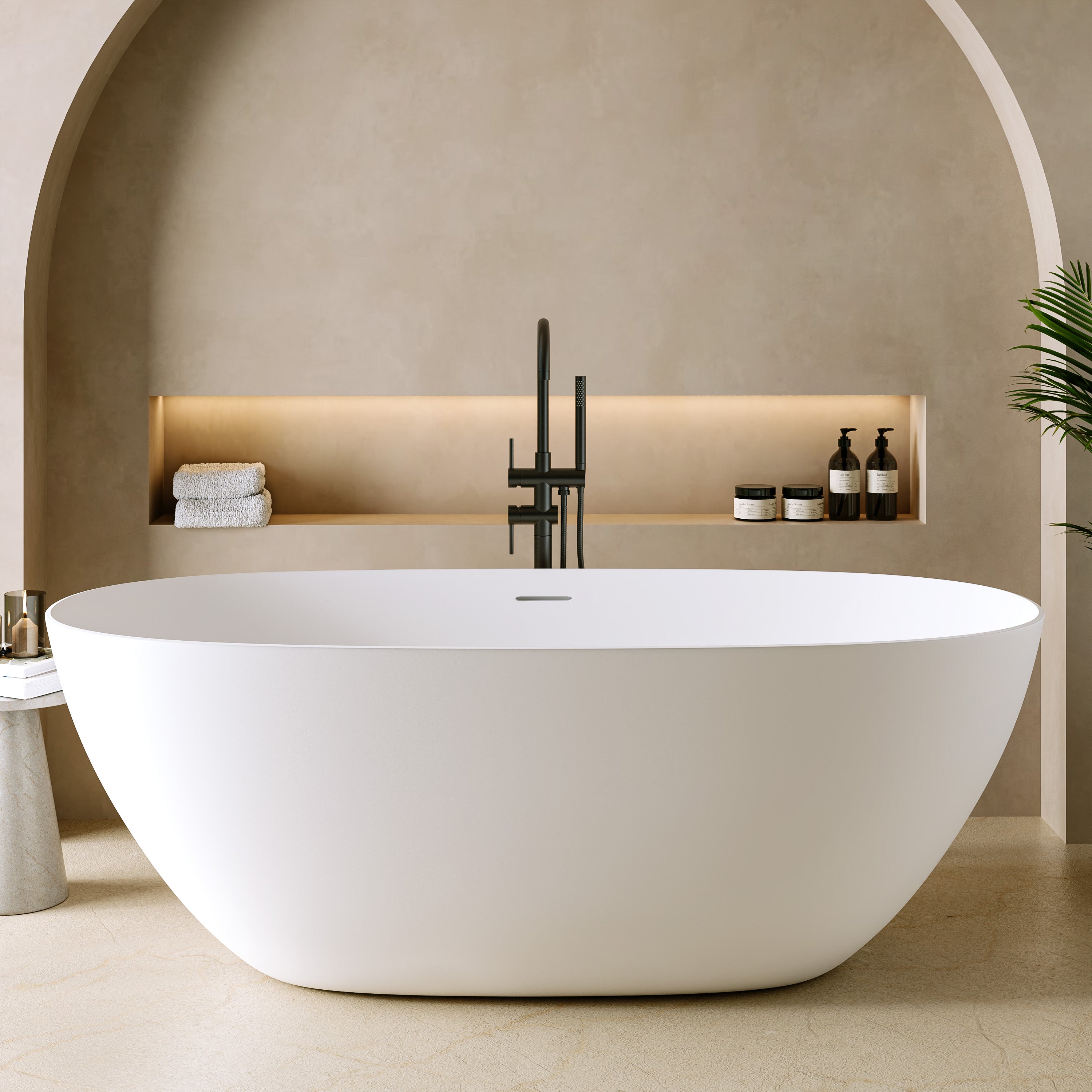 Die „Capri“ Badewanne überzeugt durch ihr weich geschwungenes, ovales Design, das sich harmonisch zum Boden hin verjüngt und eine zeitlose Leichtigkeit ausstrahlt. Ihr fließendes, symmetrisches Design wird zum Blickfang in jedem modernen Badezimmer