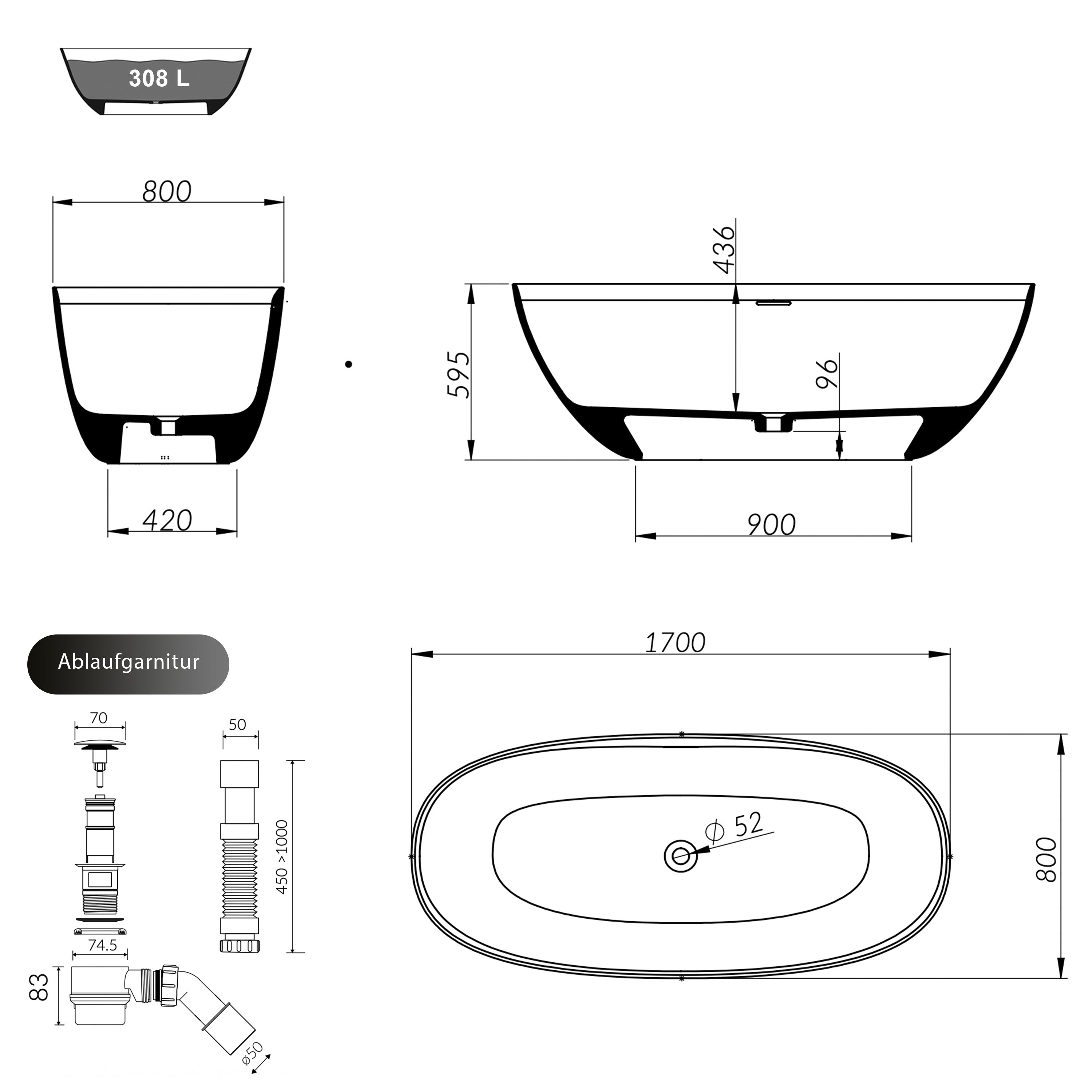 Dolvhin® Freistehende Badewanne aus Mineralguss "Capri" | Oval | 170x80x59 cm