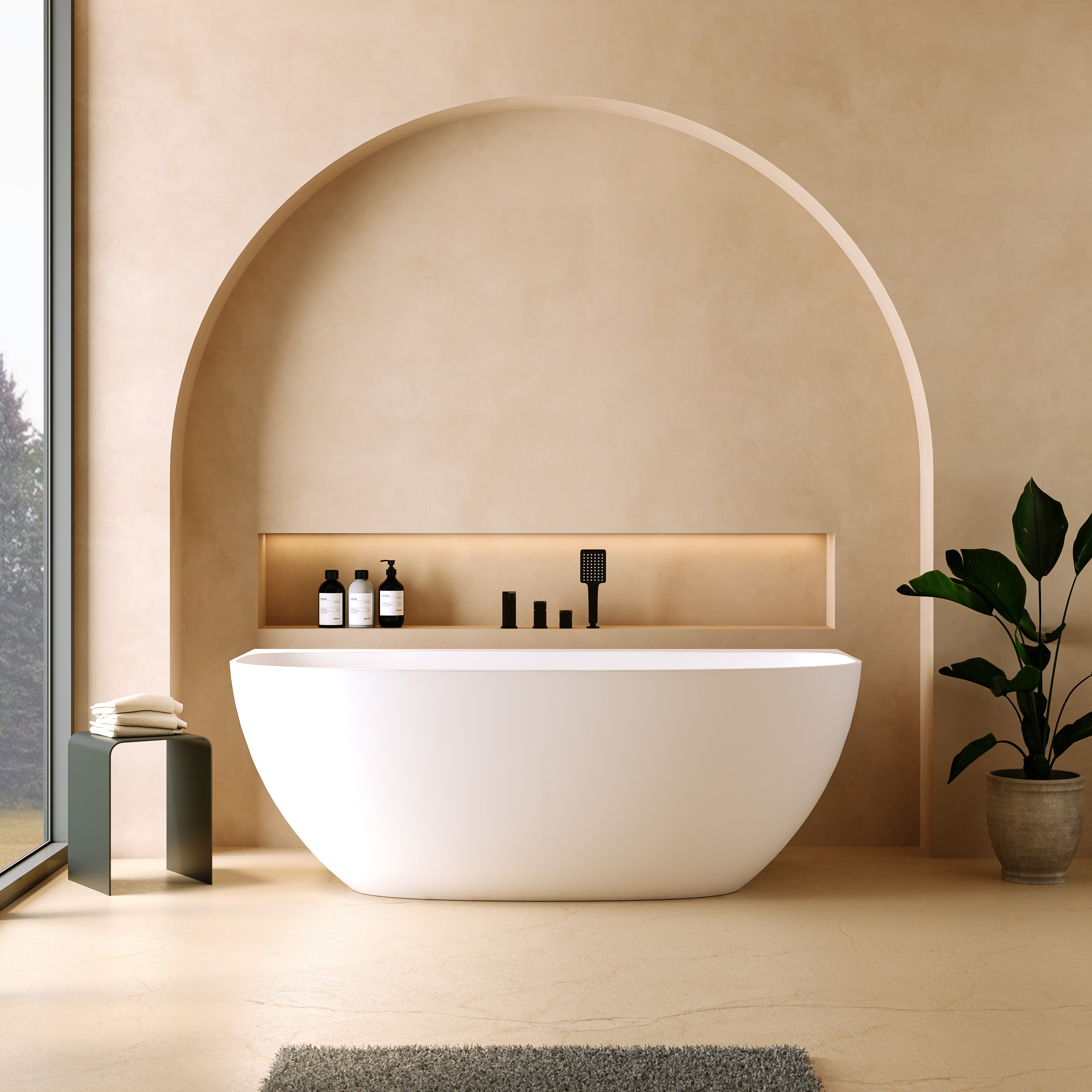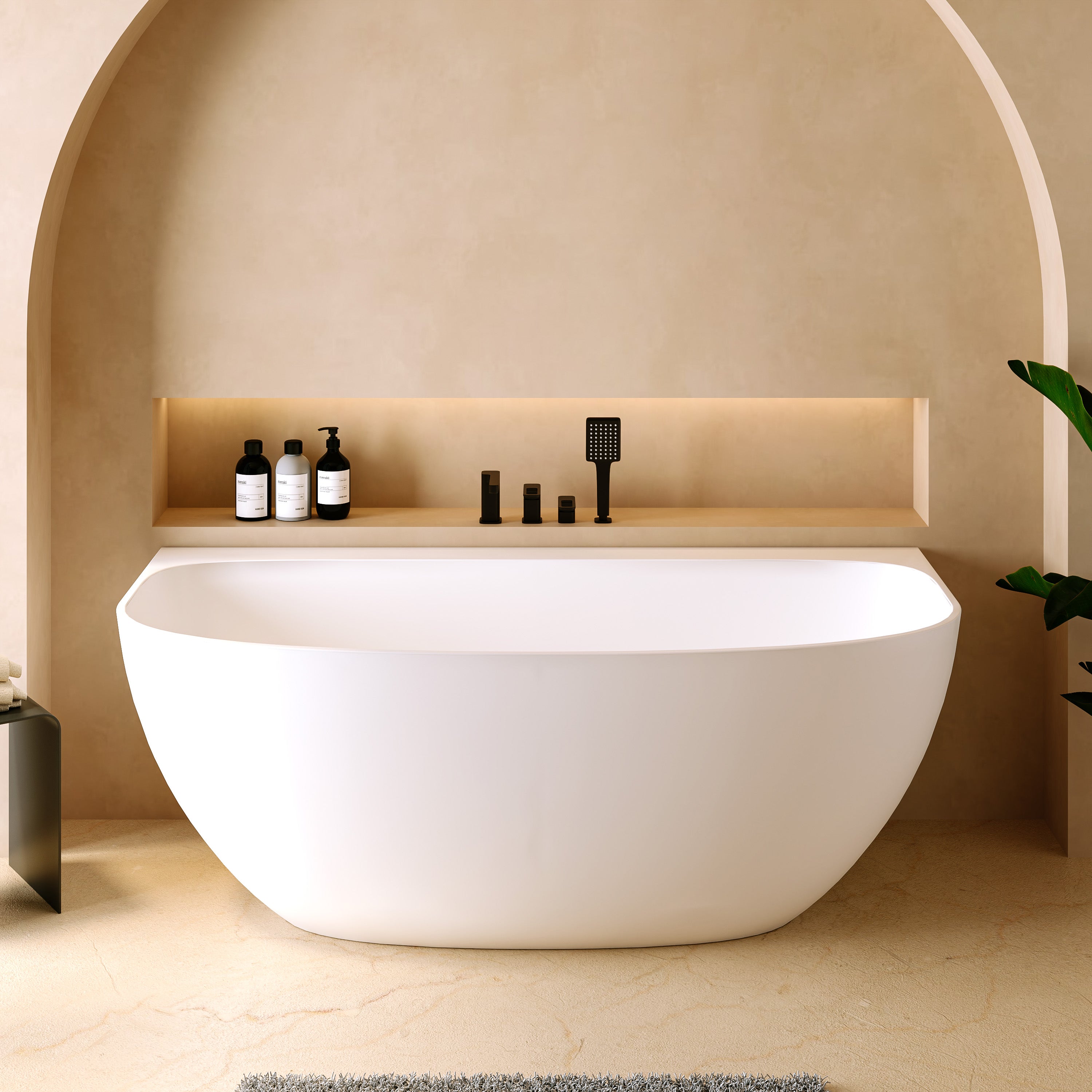 Die „Tahaa“ ist eine halb freistehende Mineralguss-Badewanne, die sich harmonisch an die Wand anschmiegt und dennoch wie ein eigenständiges Designstück wirkt. Die sanft gerundete Vorderseite, die klare Linienführung und die ruhige, moderne Form verleihen jedem Bad eine warme, ausgewogene Ästhetik. Die großzügige Innenform bietet viel Platz und unterstützt eine komfortable Liegeposition.
