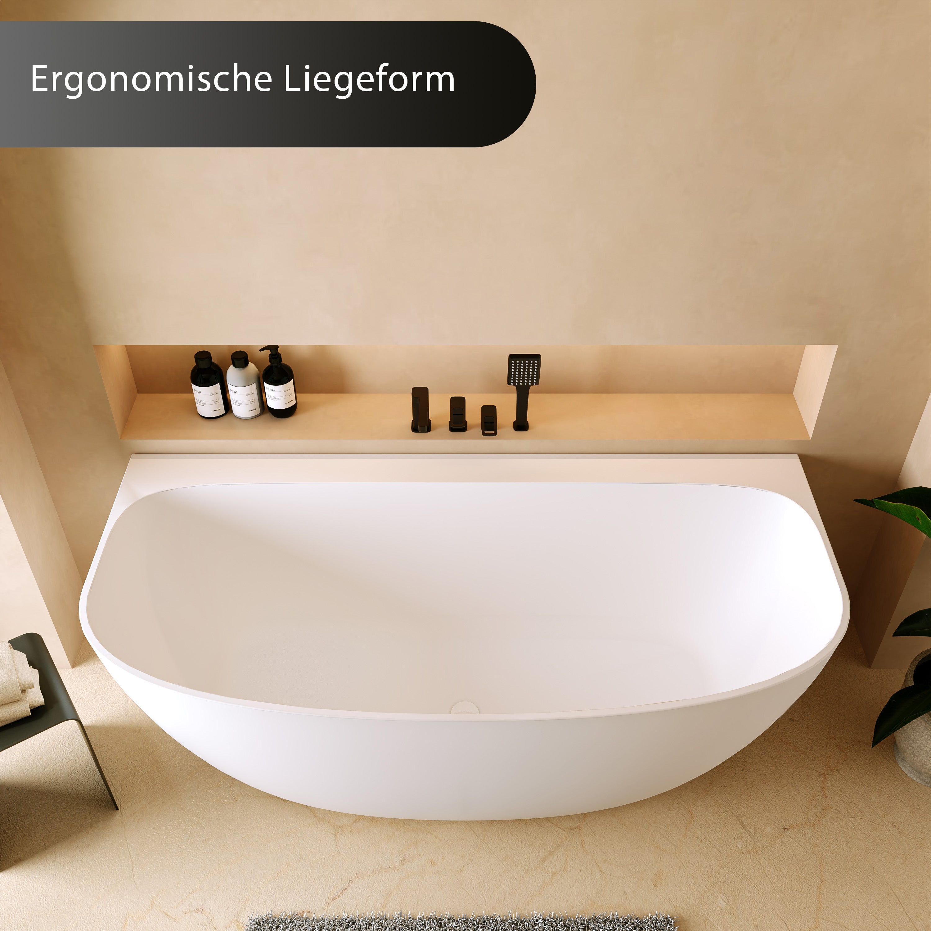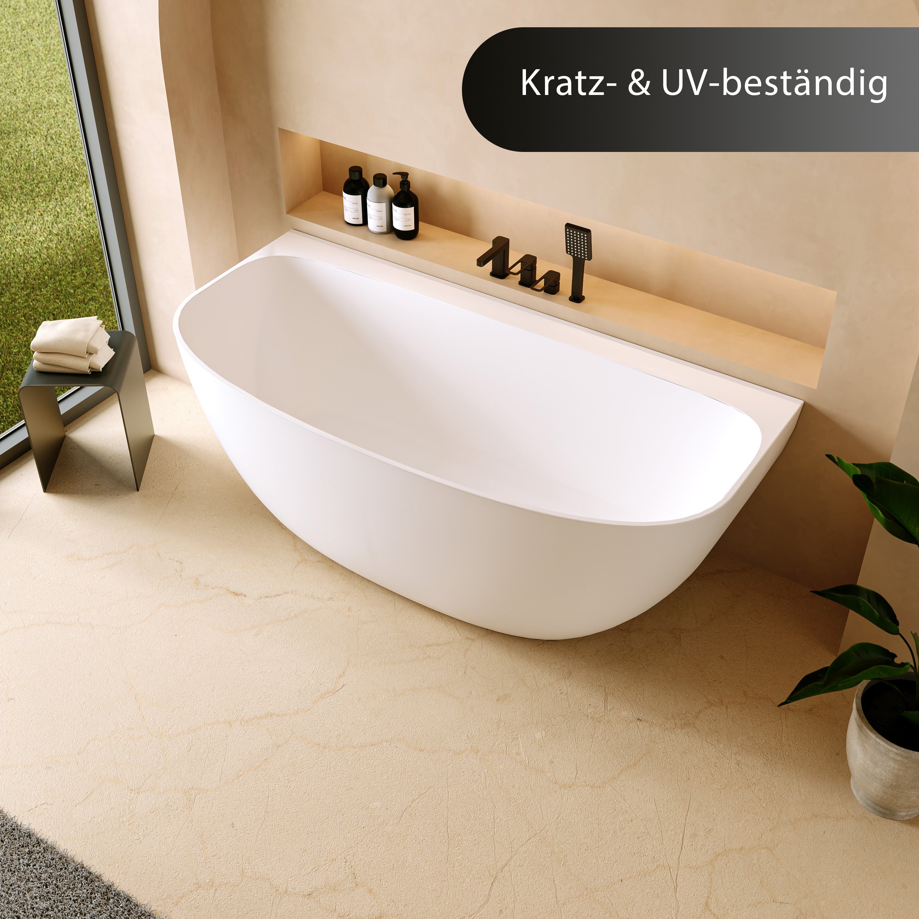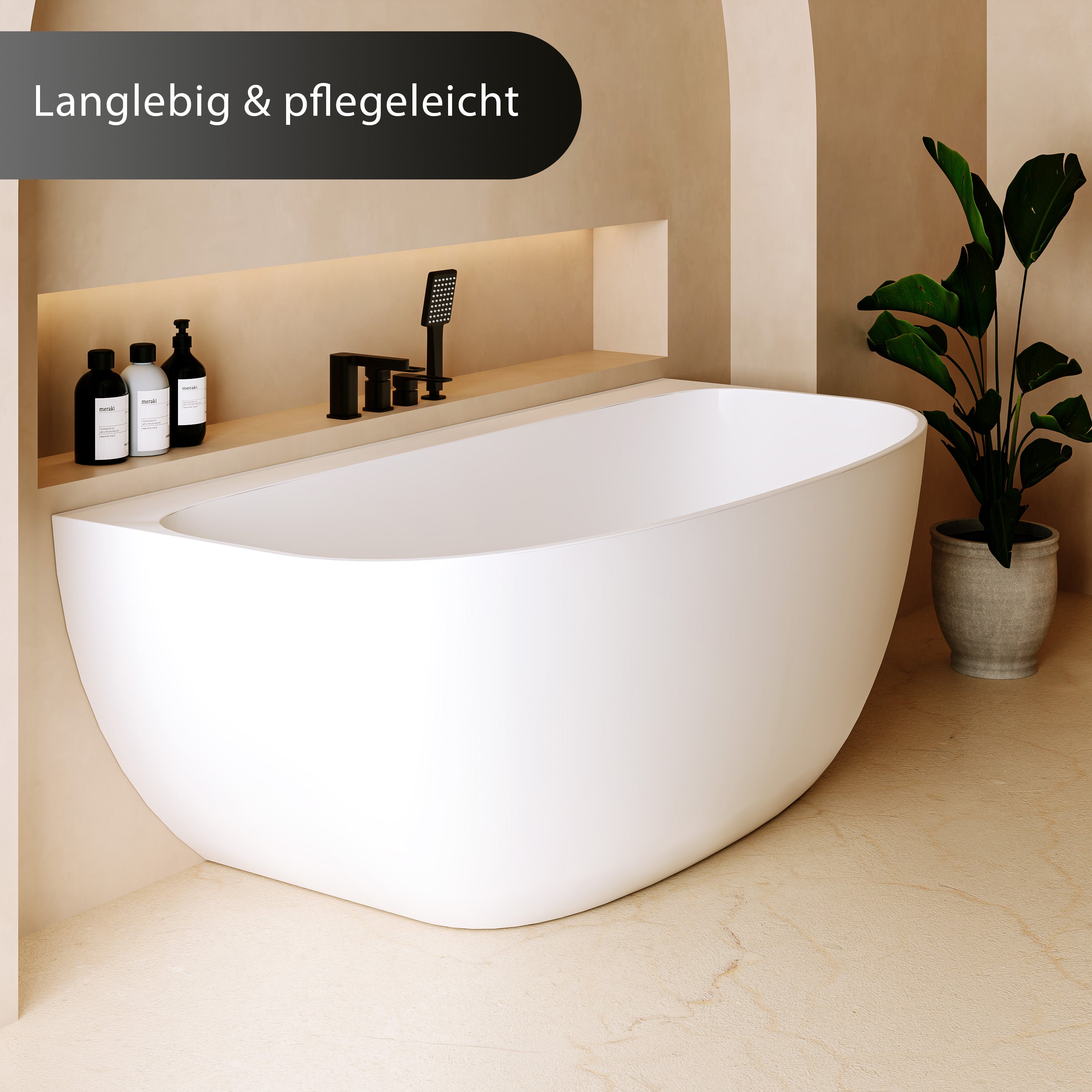 Dank des massiven Mineralguss-Materials ist die Badewanne besonders robust, dauerhaft formstabil und für eine lange Nutzungsdauer ausgelegt – auch bei täglichem Gebrauch.