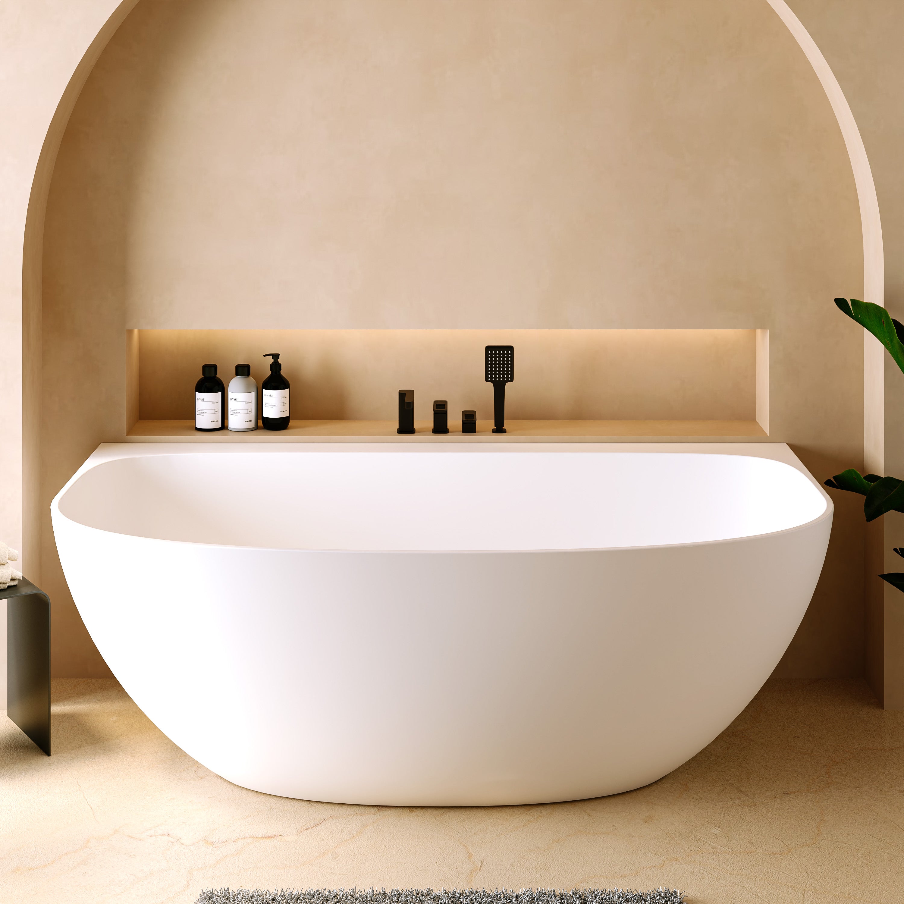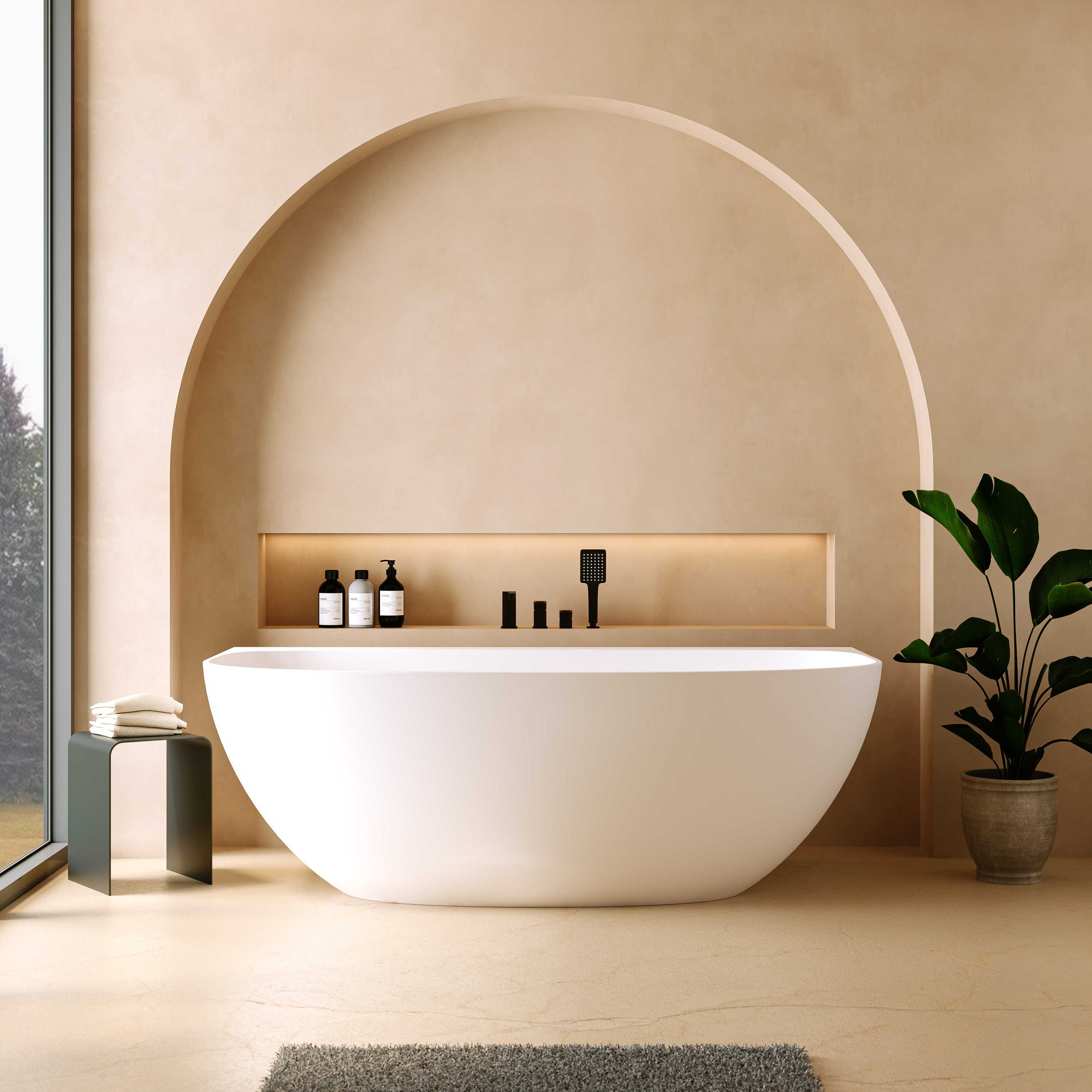 Die „Tahaa“ ist eine halb freistehende Mineralguss-Badewanne, die sich harmonisch an die Wand anschmiegt und dennoch wie ein eigenständiges Designstück wirkt. Die sanft gerundete Vorderseite, die klare Linienführung und die ruhige, moderne Form verleihen jedem Bad eine warme, ausgewogene Ästhetik. Die großzügige Innenform bietet viel Platz und unterstützt eine komfortable Liegeposition.